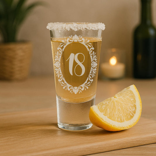 Personalised Birthday Shot Glass | Custom Age - Regal Bloom Frame | Milestone Birthday Gift | Custom Engraved Keepsake for 18th Birthday