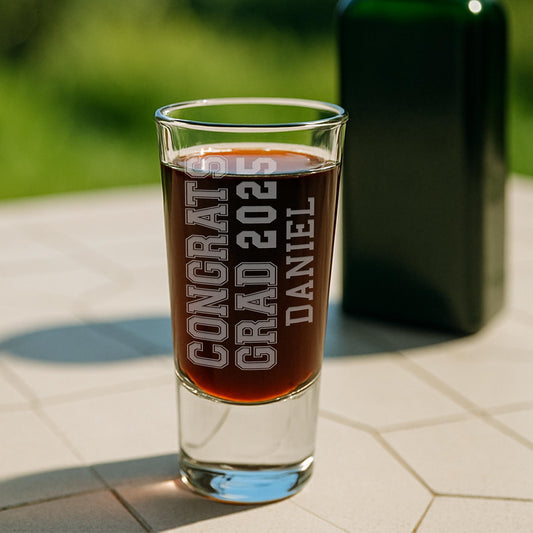 Personalised Graduation Gift | Congrats Grad - College Varsity Font Shot Glass | Custom Engraved Name & Year | Class of Graduation Gift