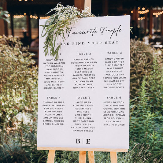 Personalised Wedding Seating Plan Sign | Our Favourite People Table Chart Print for 512 Tables | Modern Black & White Wedding Decor