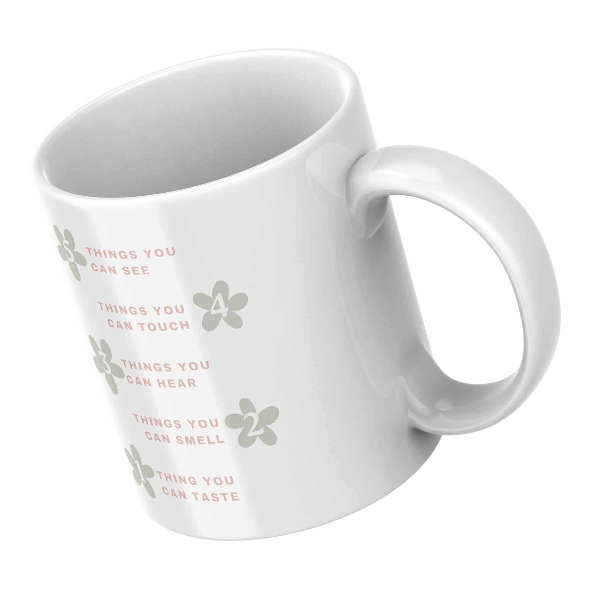 Introducing the Anxie-Tea Mug, a ceramic companion designed to offer comfort and help you stay grounded during stressful times. The mug features a calming phrase on the front and a 5-step countdown technique on the back to aid in moments of anxiety. Made from high-quality ceramic, it is dishwasher and microwave safe. Embrace tranquility with each sip and promote inner peace with this thoughtful gift.