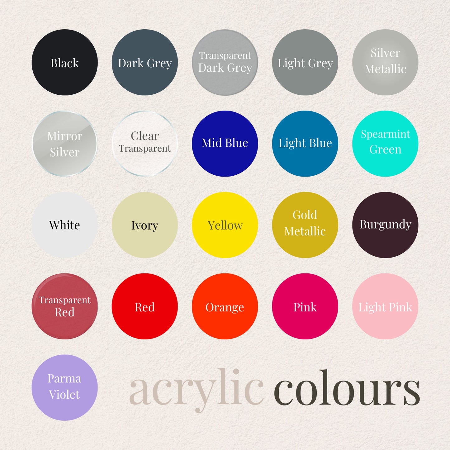 Each acrylic colour has a different colour where it is engraved. The engraved colour can range from dark grey to white (burgundy comes out pink).
