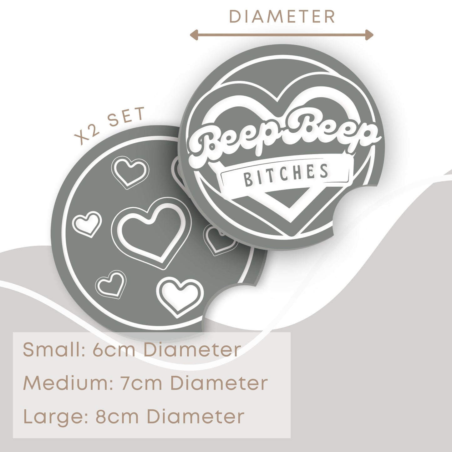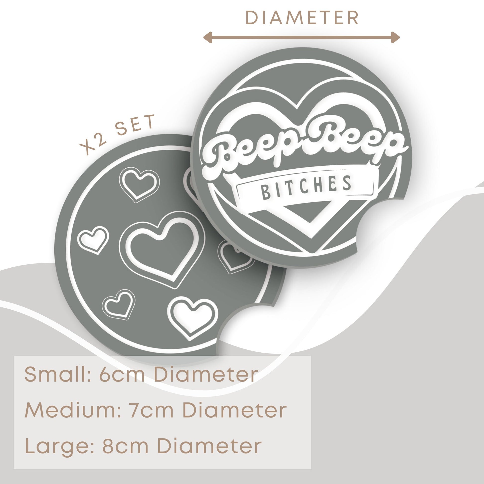 Hit the road with our amazing Car Coaster Set. This set includes two stylish and functional acrylic coasters that not only protect your cup holders but also add a touch of personality to your vehicle. Make a statement with this bold and fun coaster featuring the sassy phrase ‘Beep Beep B*tches.‘ Let your sense of humour shine as you hit the road with confidence and style.