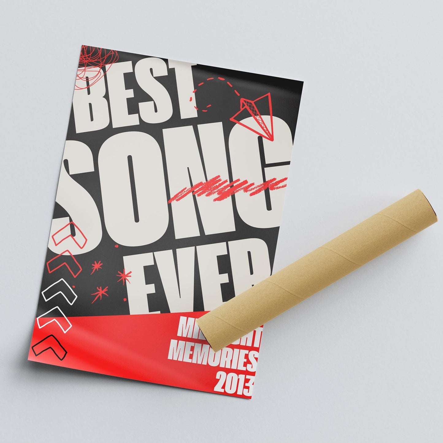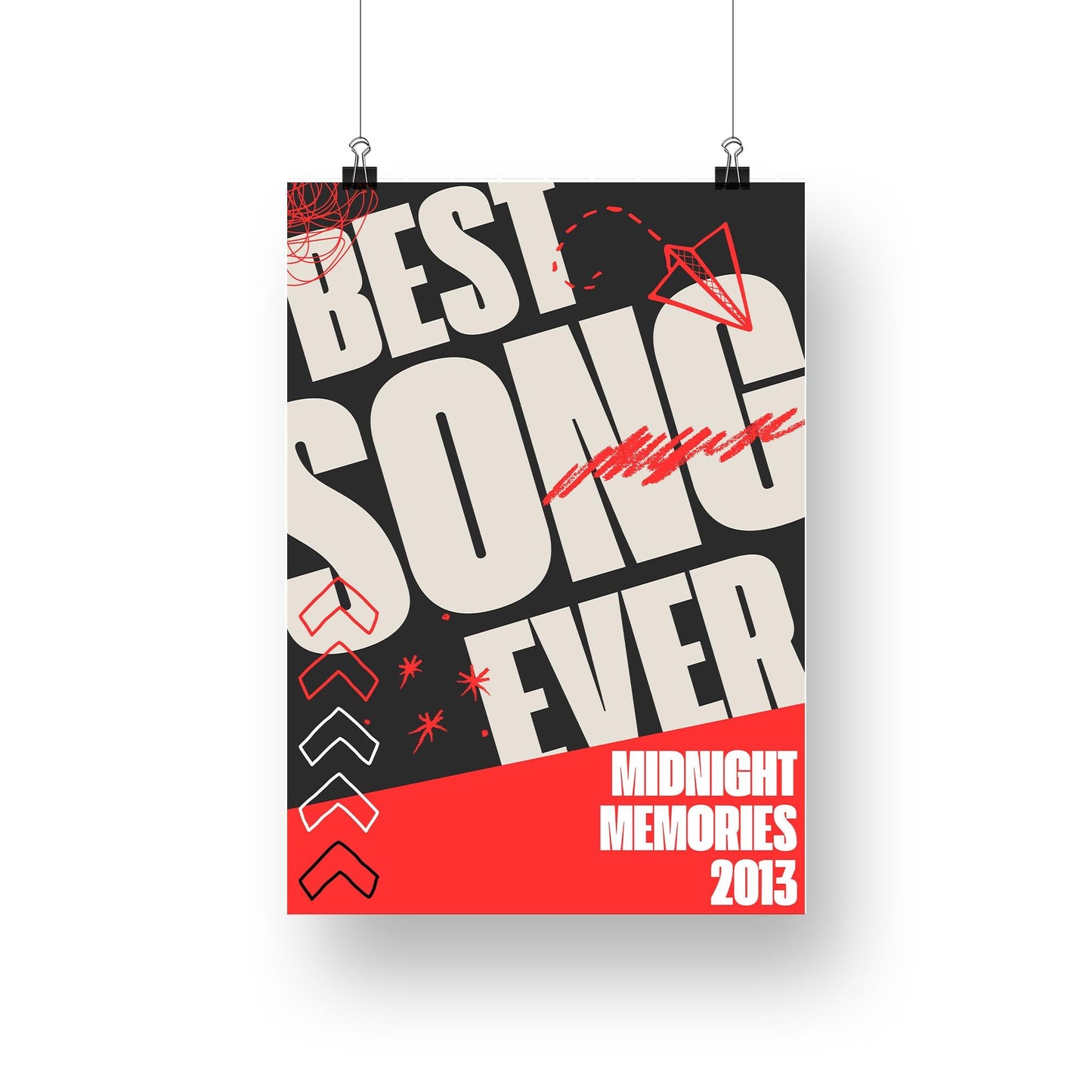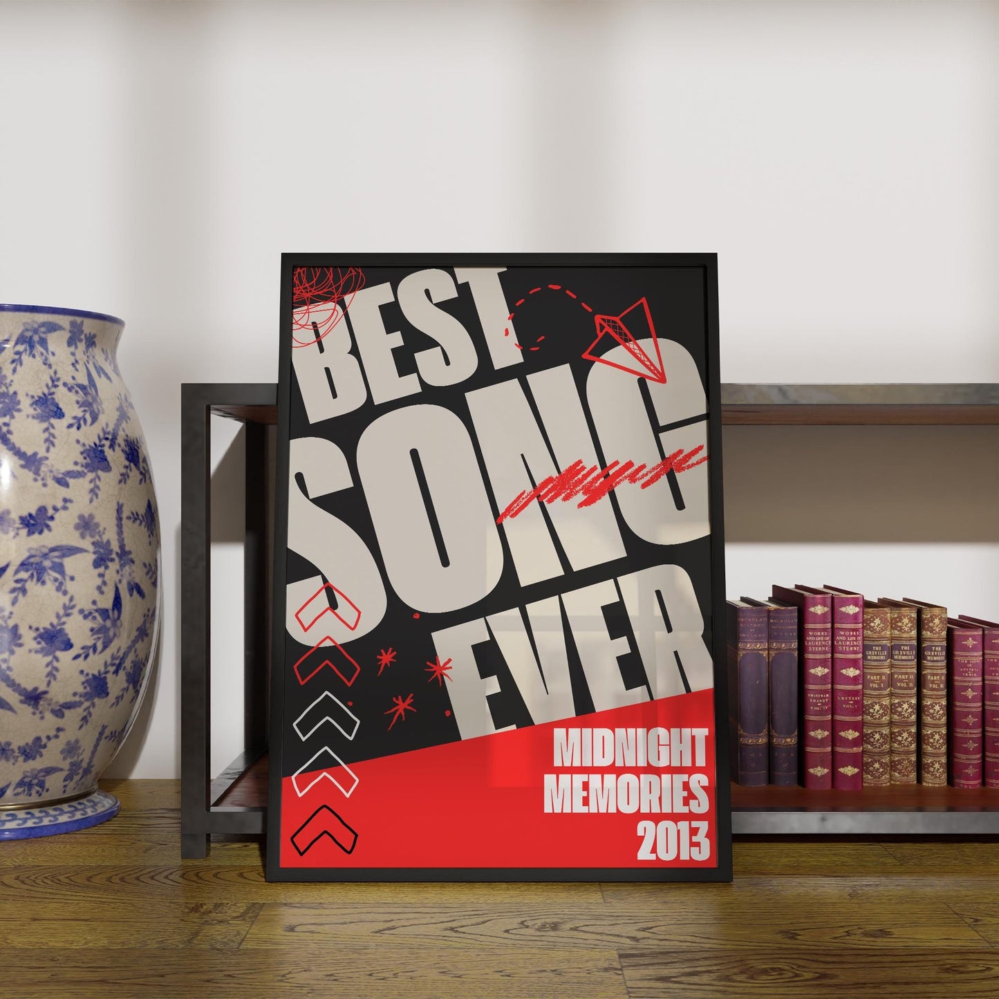 Relive the excitement of One Directions iconic anthem with this "Best Song Ever" lyric poster! Featuring the unforgettable lyrics and playful spirit of one of the bands biggest hits, this art print is a must-have for any Directioner. The design captures the energy and fun of the song, making it a perfect addition to your bedroom, music room, or gallery wall. With a sleek, modern aesthetic and a nod to nostalgia, this poster is sure to brighten up any space and make a statement.