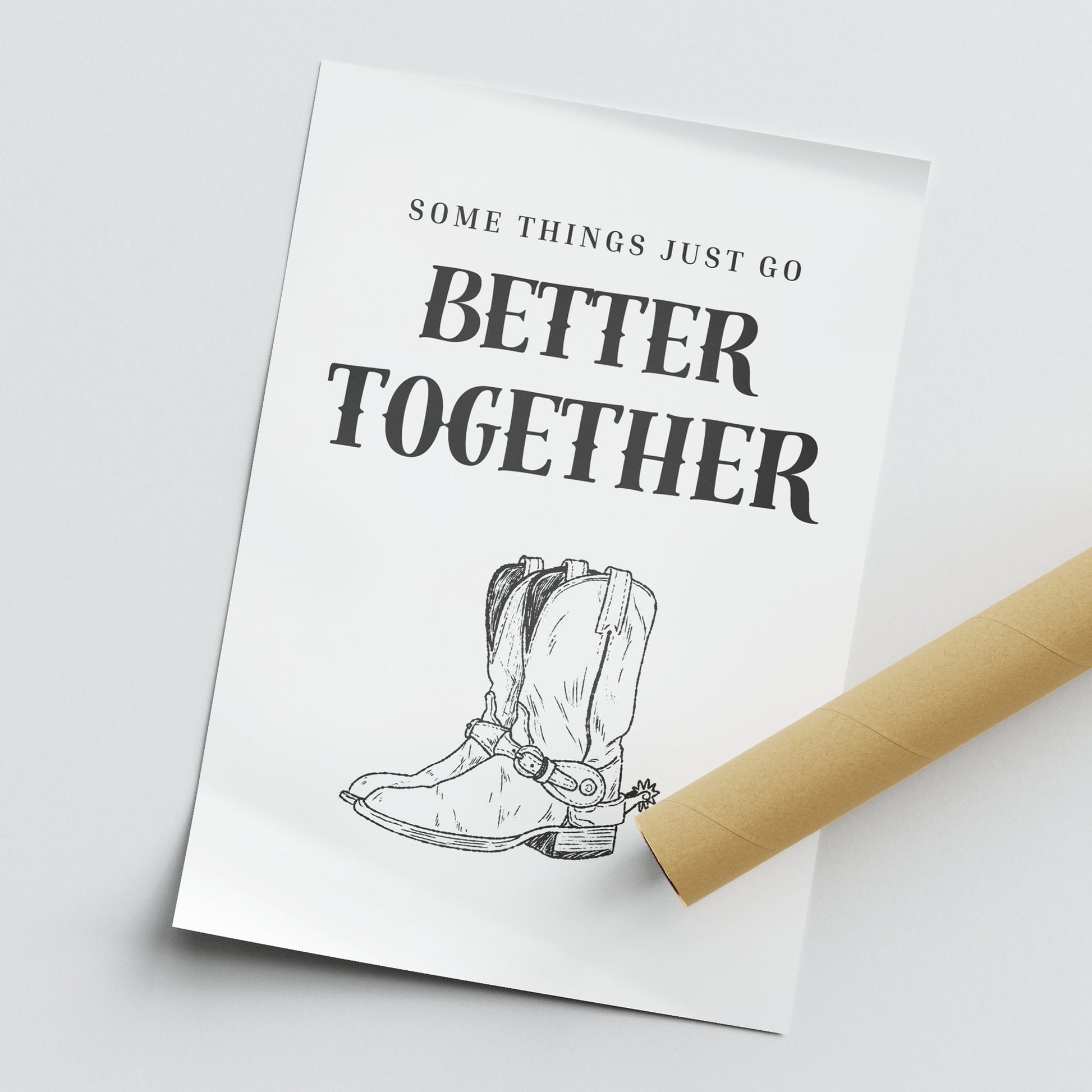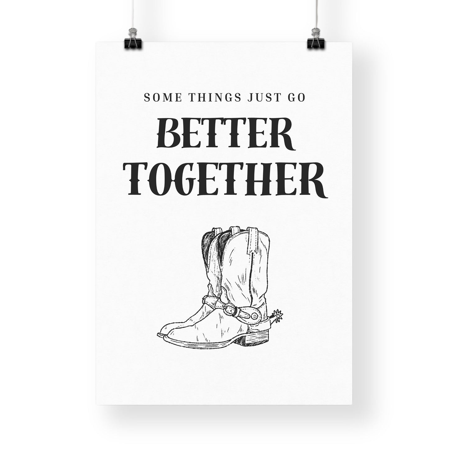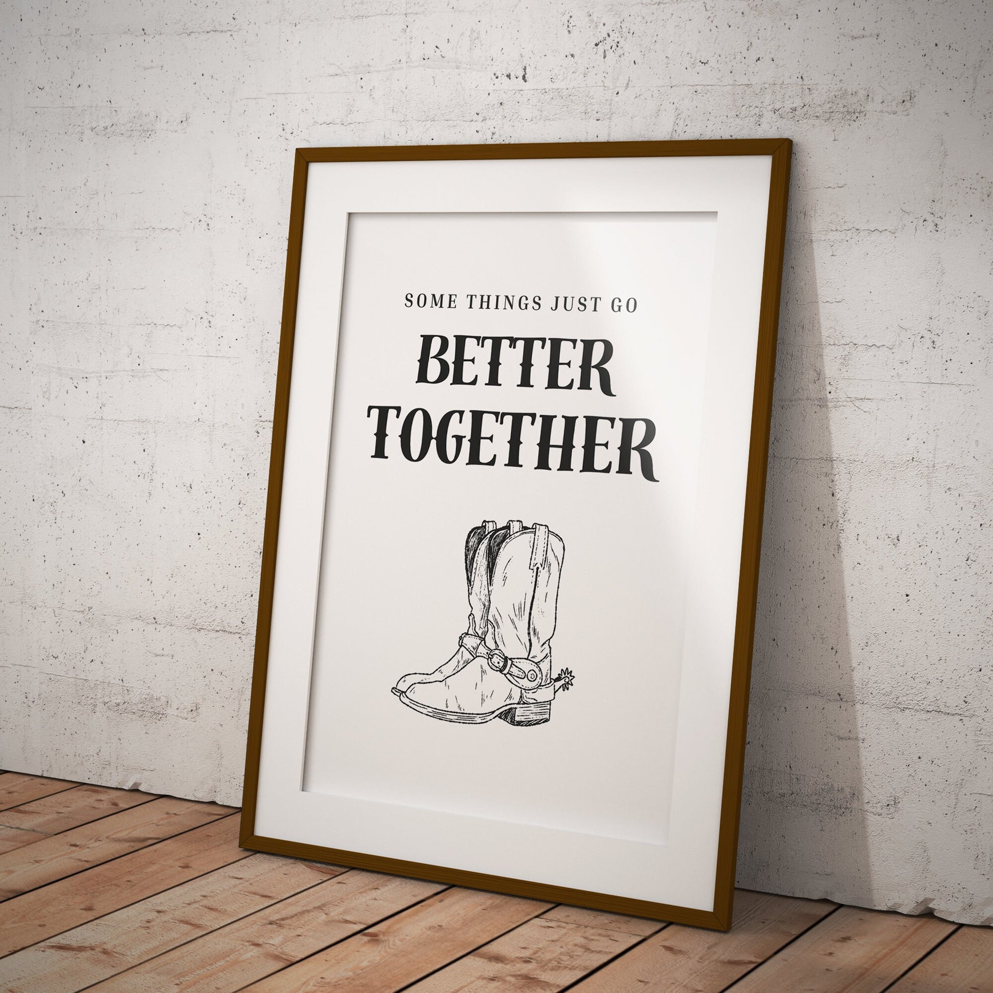 Celebrate the beautiful harmony of love and togetherness with our "Some Things Just Go Better Together" quote poster, inspired by the heartfelt lyrics of Luke Combs. This charming and rustic country-style poster is perfect for adding a touch of romance and warmth to your home. Ideal for couples, music lovers, and fans country fans, this wall art piece makes a thoughtful gift or a beautiful addition to any space.