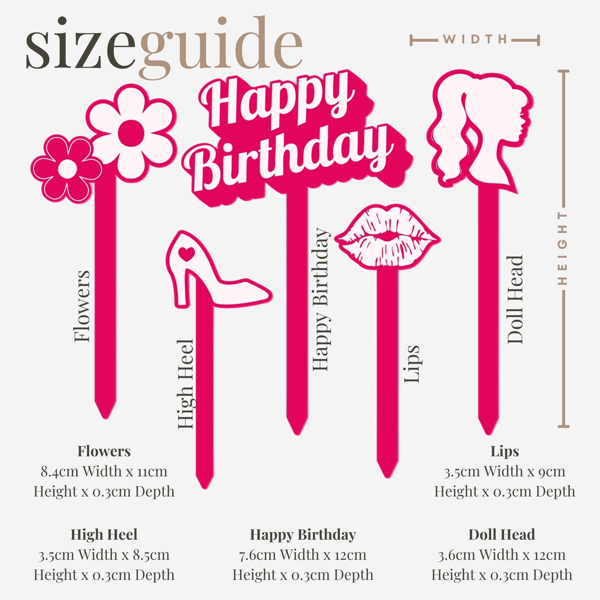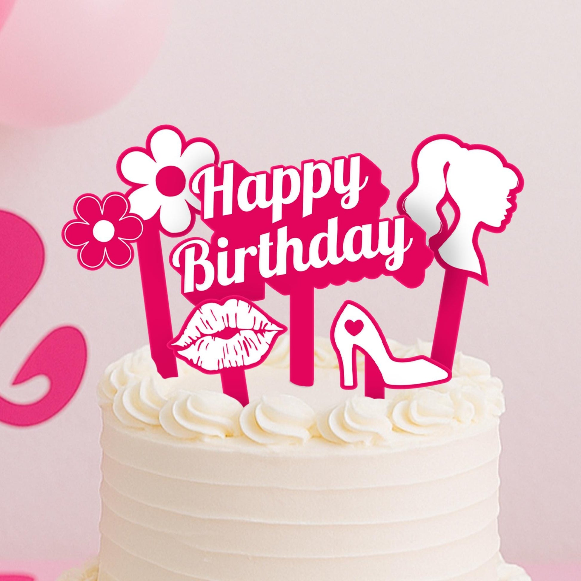 • Complete 5-Piece Set – Includes: 1 x "Happy Birthday" topper, 1 x double flower topper, 1 x doll head silhouette topper, 1 x high heel topper, and 1 x lips topper.
