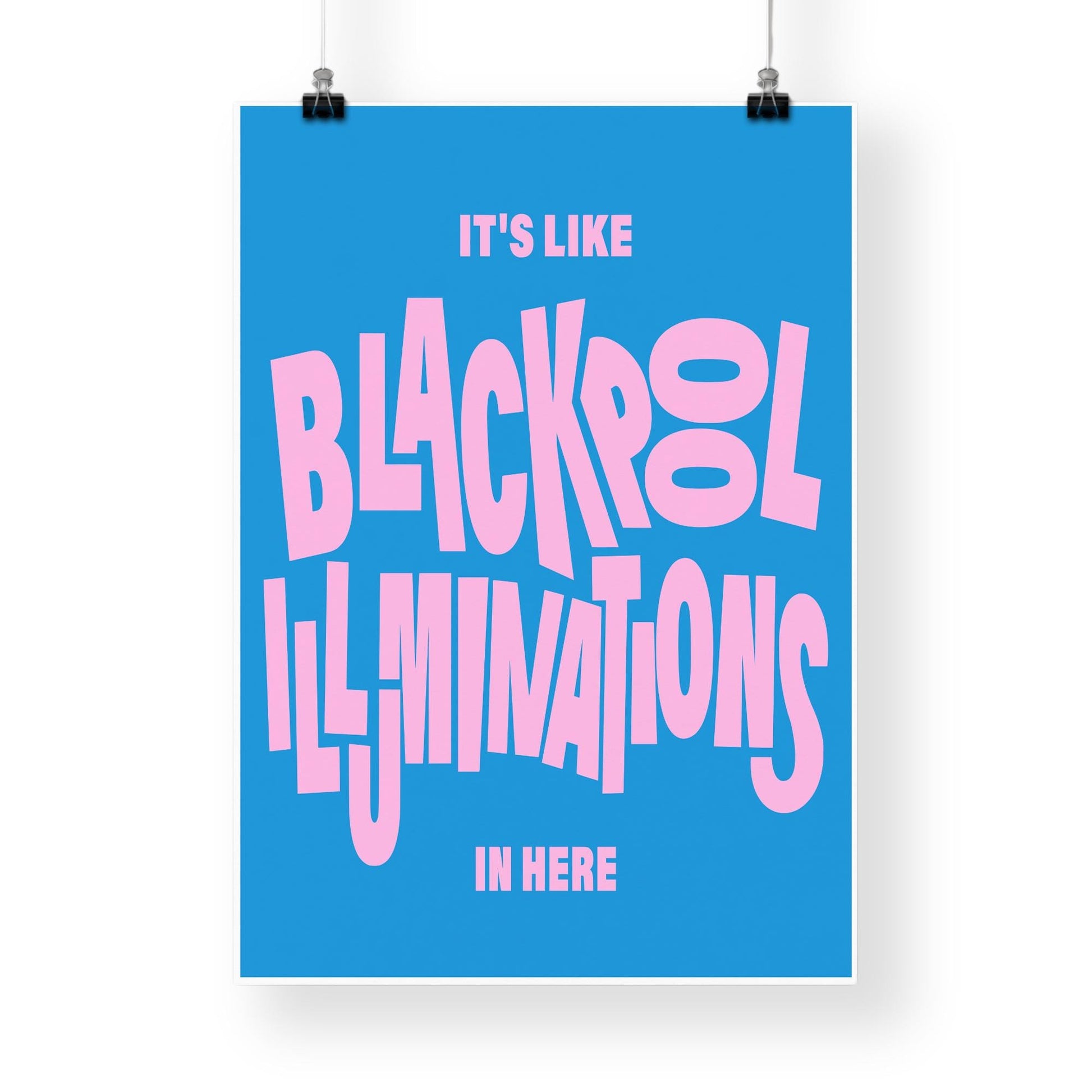 Light up your walls with this bold and brilliant poster featuring the classic Northern phrase: “Its Like Blackpool Illuminations In Here. With playful jumbled typography and a vibrant pink-on-blue colour palette, this print is perfect for adding personality, humour, and regional pride to any space.