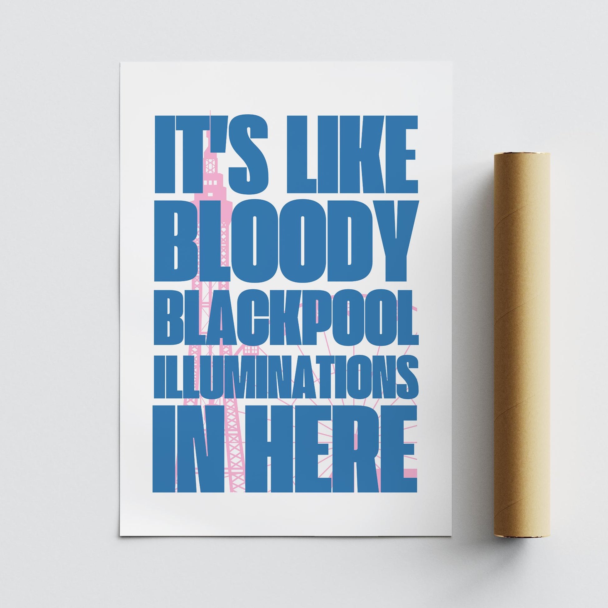 Featuring the instantly recognisable Blackpool Tower in subtle pink beneath bold blue type, this poster pairs classic Northern humour with iconic imagery. Its a cheeky and stylish way to add a slice of British culture to your walls.