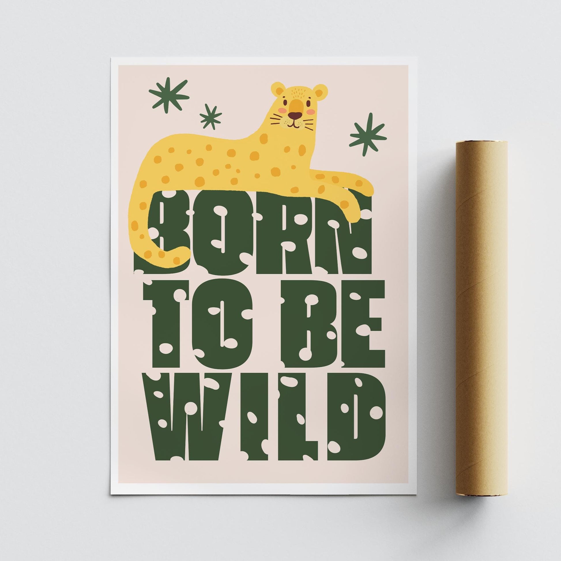 Create a jungle-inspired haven with this vibrant "Born to Be Wild" leopard poster! Featuring a playful yellow leopard lounging atop bold, leafy-green text, this delightful wall art brings a touch of adventure and charm to your childs bedroom, nursery, or playroom.