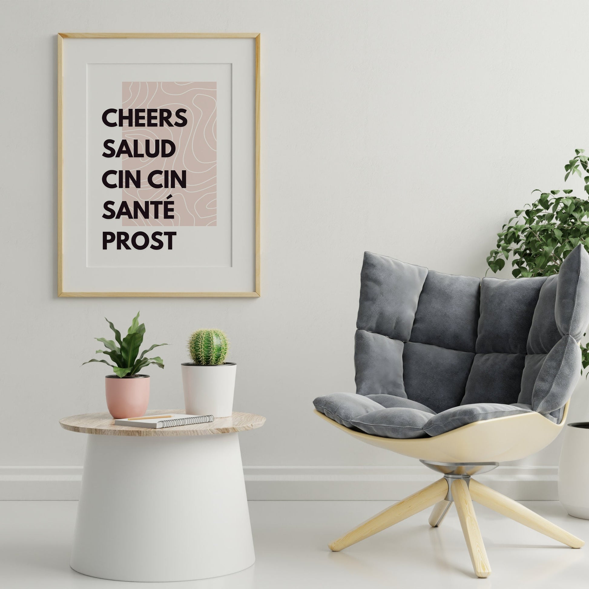 Elevate your space with our chic Multilingual Cheers Poster! Featuring the word "Cheers" in multiple languages including "Salud," "Cin Cin," "Santé," and "Prost" this stylish typography print is the perfect addition to any bar area, kitchen, or living room. Celebrate international toasts and add a modern, sophisticated touch to your decor.