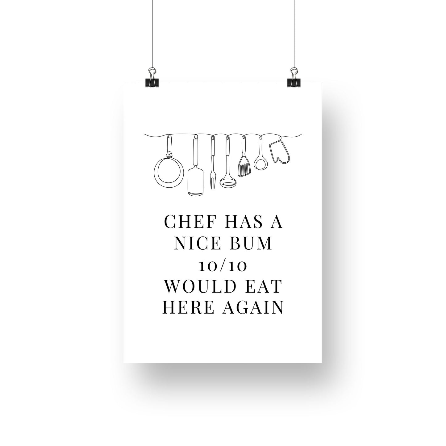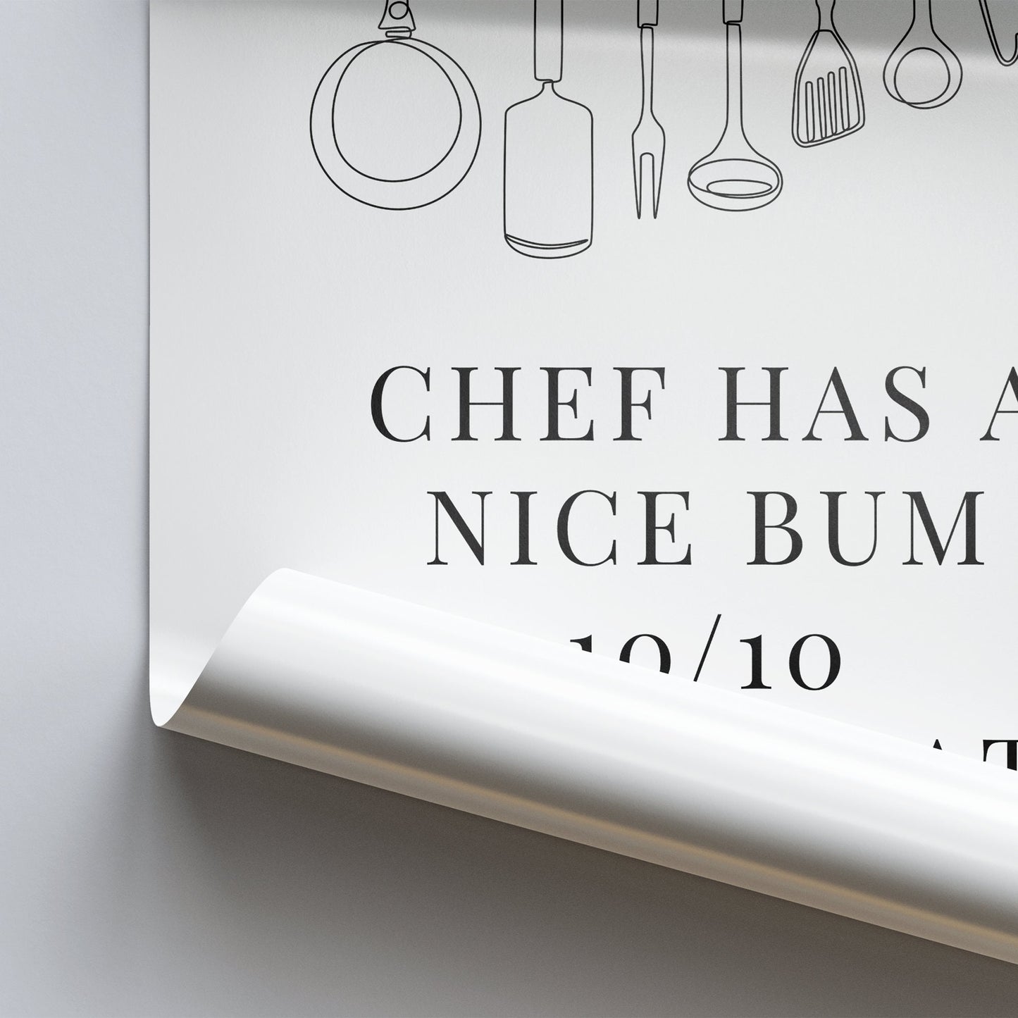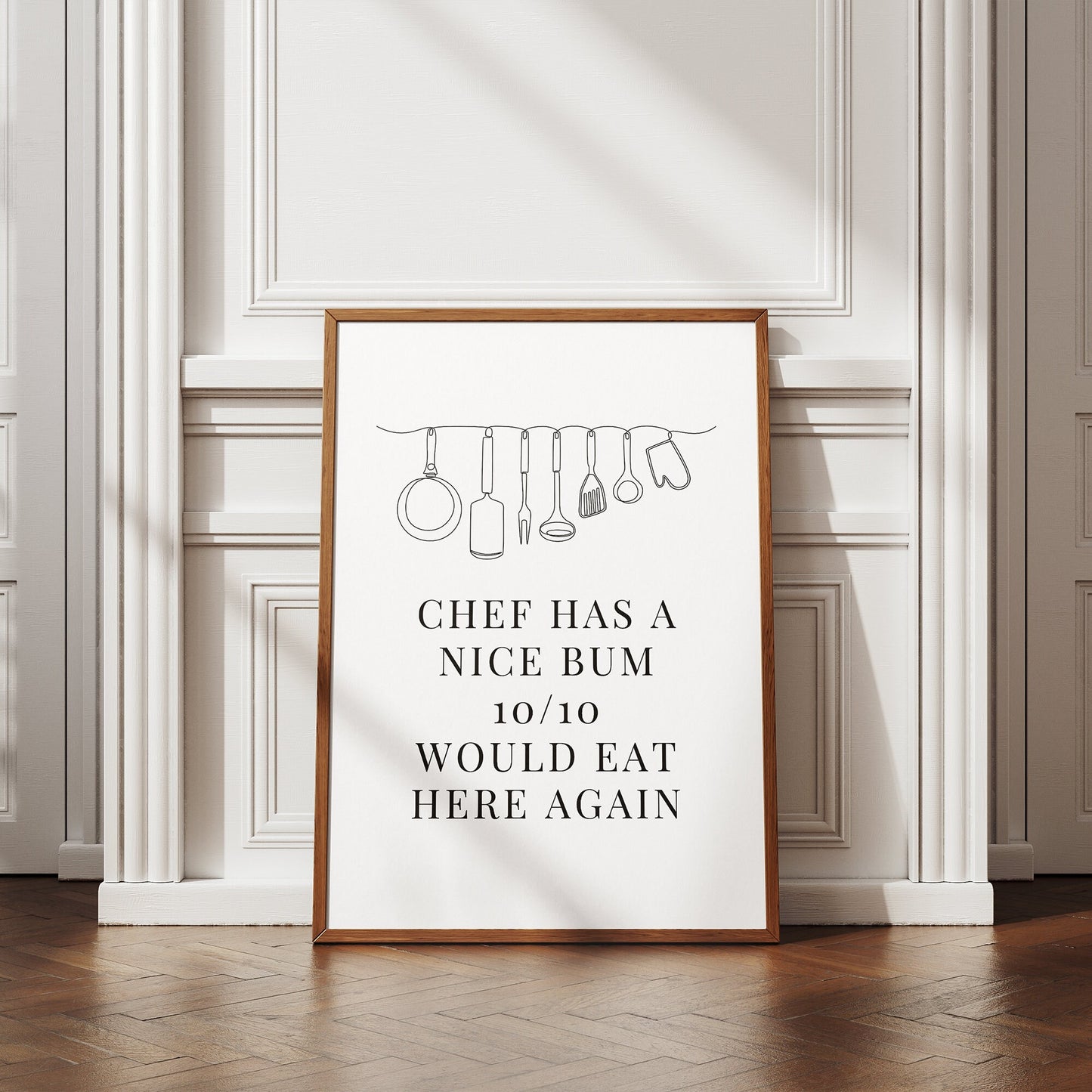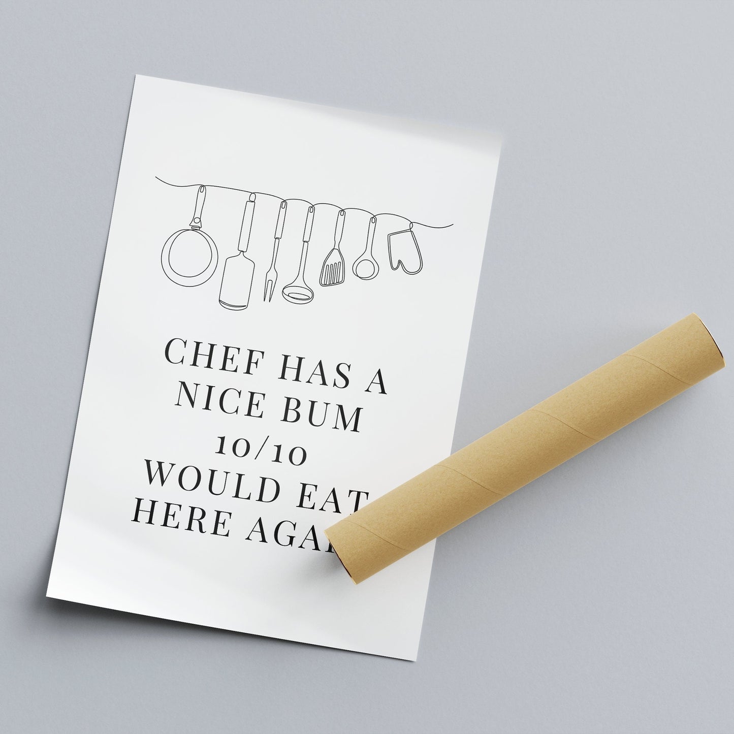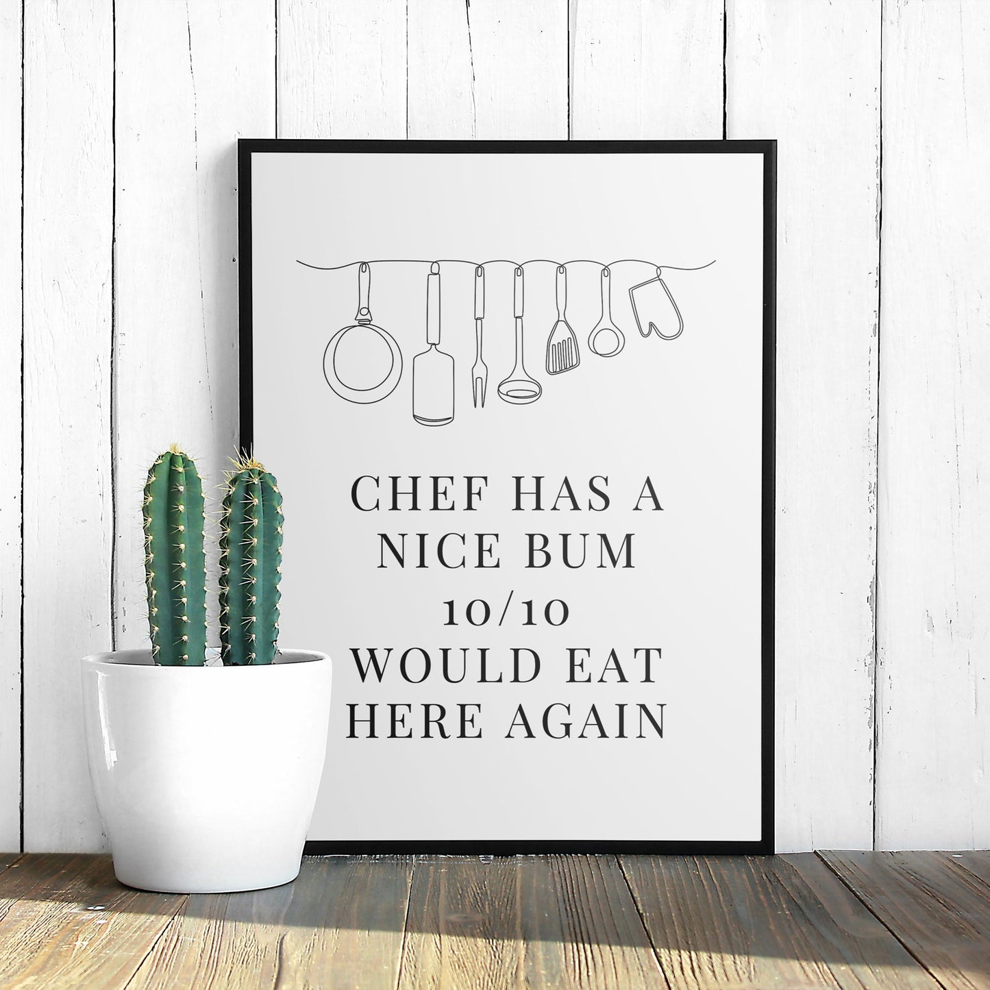Chef Has A Nice Bum, Would Eat Here Again Kitchen Print, Cutlery Poster, Home Decor, Wall Art, High-Quality Print, Chef Quote Poster