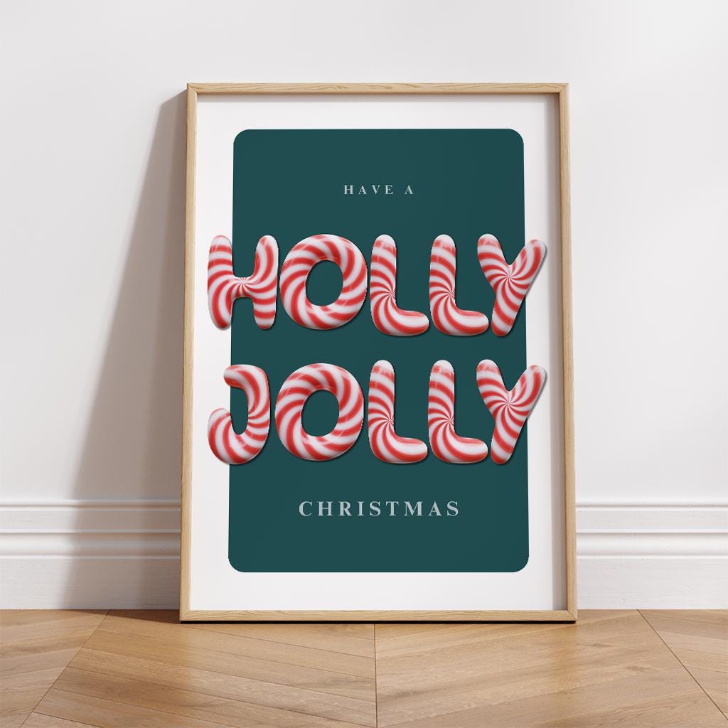Add a playful twist to your holiday decor with this candy cane inspired "Have a Holly Jolly Christmas" print. The bold peppermint-striped lettering pops against a teal backdrop, making it a fun and festive feature for any room. Printed on glossy paper, this cheerful print is sure to spread Christmas joy.