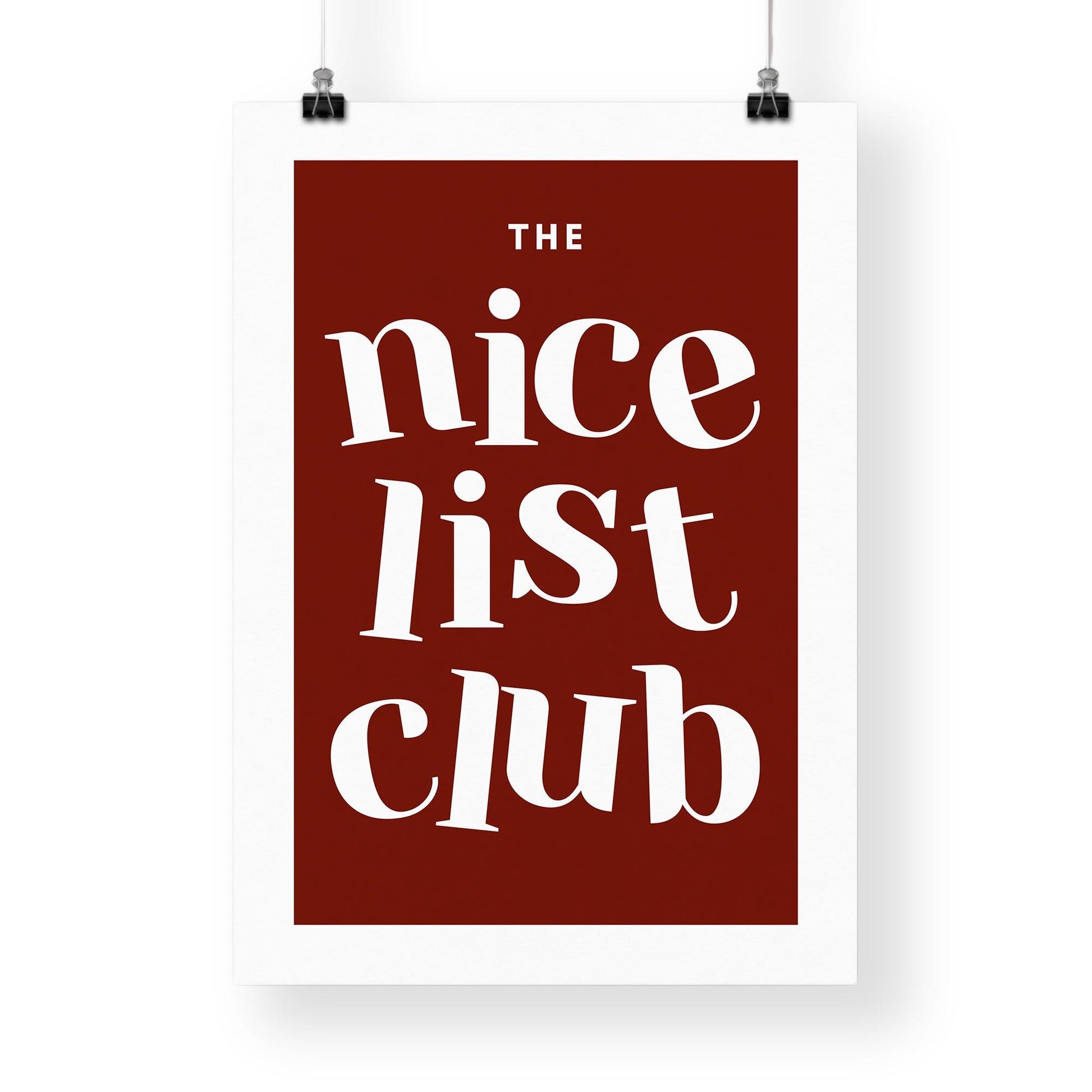 Celebrate the holiday season with this stylish "The Nice List Club" print. With bold white typography on a deep festive red background, this minimal Christmas poster is perfect for modern homes that love a clean seasonal aesthetic. Printed on premium gloss paper for a vibrant finish, it makes a cheerful addition to any festive wall display.