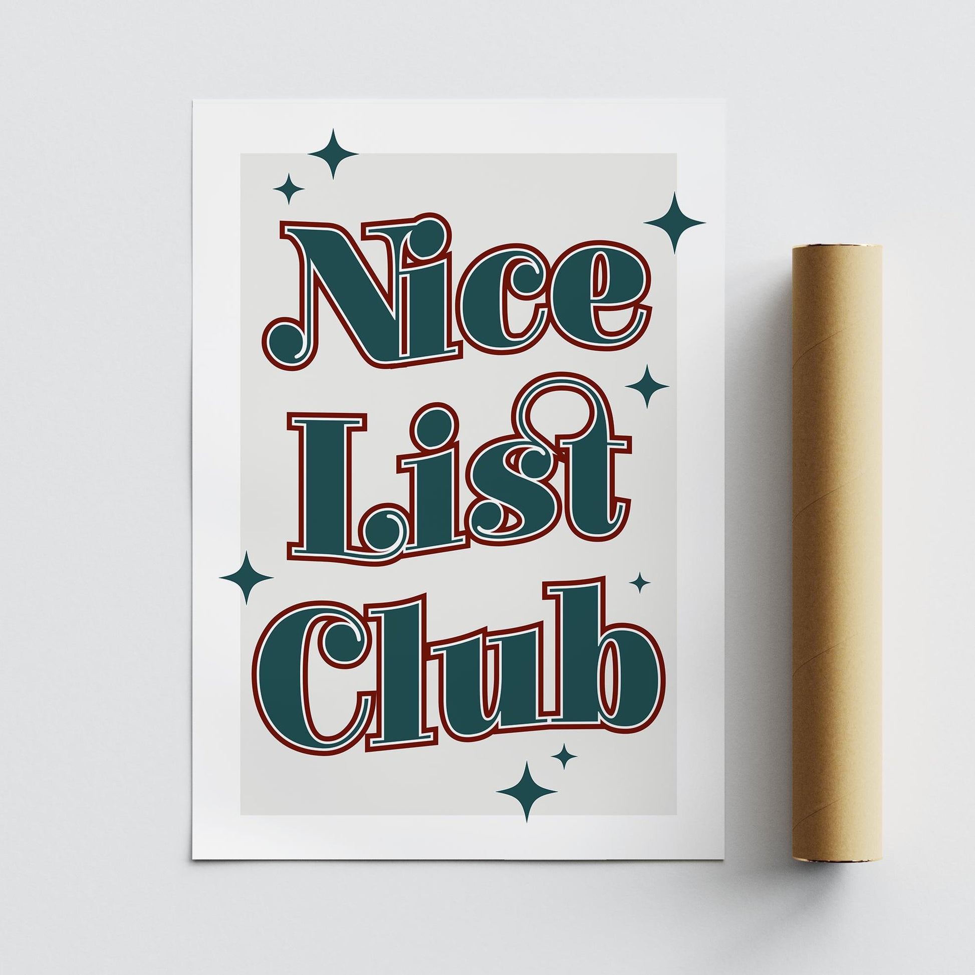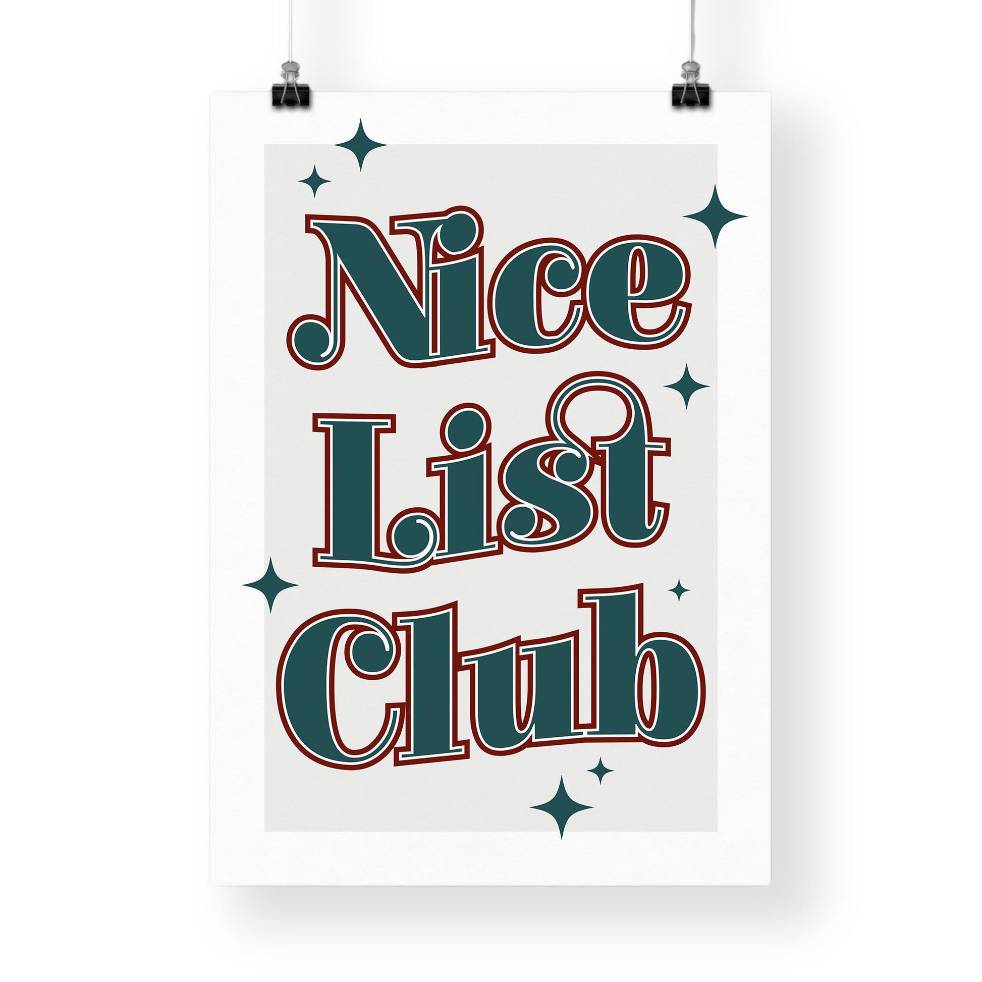 Add sparkle to your seasonal decor with this "Nice List Club" Christmas print. Featuring teal and red typography surrounded by star accents, this poster brings a festive, cheerful vibe to any wall. Printed on premium gloss paper, it’s a fun and stylish choice for holiday decorating.