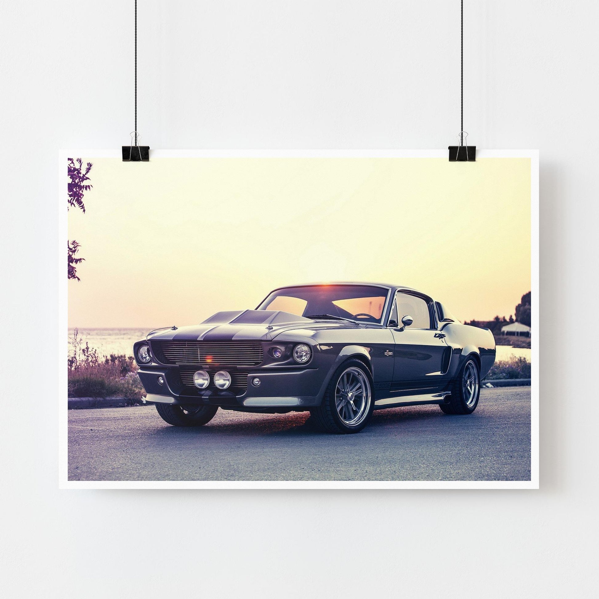 Celebrate the beauty of an American classic with this stunning poster of the Ford Mustang Shelby GT500. Set against a serene sunset backdrop, this artwork captures the timeless elegance and raw power of one of the most iconic muscle cars in history. A perfect addition to any car enthusiast‘s collection, this print exudes style, nostalgia, and a passion for performance.