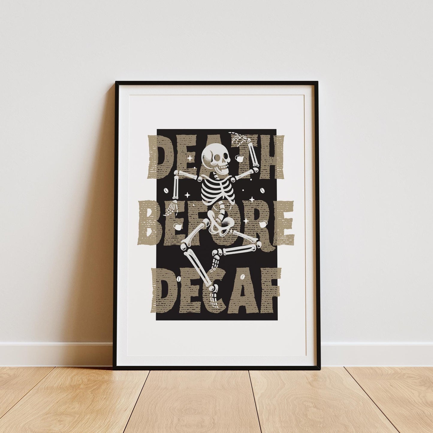 Death Before Decaf - 01 Poster: Dark Humour Print, Coffee Lover Gift, Spooky Season Kitchen Wall Art, Autumnal Vibes, Edgy Home Decor