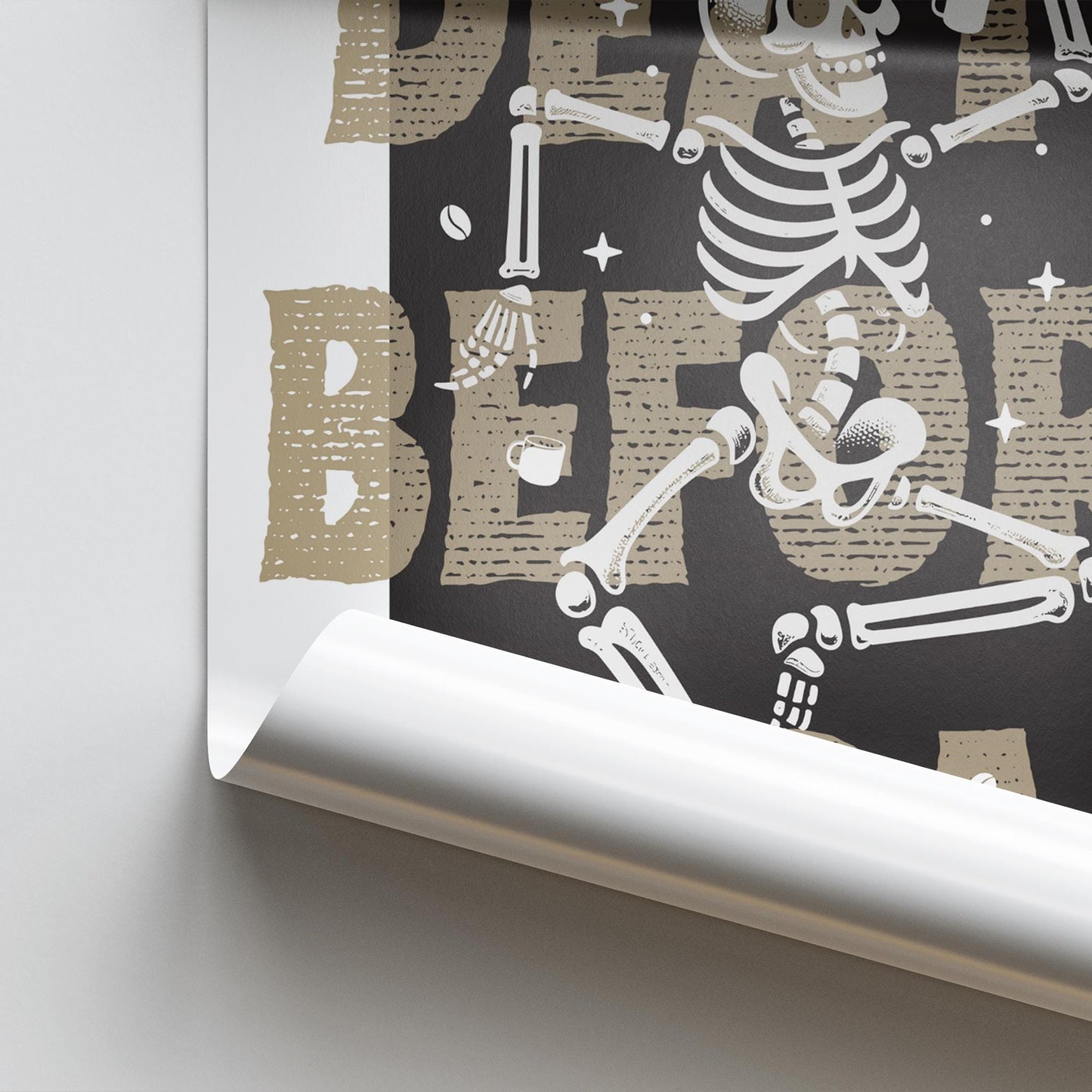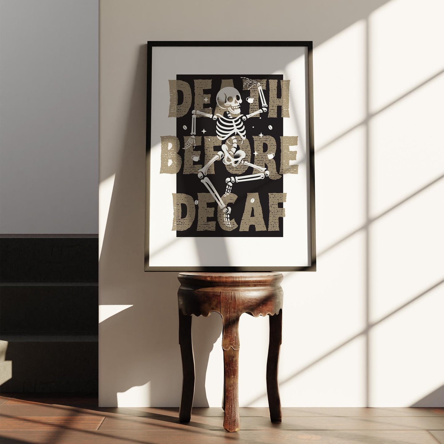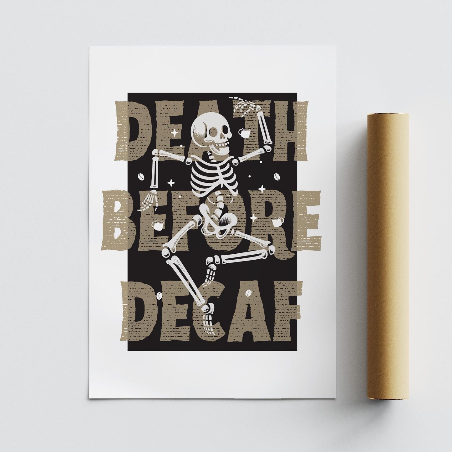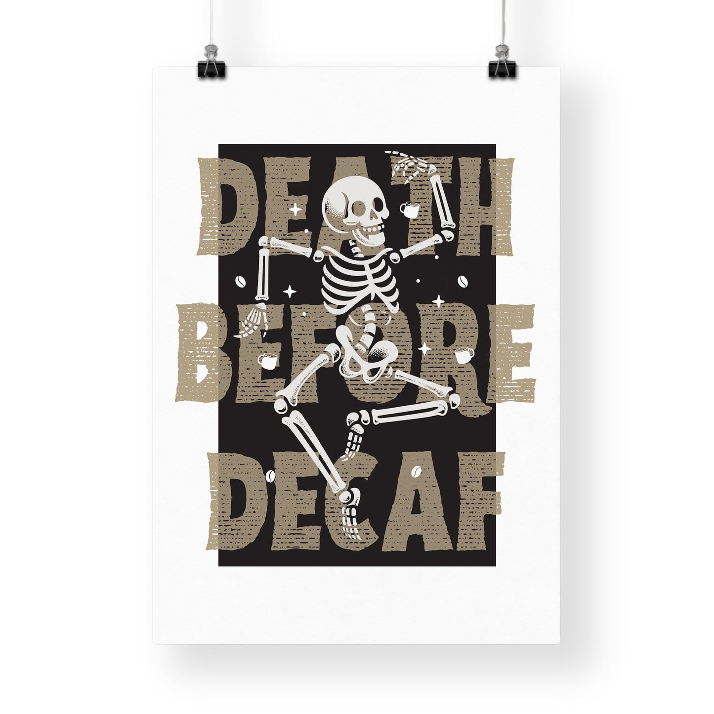 Add a touch of dark humour to your space with our "Death Before Decaf" Skeleton Poster. This eye-catching piece features a striking skeleton motif paired with the bold phrase, making it a perfect statement for coffee lovers who take their caffeine seriously. Whether you‘re decorating a kitchen, office, or coffee nook, this poster brings a unique blend of edgy design and coffee culture to your walls. Printed on high-quality paper with vibrant inks, its designed to last and keep your space looking sharp. Ideal for anyone who believes that decaf is simply not an option.