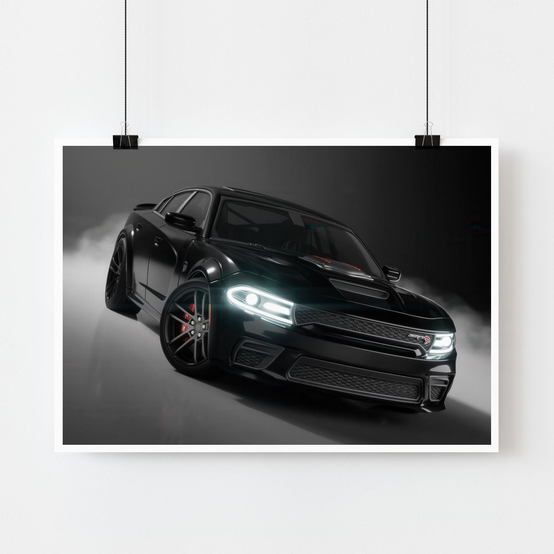 Unleash the power and attitude of American muscle with this striking Dodge Charger SRT Hellcat poster. Captured in a dynamic action pose with a sleek black finish and glowing headlights, this artwork embodies speed, performance, and pure adrenaline. Perfect for muscle car enthusiasts, this poster will make a bold statement in your garage, office, or living room.