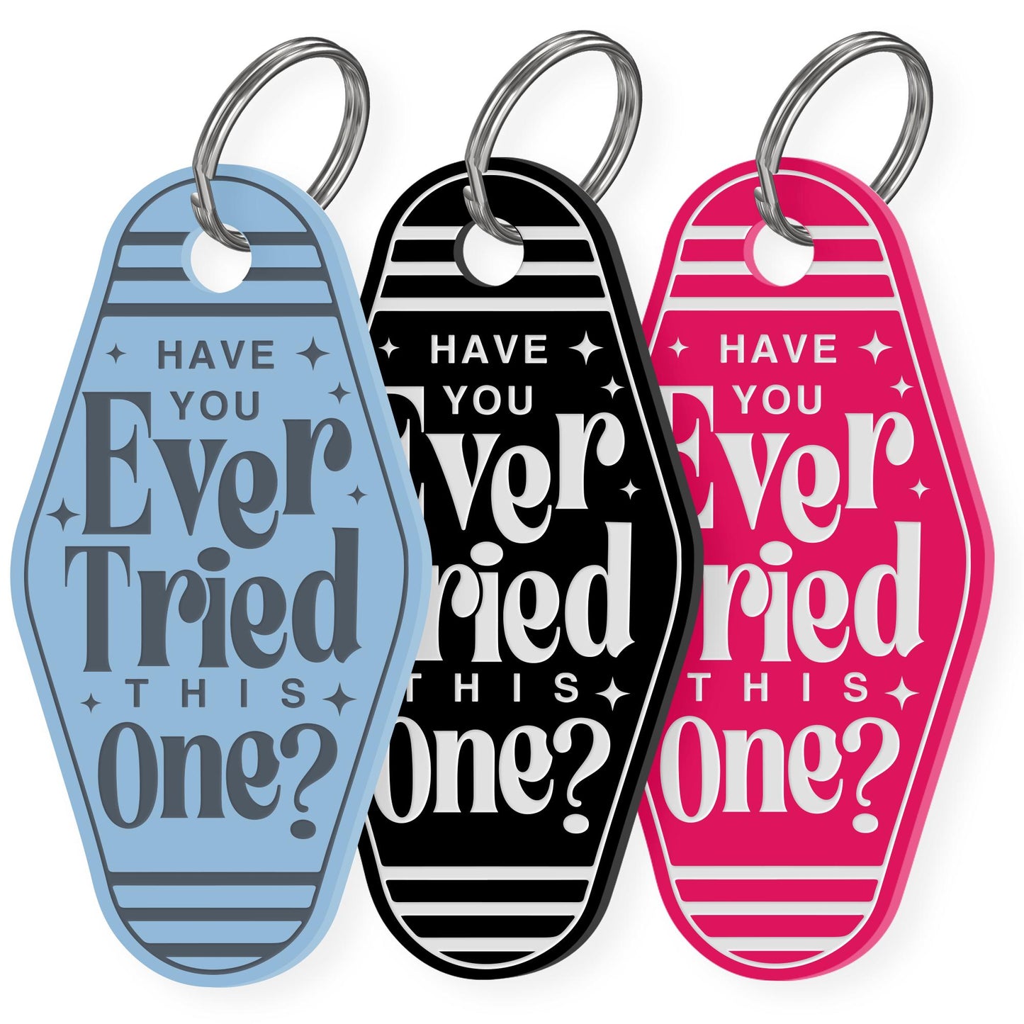 Channel the cheeky and playful vibe of Sabrina Carpenters hit song "Juno" with this "Have You Ever Tried This One?" motel-style acrylic keyring. This retro-inspired design, featuring bold lettering and fun motifs, is the perfect accessory for music lovers who love to express their personality with unique style.