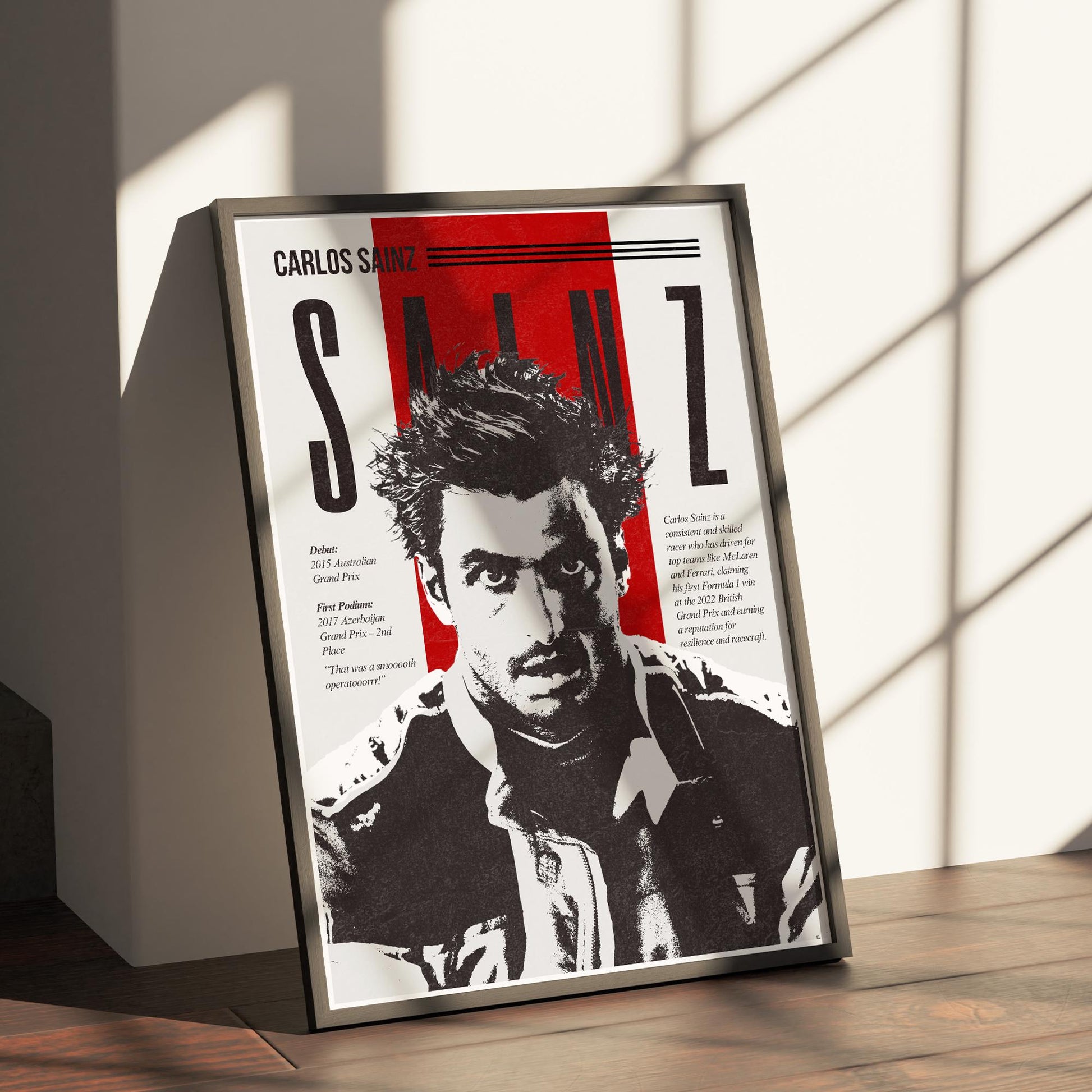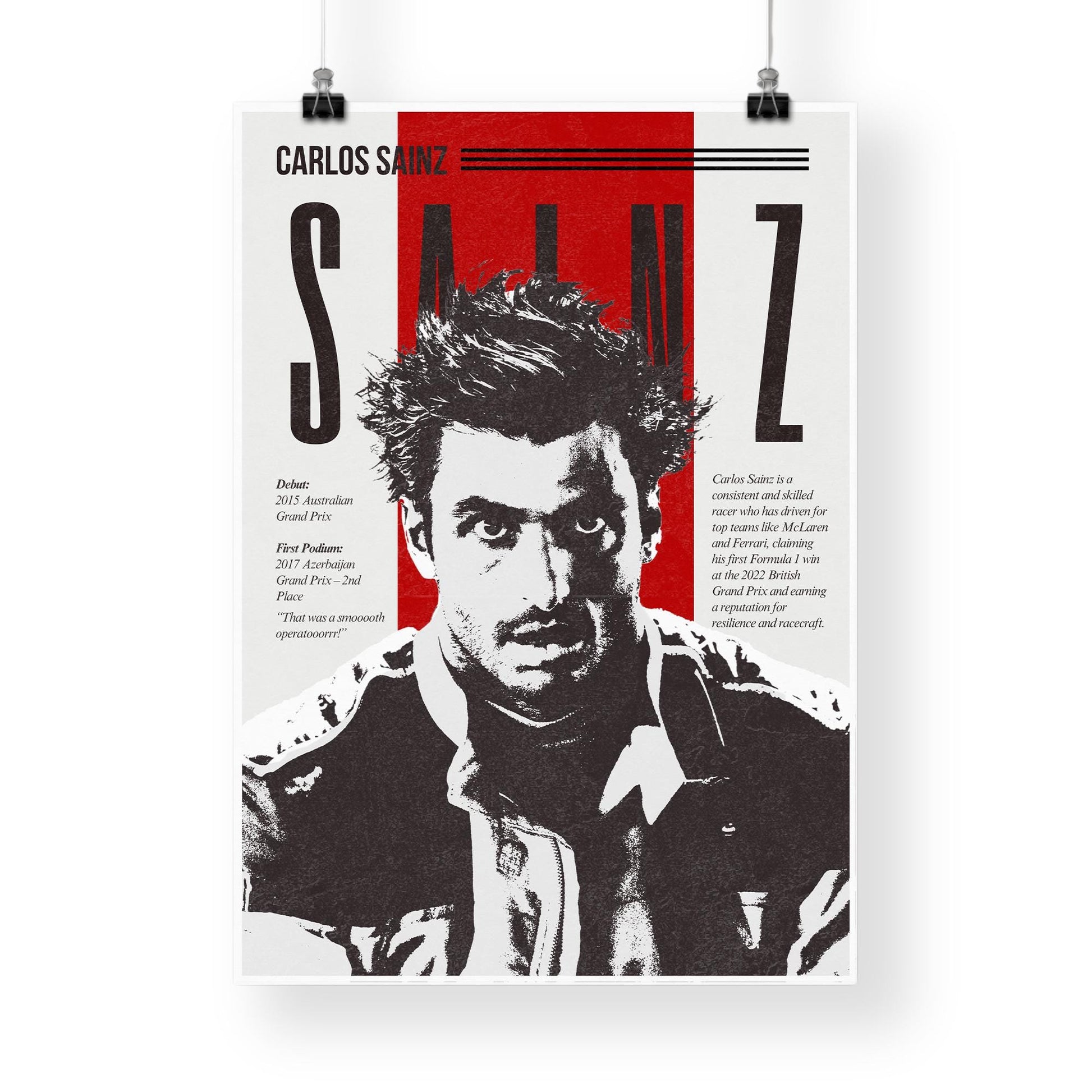Channel the focus, style, and flair of Carlos Sainz with this striking Formula 1 art print. Rendered in a bold retro style with vivid red accents and graphic typography, this poster captures the essence of Sainzs journey from his 2015 F1 debut to his first podium and iconic “That was a smoooth operatoooorrr! moment.