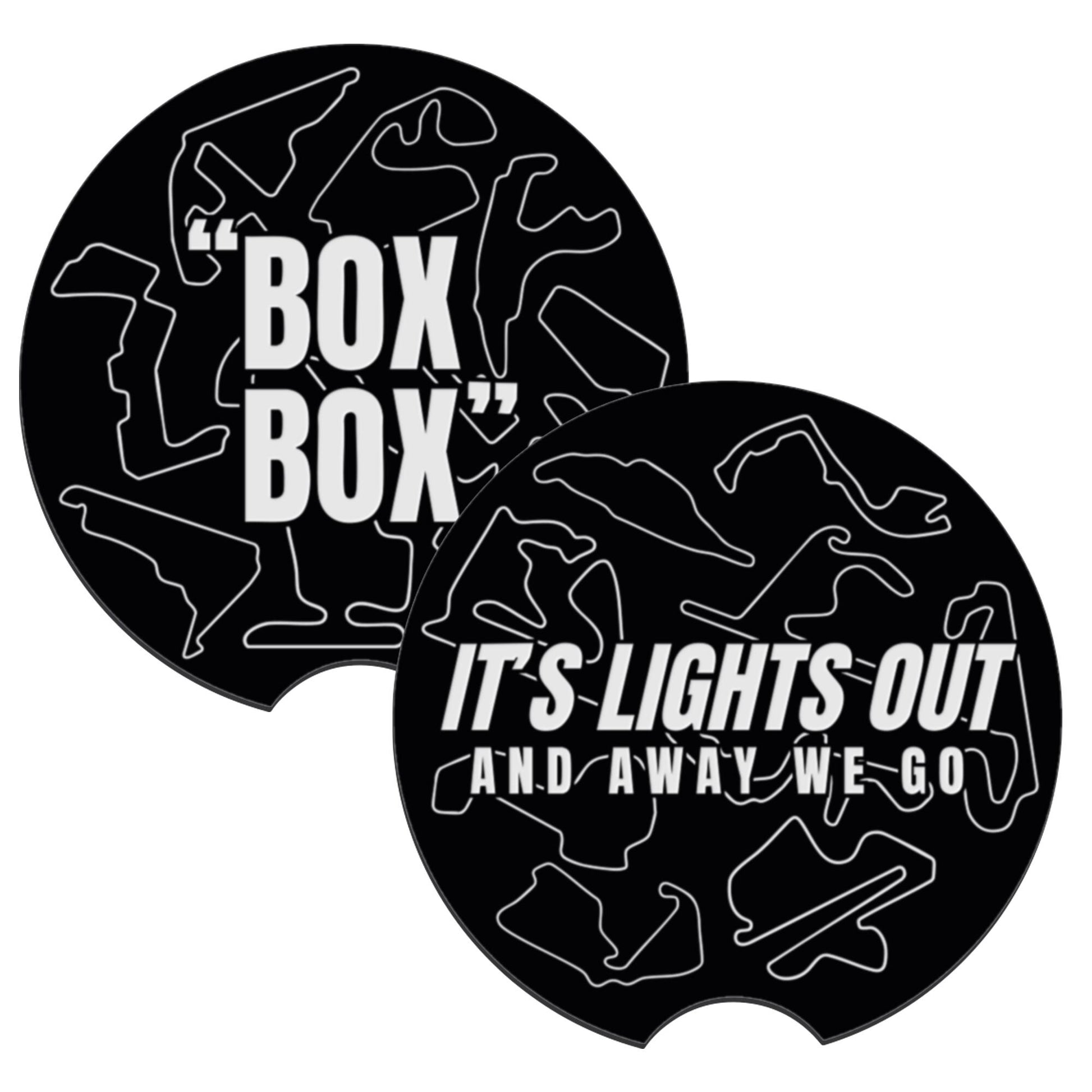 Includes one “BOX BOX” coaster and one “Lights Out & Away We Go” coaster, each layered with outlines of iconic racing circuits for a technical, modern motorsport aesthetic.
