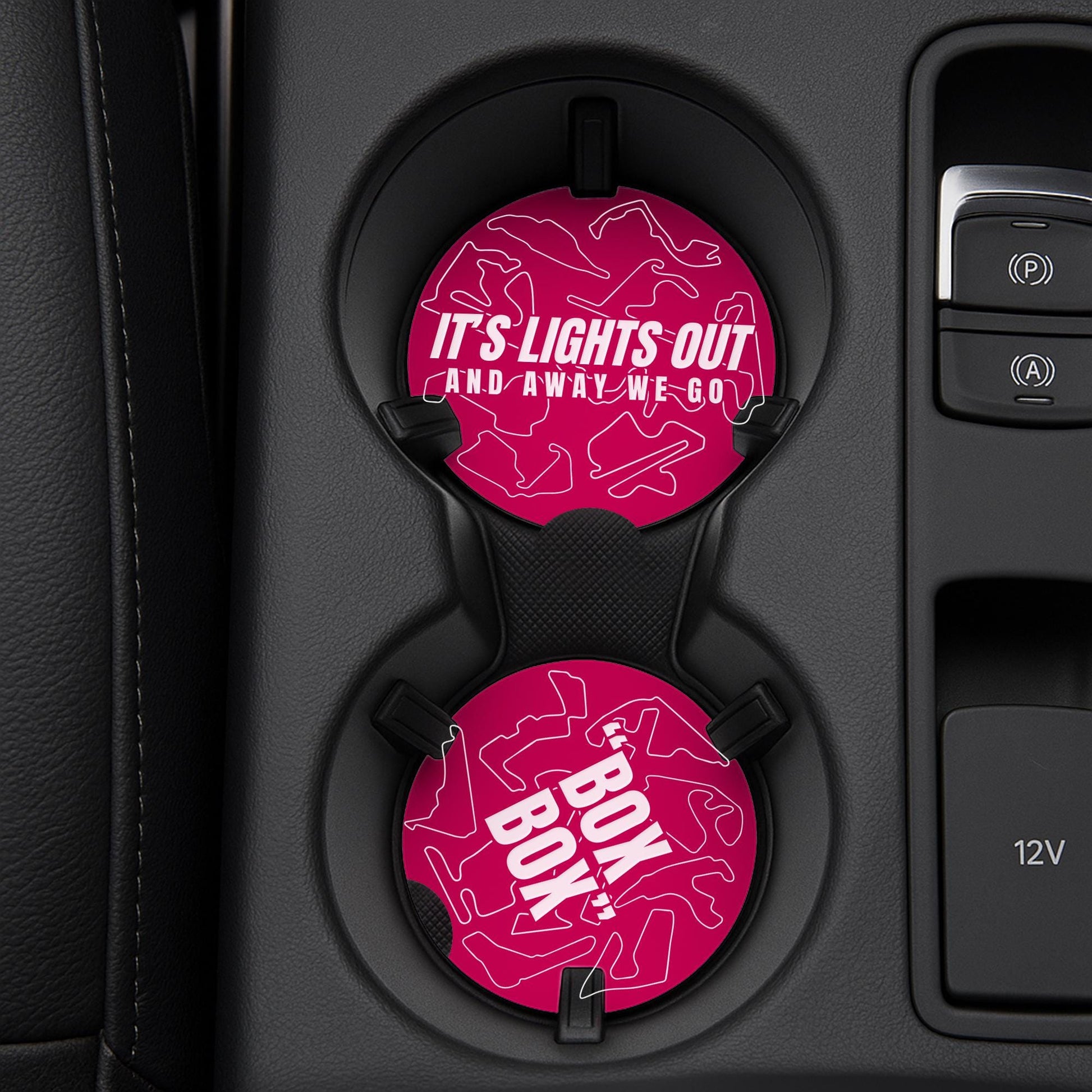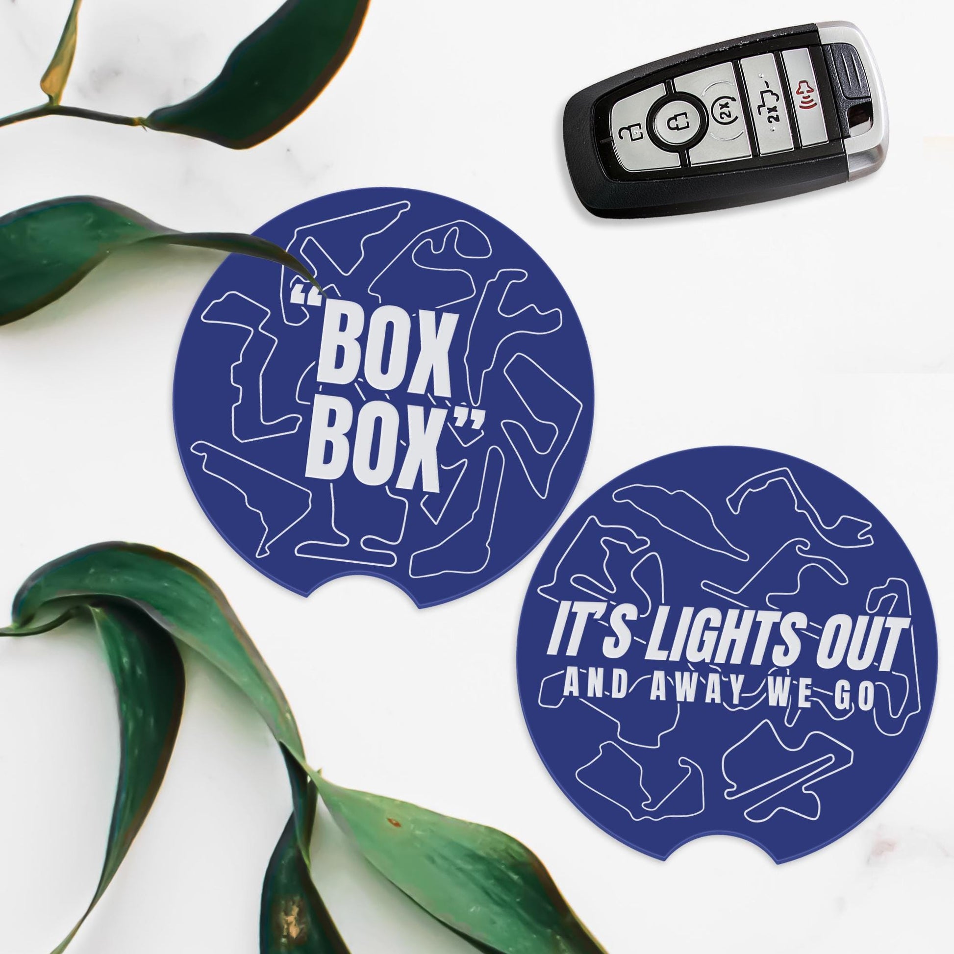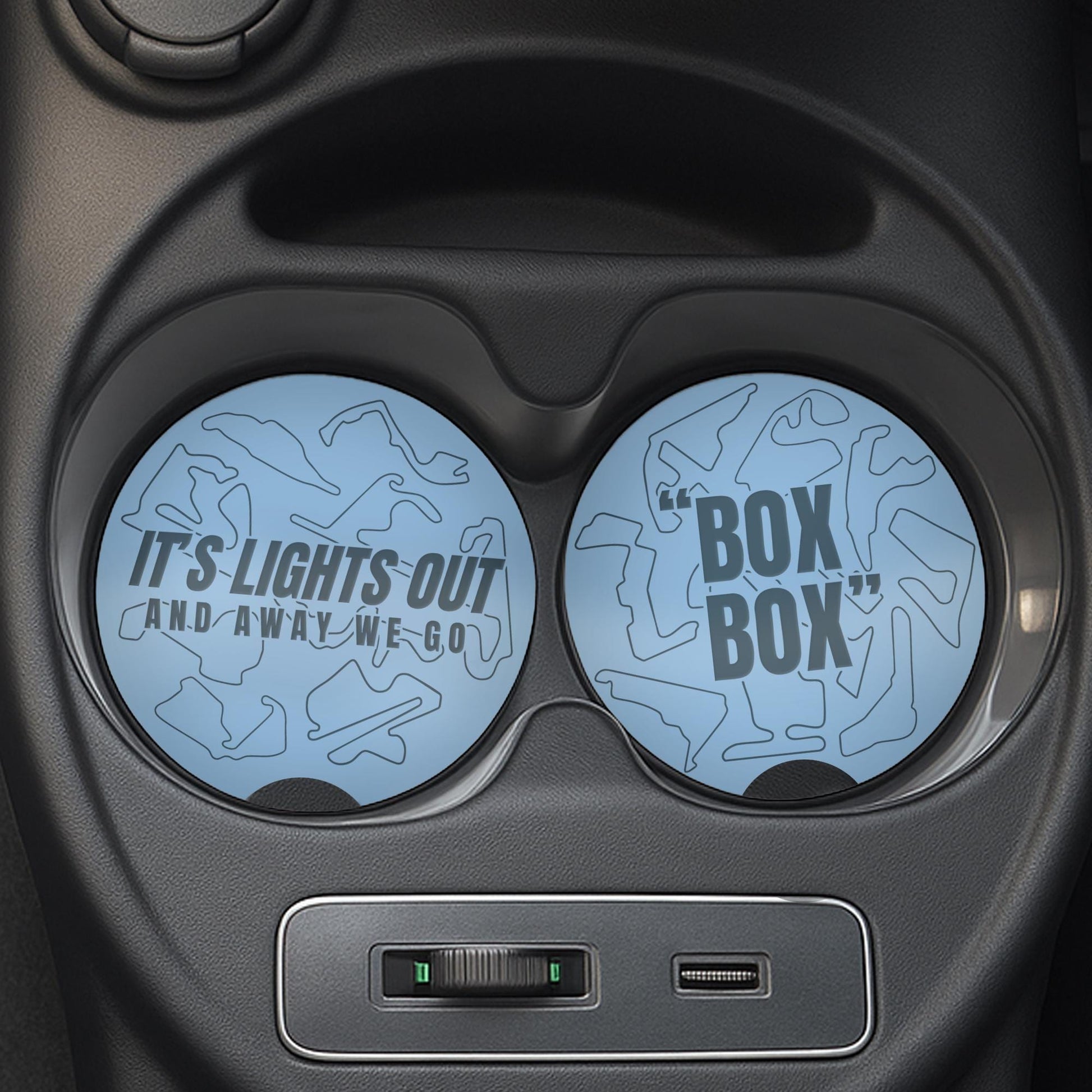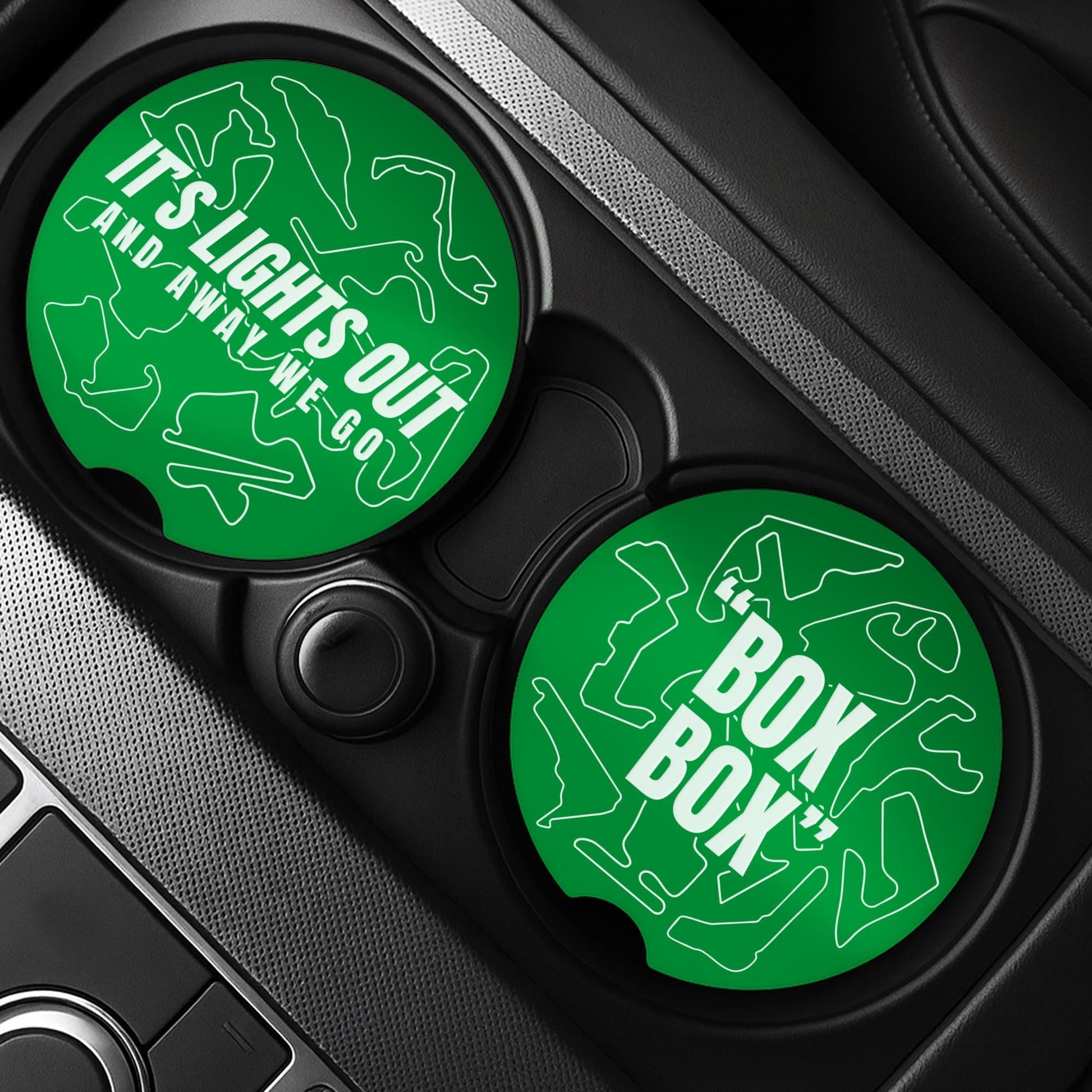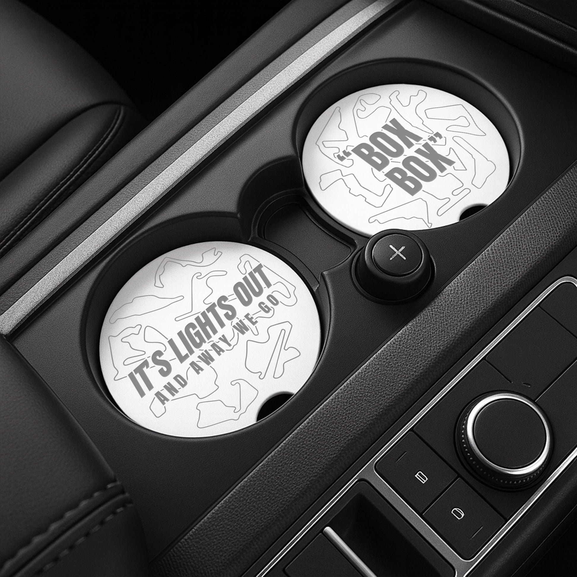F1 Track Car Coasters Set for Cup Holders | Box Box & Lights Out | Formula 1 Gift