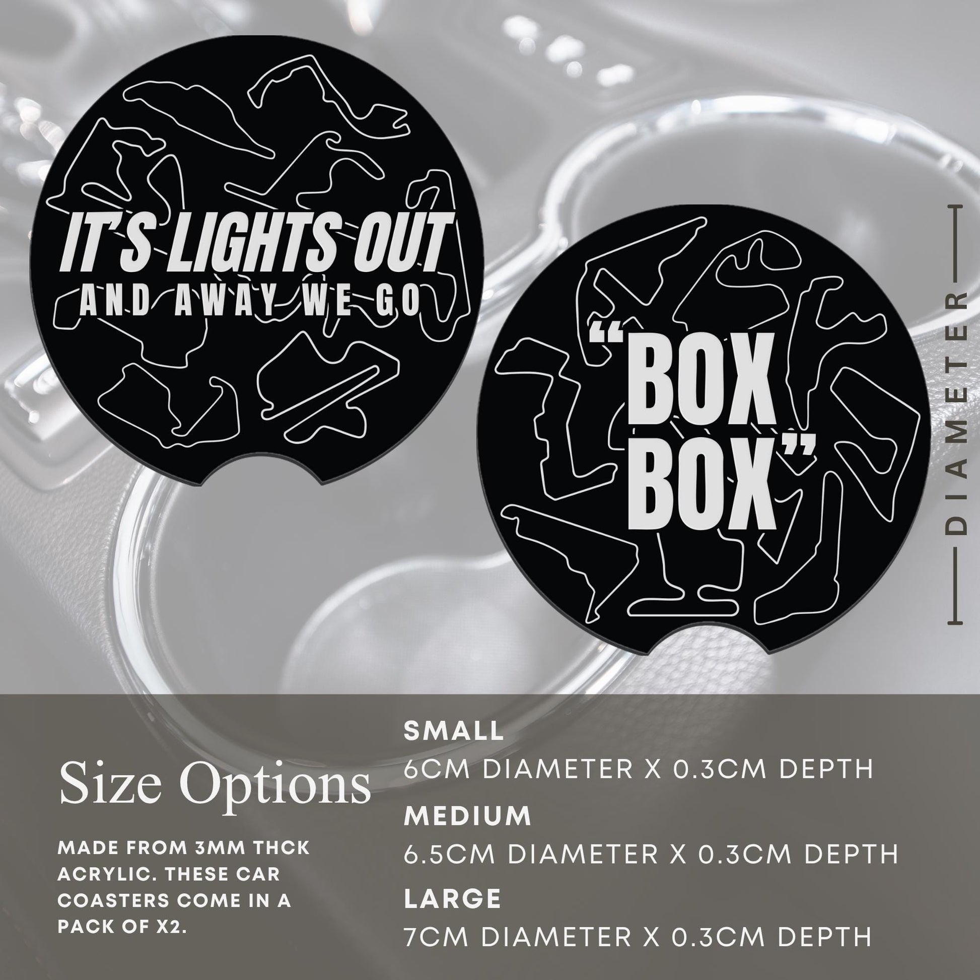 This set combines two F1-inspired acrylic coasters: one with the iconic “BOX BOX” phrase and one with “It’s Lights Out & Away We Go,” both overlaid on a collection of racing circuit outlines. Made from premium 3 mm acrylic, these coasters bring a sleek, technical motorsport look to your cup holders while protecting them from spills and debris. Designed with a side notch for easy removal and available in three sizes.