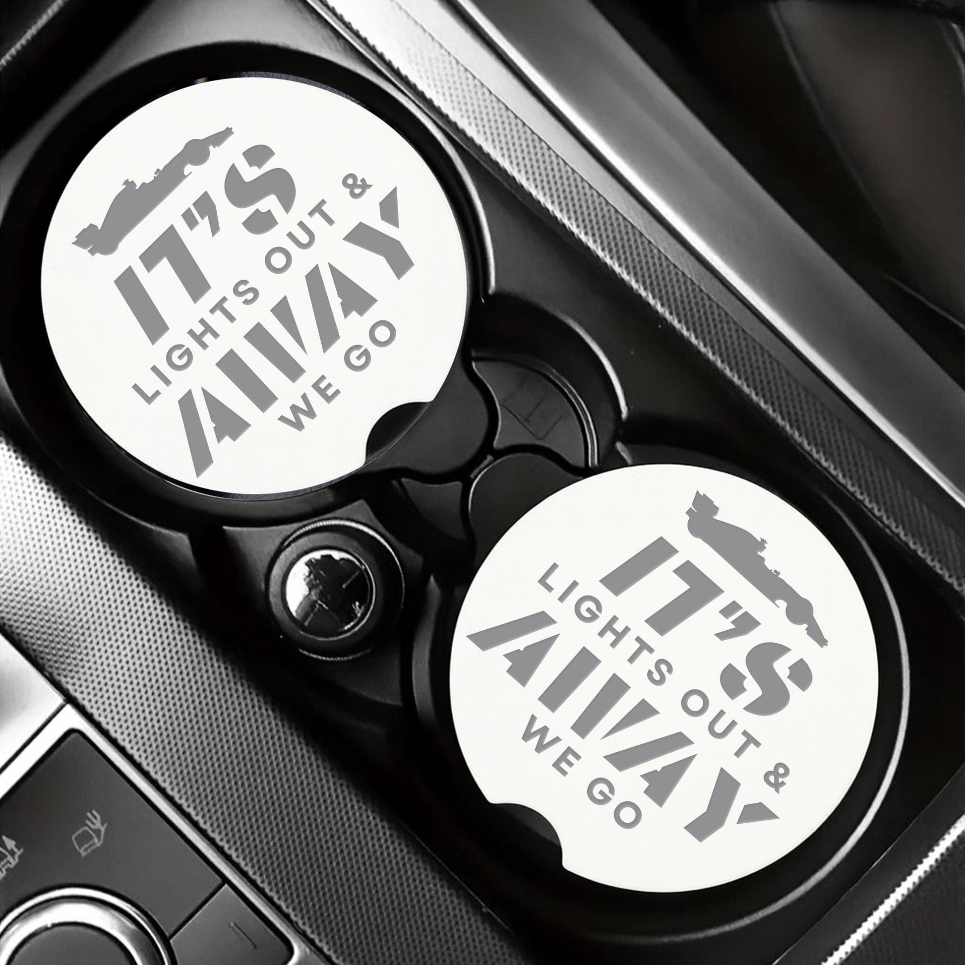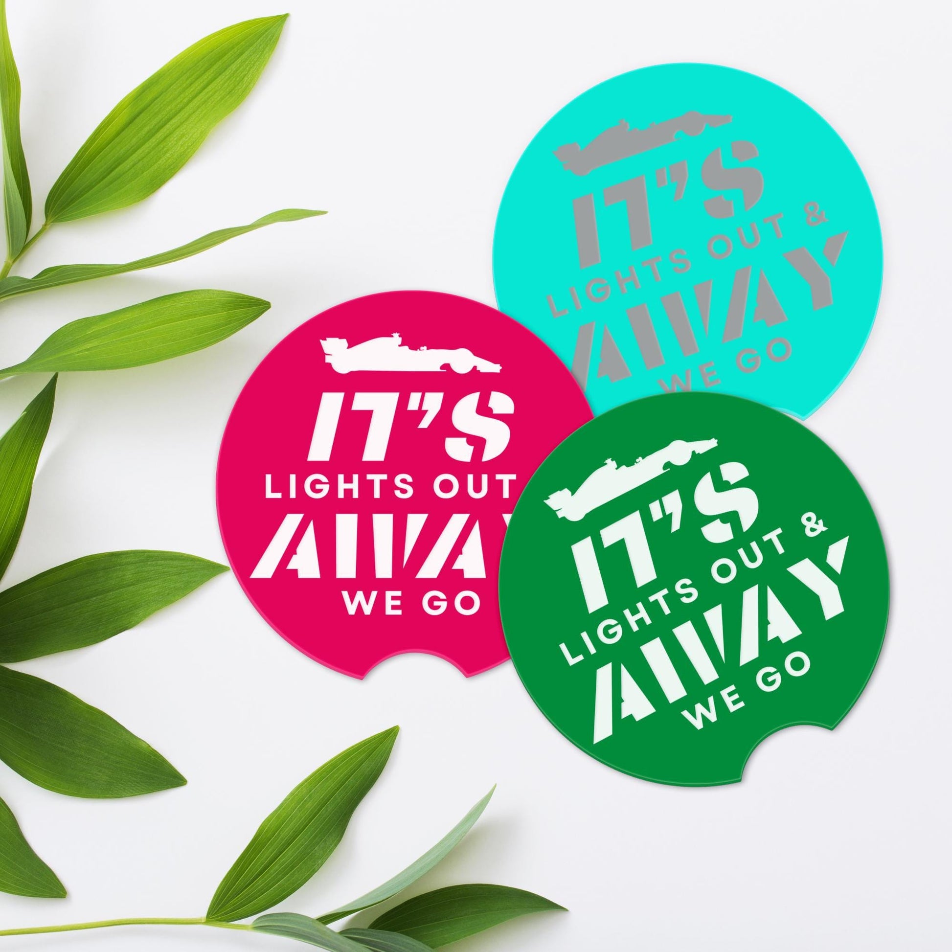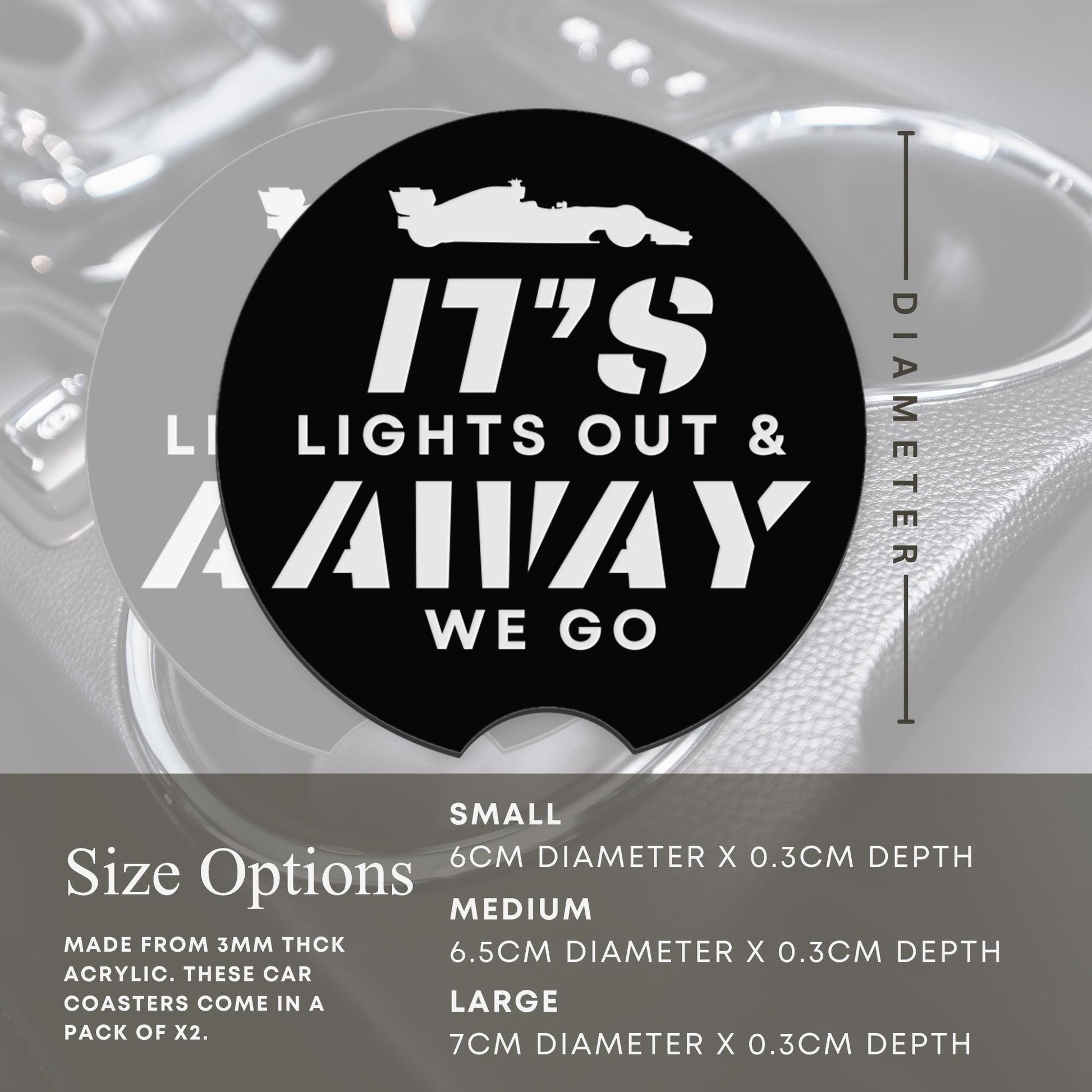 This pair of F1-inspired acrylic car coasters features the phrase “It’s Lights Out & Away We Go” with a sleek racing car silhouette. Designed to add a subtle motorsport touch to your car interior, they protect cup holders from spills, condensation and debris. Made from 3 mm acrylic and available in multiple sizes, each coaster includes a side notch for easy lifting.