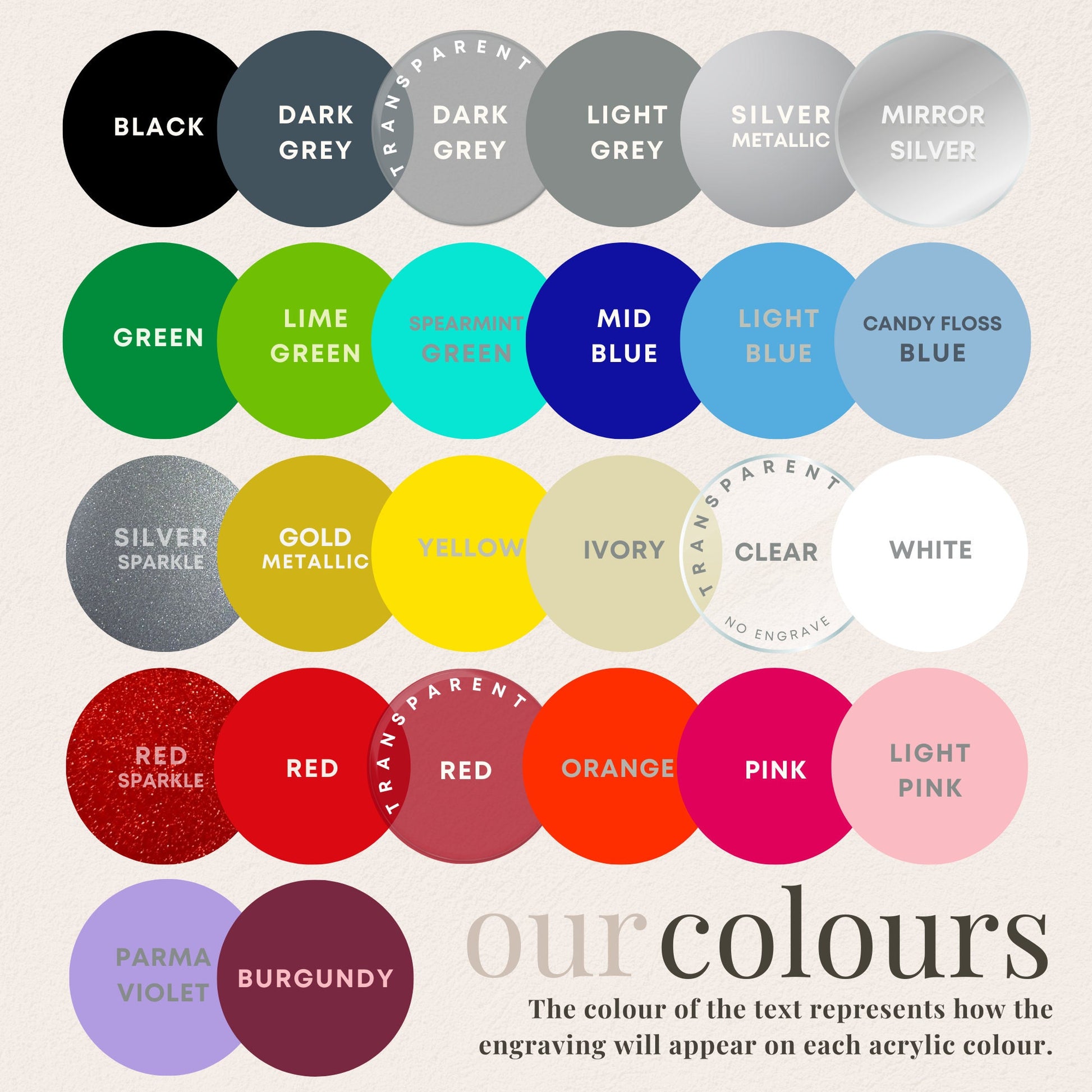 - Each acrylic colour has a different colour where it is engraved. The engraved colour can range from dark grey to white (burgundy comes out pink).