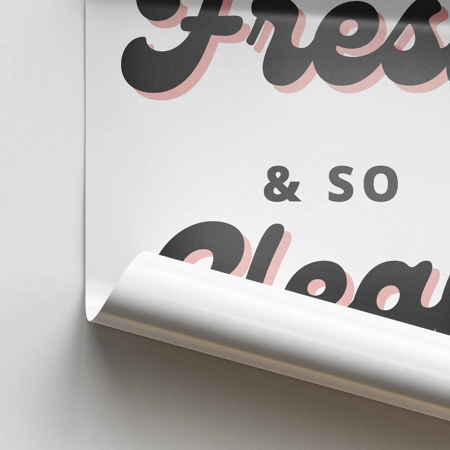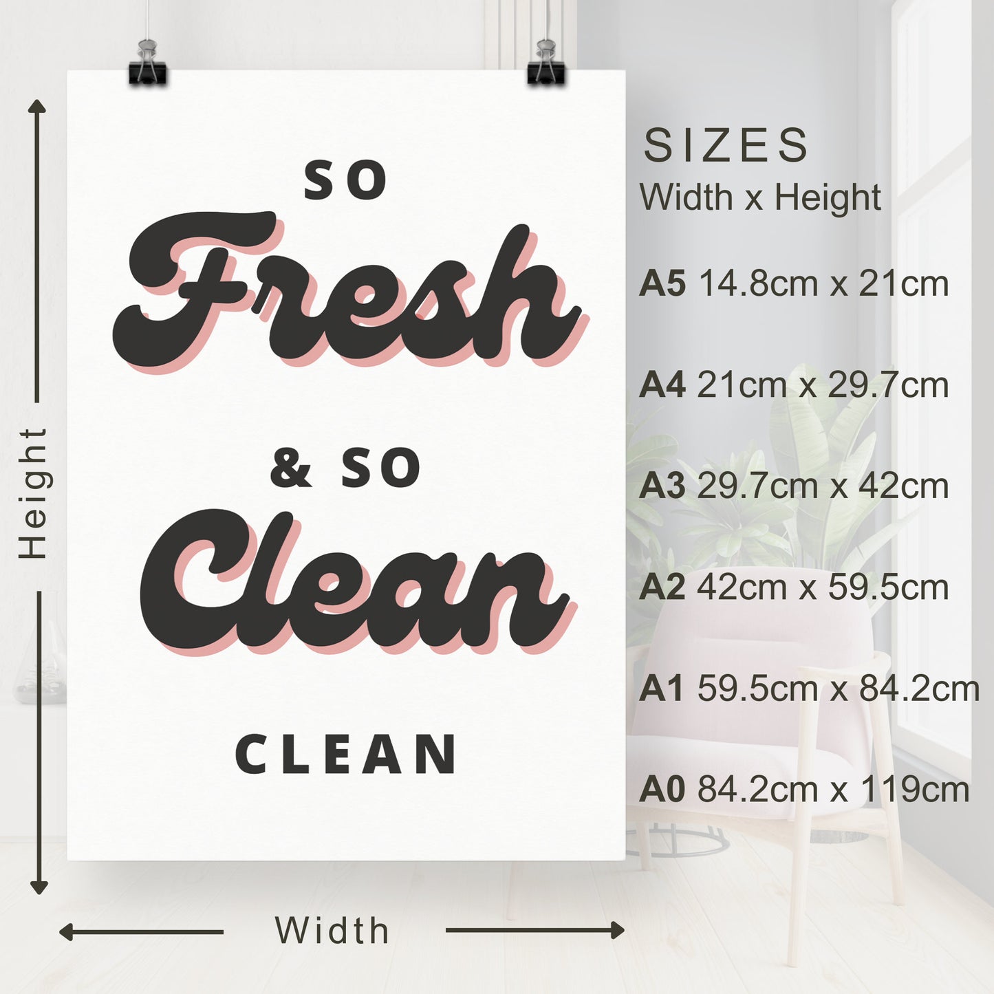 Elevate your home decor with our "Fresh & Clean" poster from The Print Snug. Featuring the catchy phrase "So Fresh & So Clean Clean," this poster adds a touch of charm to any room in your house. Perfect for utility rooms, bathrooms, or even as a fun accent piece in your living space. Each poster is printed on high-quality gloss paper for a vibrant and durable finish. Available in a range of sizes from A5 to A1, it makes for a great gift idea for friends and family who appreciate unique and stylish home decor.
