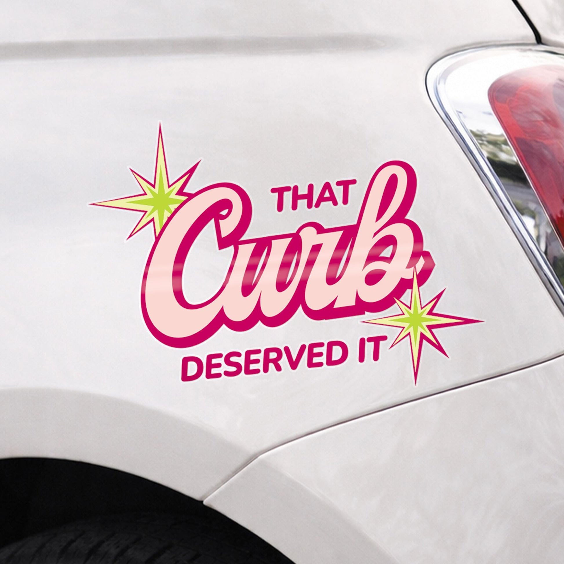 Add a little humour to your car with this fun “That Curb Deserved It” vinyl car sticker. Designed in a bold retro style with bright pink lettering and starburst accents, this playful decal is perfect for drivers who can laugh at the occasional curb encounter.