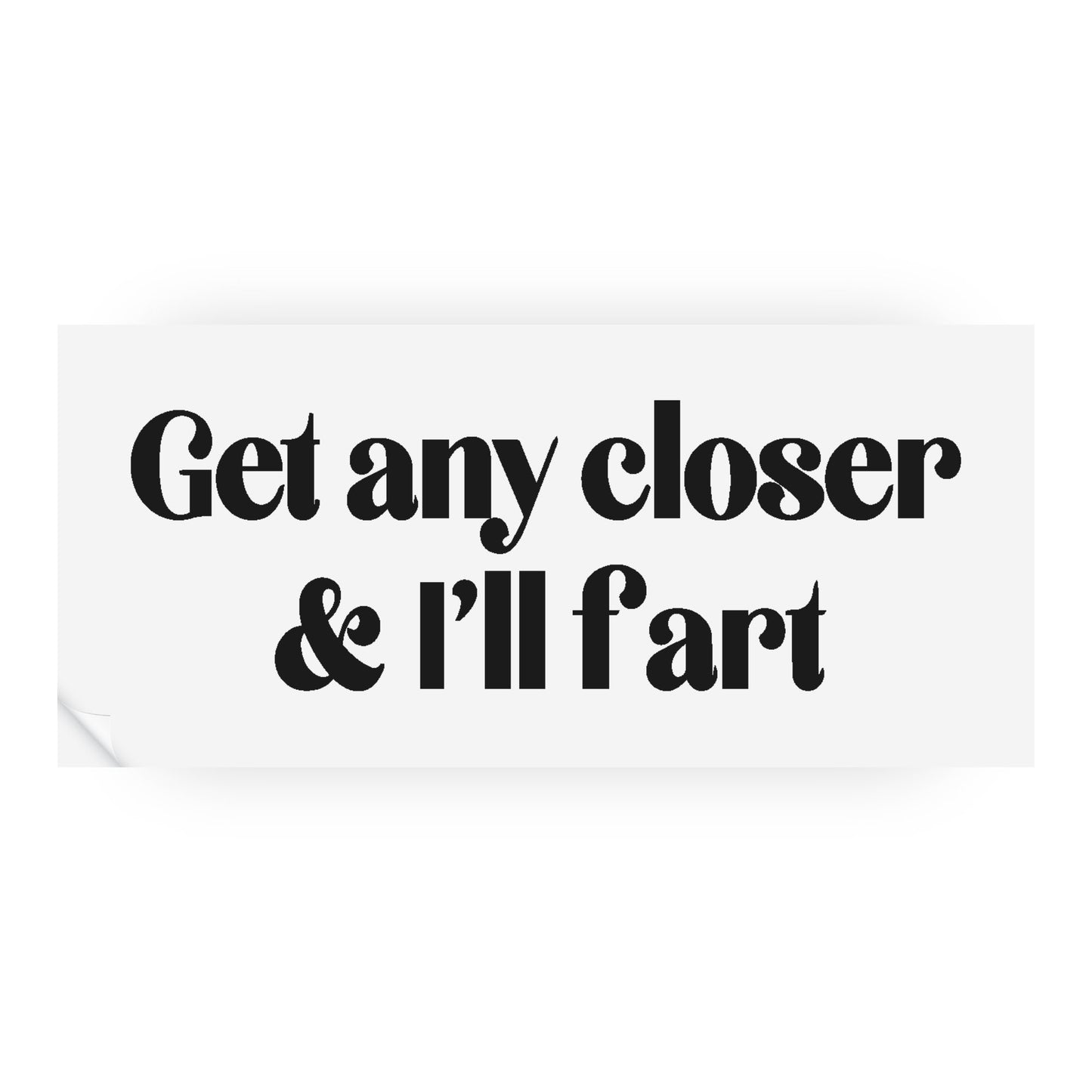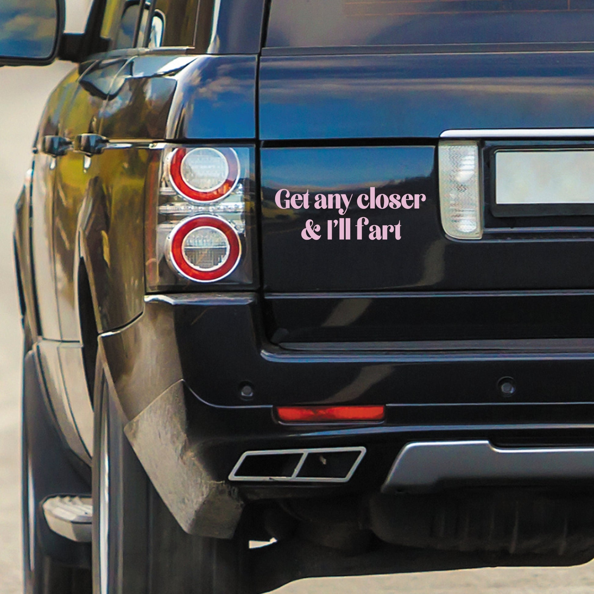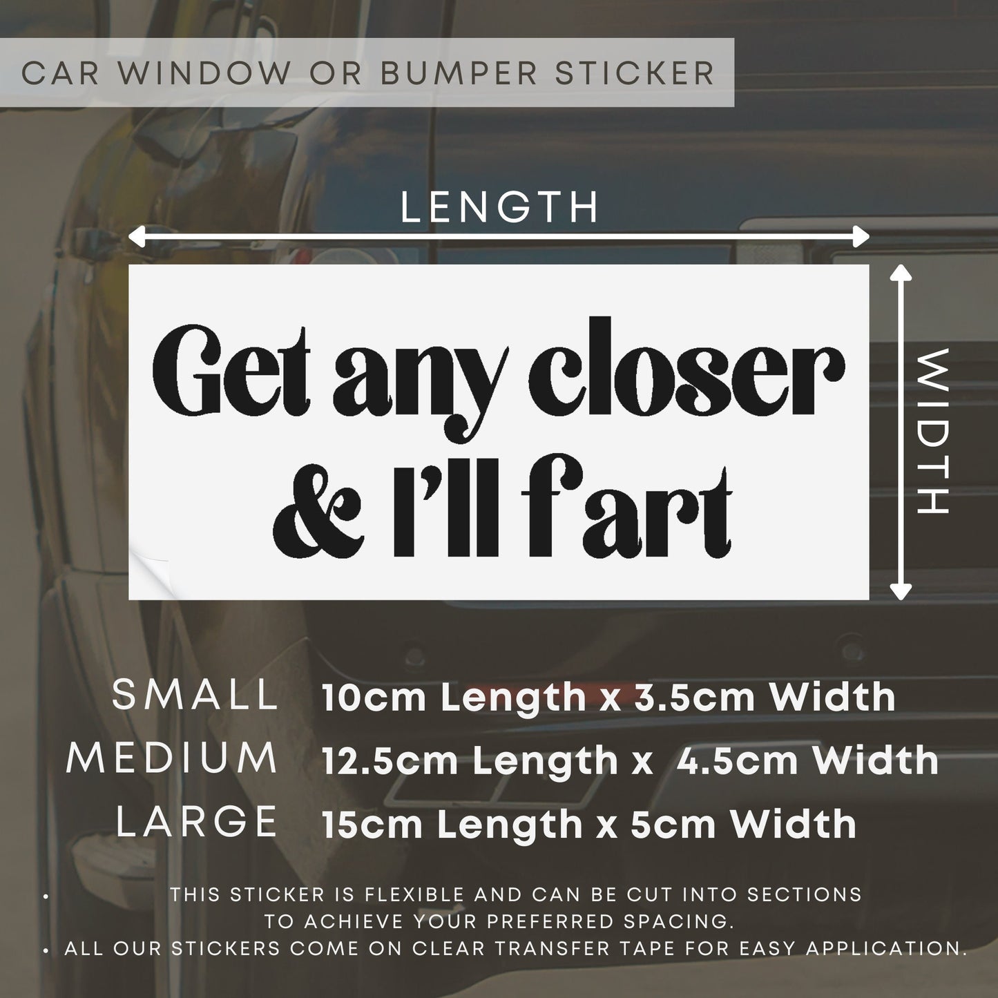 Drive safely and keep your distance, or you might just get a whiff of humour with our ‘Get any closer... I‘ll fart‘ funny car bumper sticker. This playful accessory is sure to bring a smile to fellow drivers on the road. Available in three sizes and a variety of colours, you can easily customise your vehicle with this light-hearted touch. Spread laughter wherever you go with this quirky and entertaining bumper sticker!