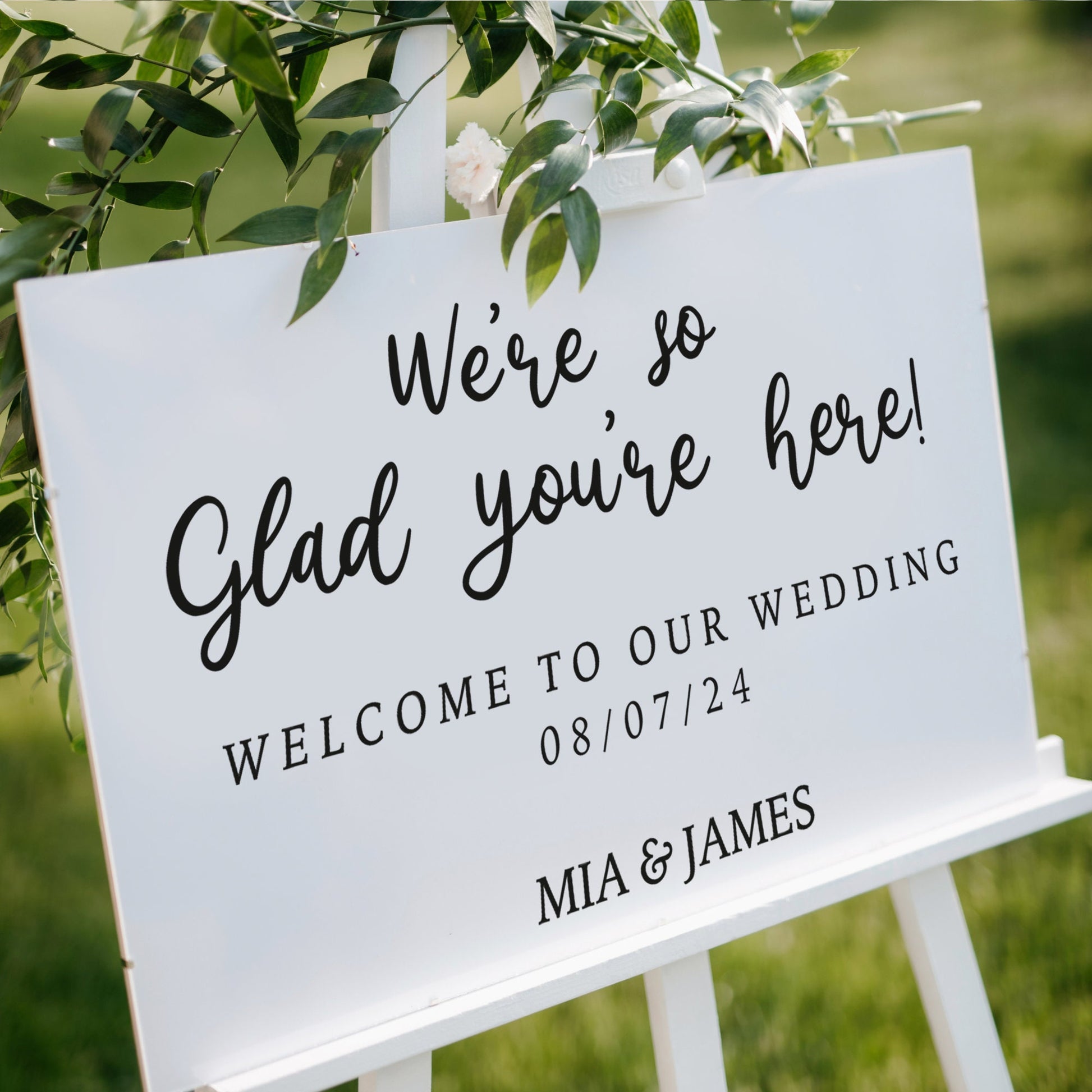 Glad You're Here - Beautiful Personalised Wedding Welcome Sign Vinyl Sticker For Board, Acrylic, Smooth Wood Or Mirror, Minimalist Decal