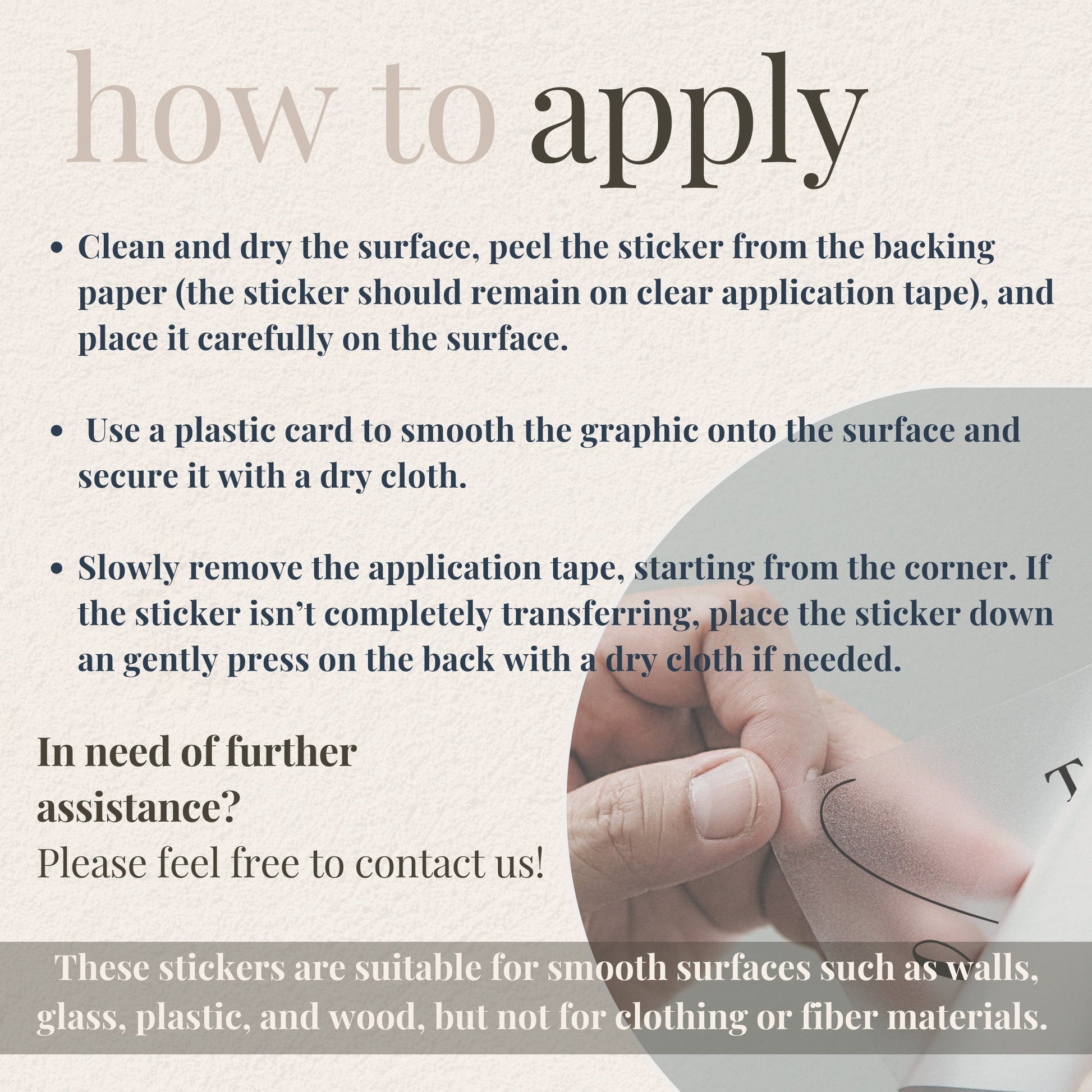 Apply on smooth clean surfaces such as a wall, glass, smooth plastics, and smooth wood. They are not suitable for clothing of fibre materials.