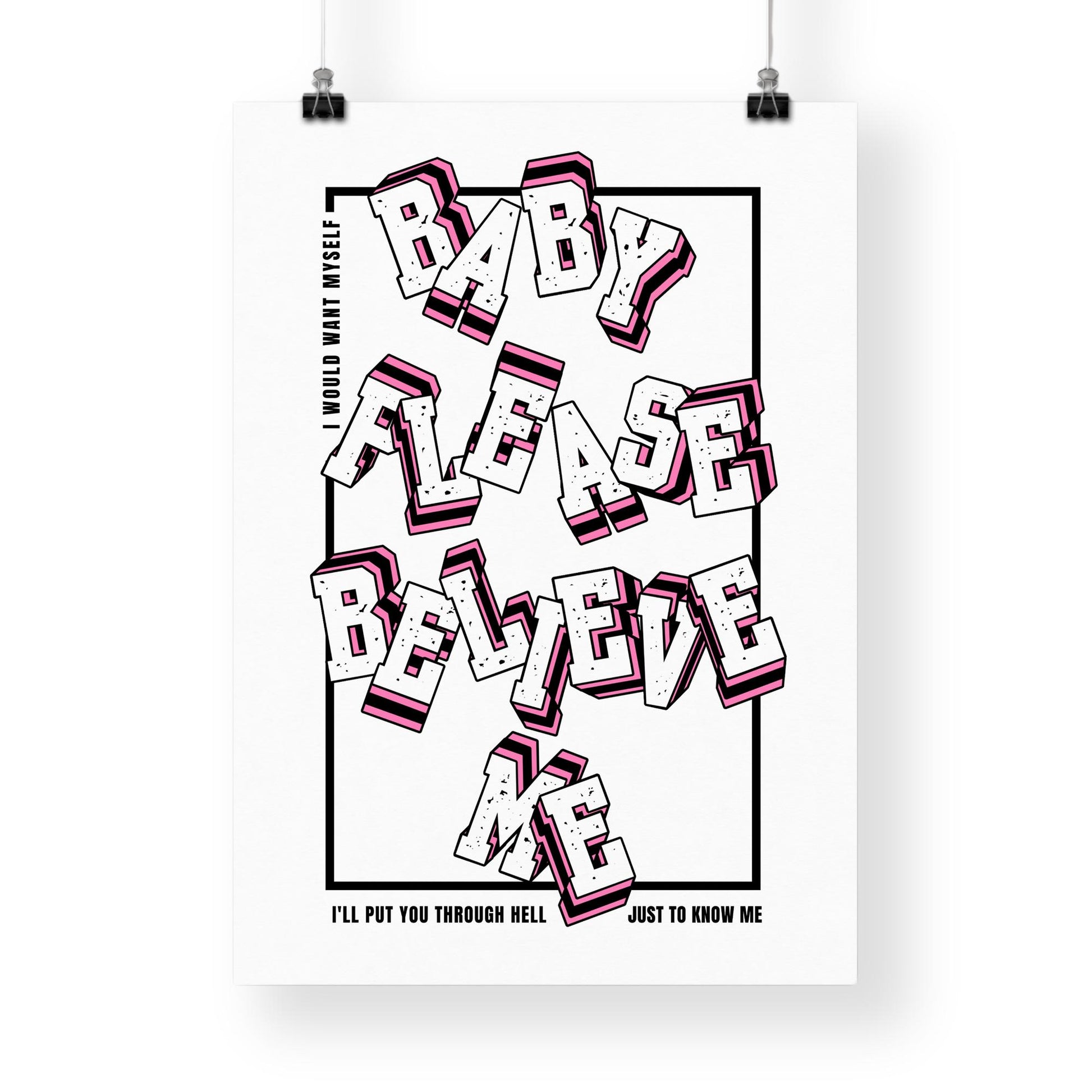 Greedy - Poster | "Baby Please Believe Me" | Black & Pink Typography Print Pop Lyric Poster for Music Lovers, Song Quote Home Decor