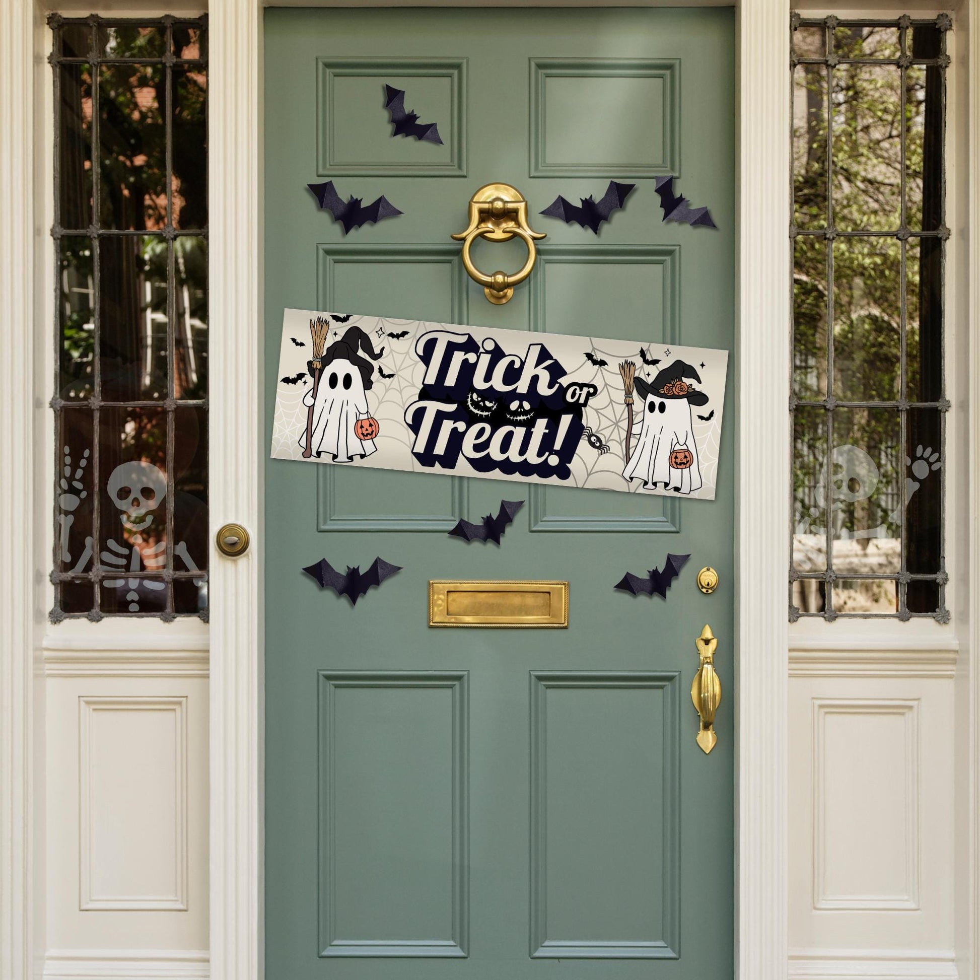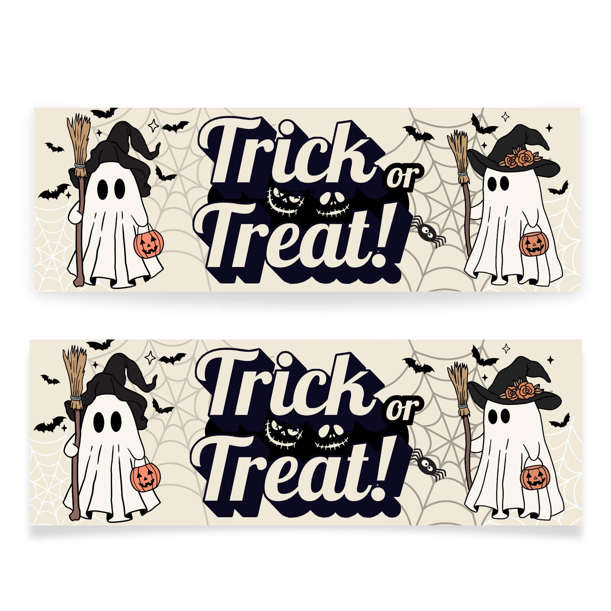 Bring spooky charm to your Halloween celebrations with this adorable Trick or Treat banner! Featuring two cute ghost characters dressed as witches, complete with broomsticks, pumpkins, bats, and spiderwebs, this playful design is perfect for welcoming trick-or-treaters or adding a festive touch to your party décor.