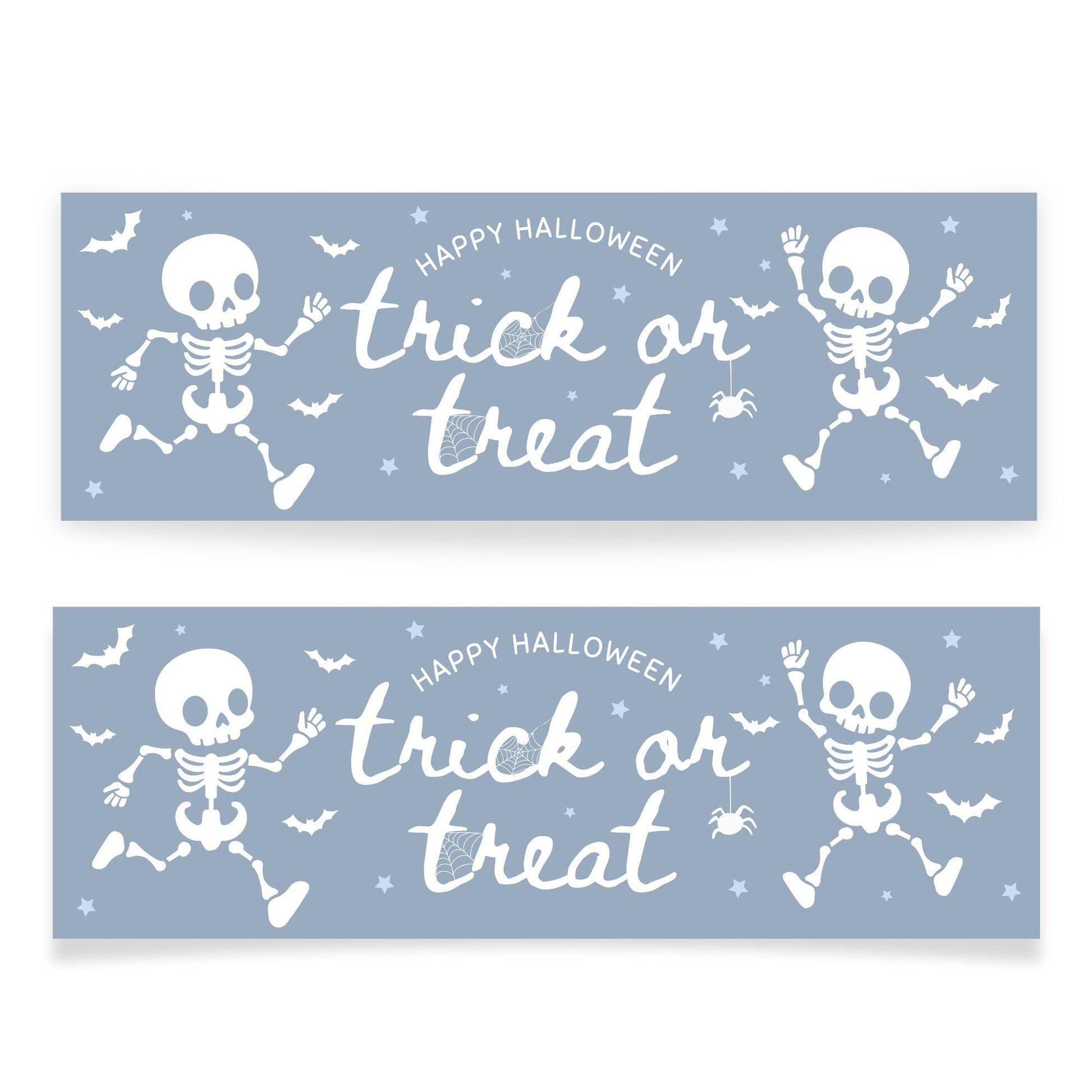 Get your home ready for spooky season with this fun and festive Halloween Trick or Treat Skeleton Banner! Featuring two adorable dancing skeletons surrounded by bats, stars, a spider, and the words "Happy Halloween Trick or Treat" in a playful script, this banner is the perfect way to welcome trick-or-treaters and party guests.