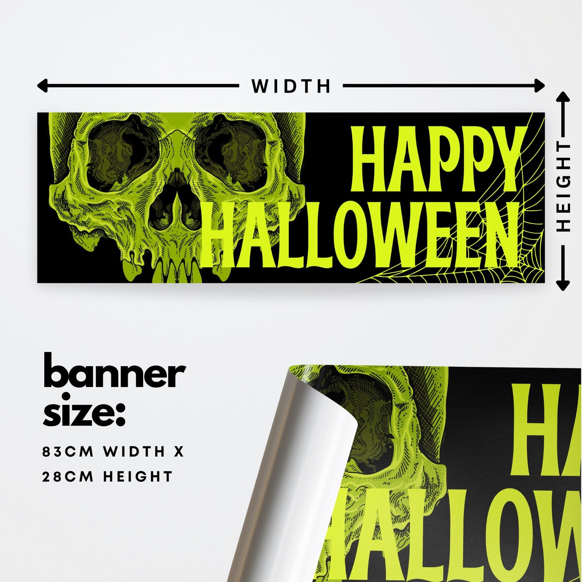 Create a bold and eerie focal point for your Halloween décor with this Green Skull Happy Halloween banner. Featuring a detailed neon-green skull illustration with striking spider web accents, this design is perfect for horror-themed parties, haunted houses, and spooky seasonal displays. Printed on premium gloss paper, it delivers sharp detail and vivid colour contrast. Measuring 83cm wide x 28cm high, it’s ideal for hanging on walls, over fireplaces, in doorways, or as part of a photo backdrop.