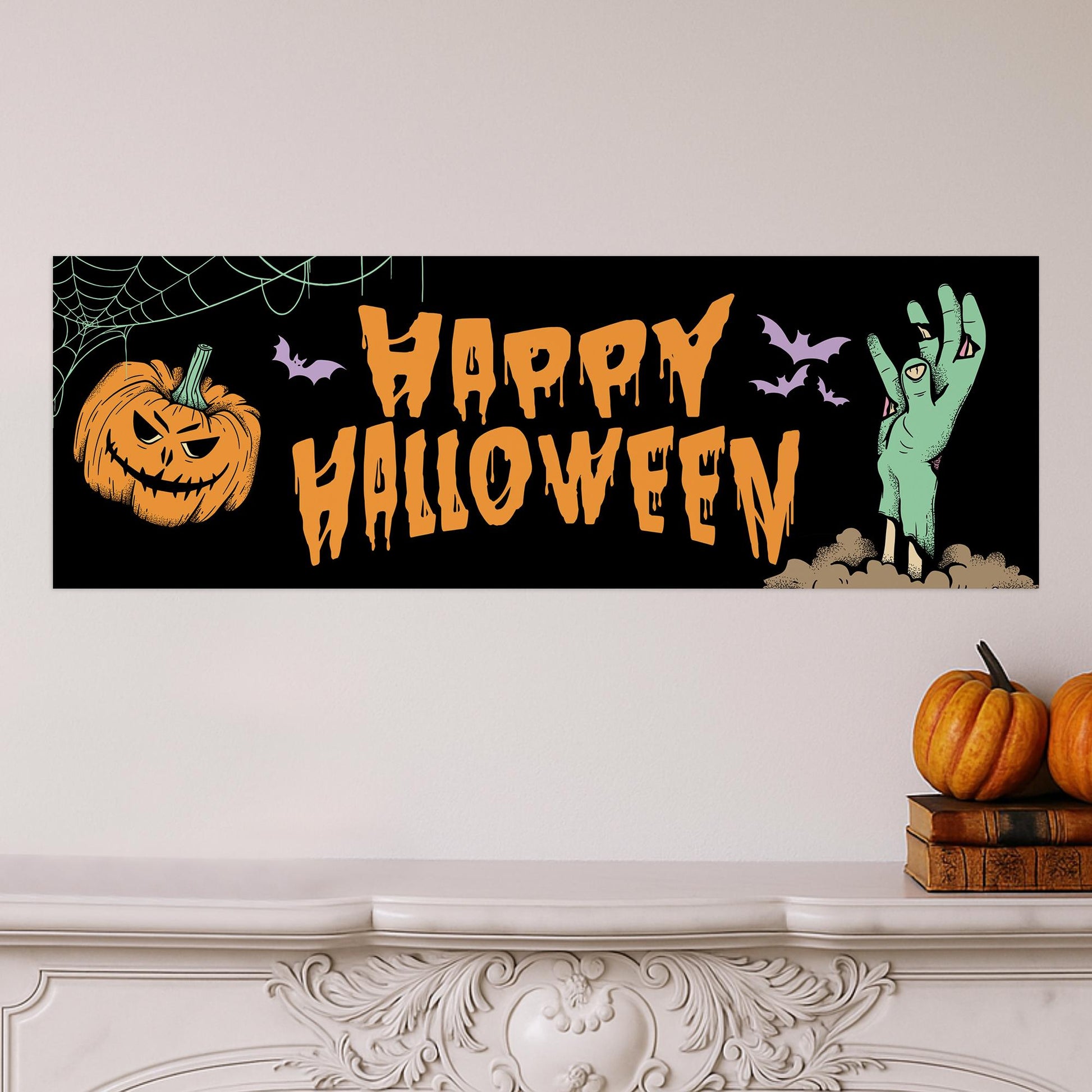Add a creepy yet colourful vibe to your Halloween décor with this Pumpkin & Zombie Hand Happy Halloween banner. Featuring a grinning pumpkin, a green zombie hand bursting from the ground, purple bats, and spider web details, it’s the perfect mix of spooky and fun. Printed on premium gloss paper, the colours are bold and eye-catching, while the smooth finish makes it ideal for party backdrops and seasonal displays. Measuring 83cm wide x 28cm high, it’s the perfect size for walls, fireplaces, doorways, or photo booth backgrounds.
