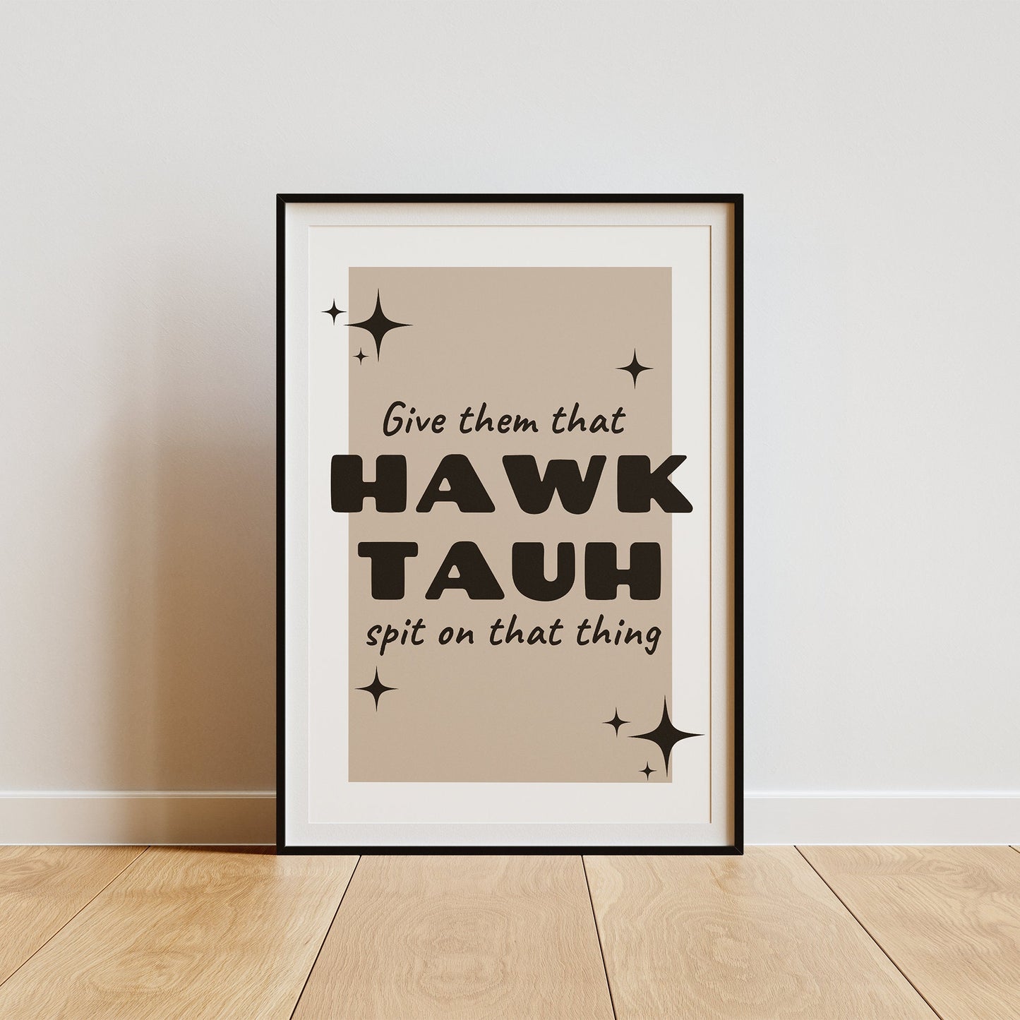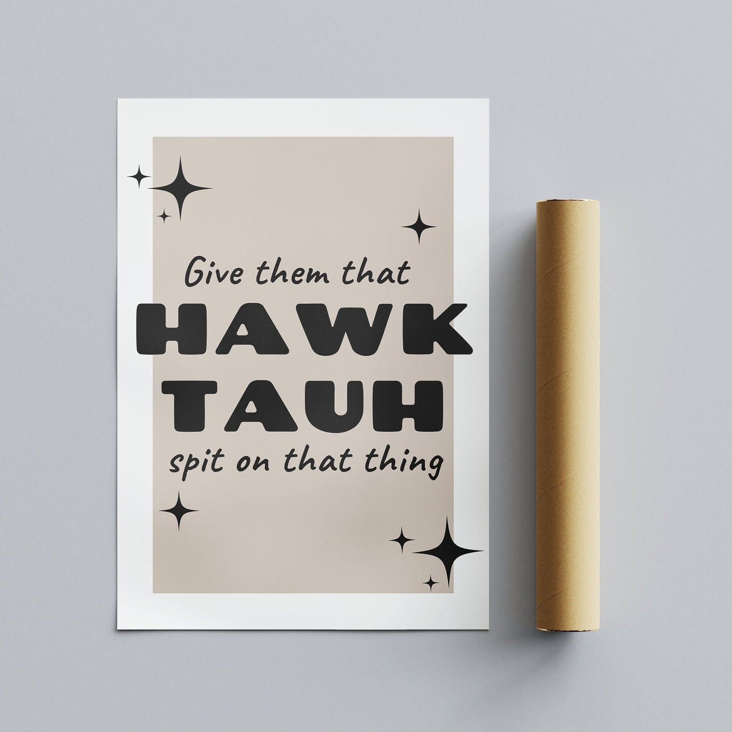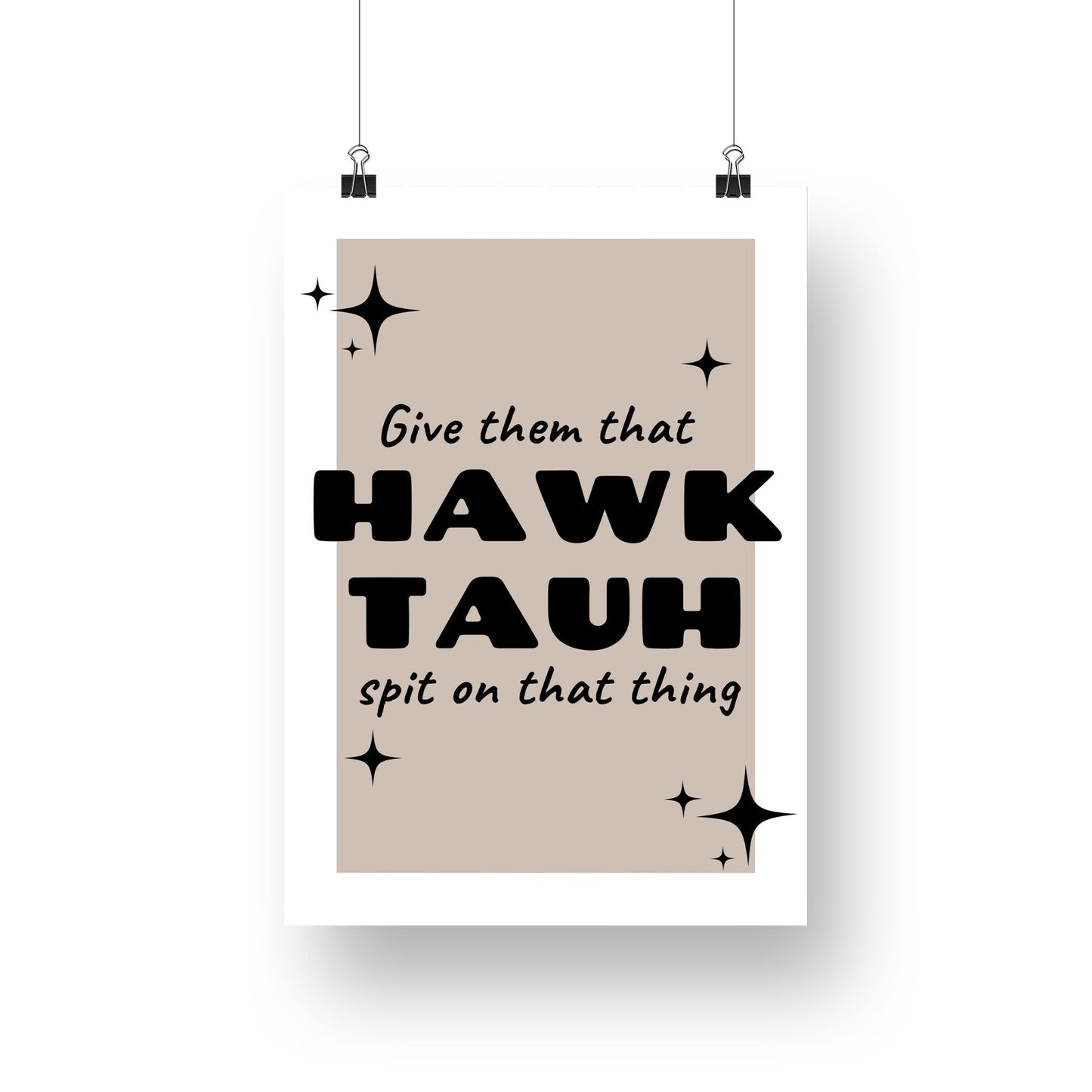 Add a touch of humour and personality to your space with our "Give Them That Hawk Tauh and Spit On That Thing" poster. This playful and quirky piece of wall art is perfect for those who appreciate a good laugh and love to showcase their unique sense of style.