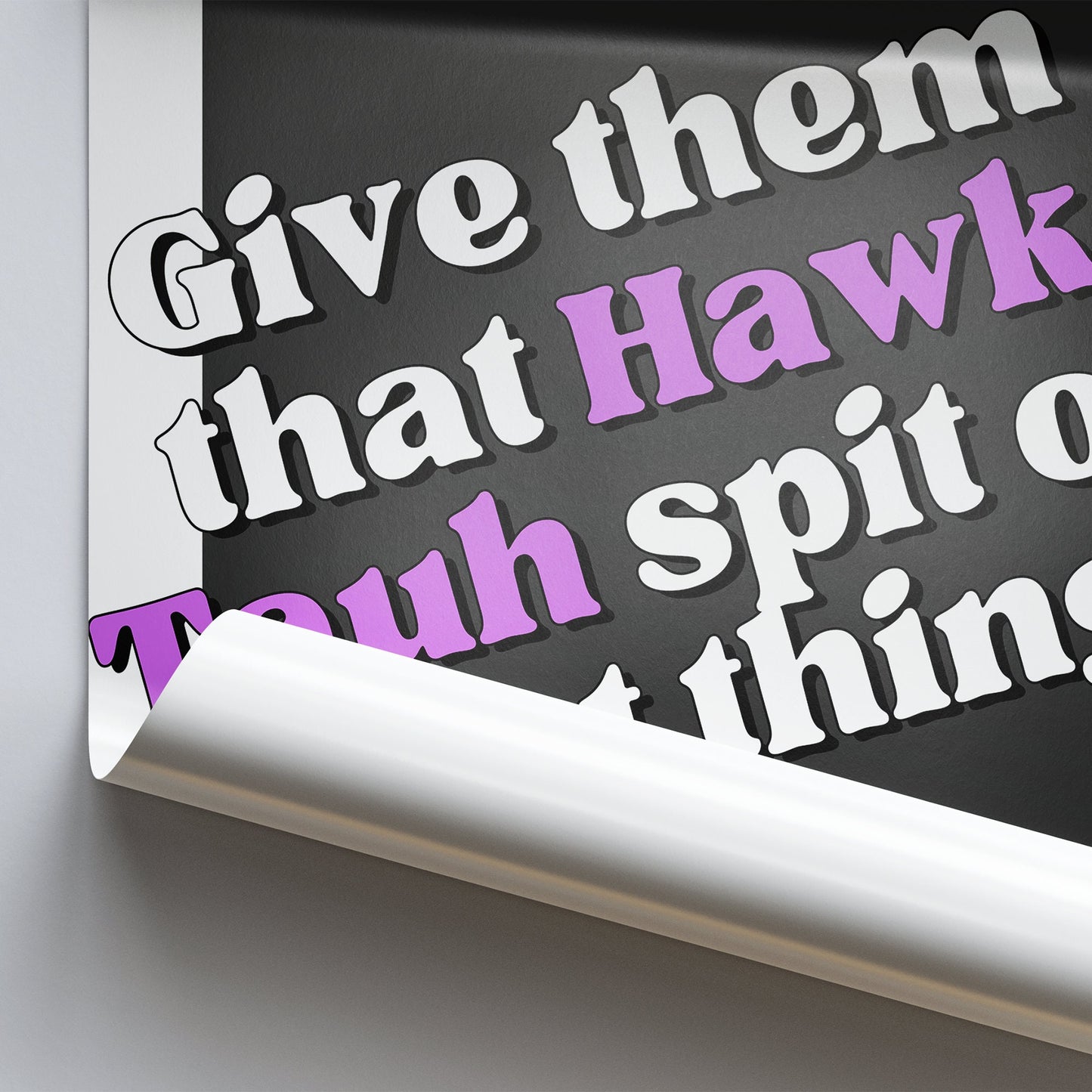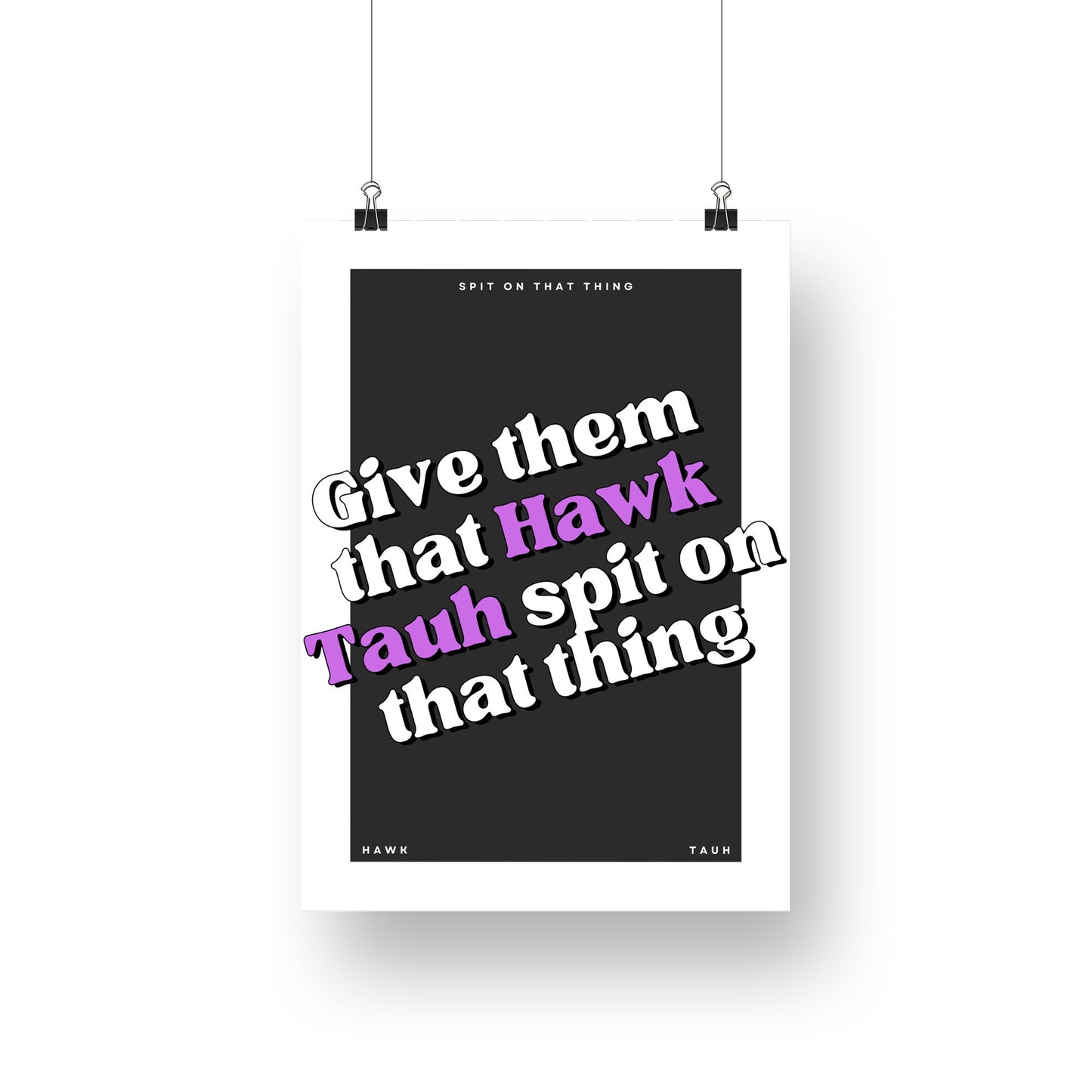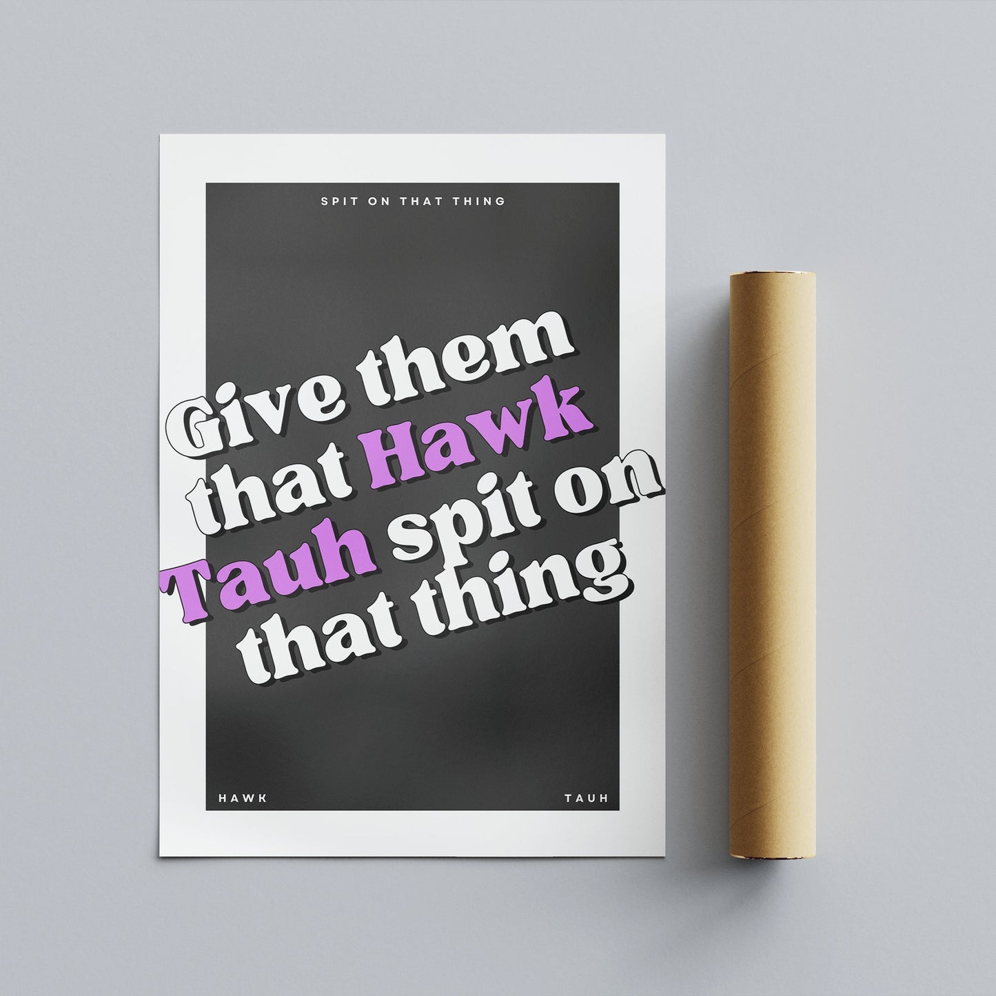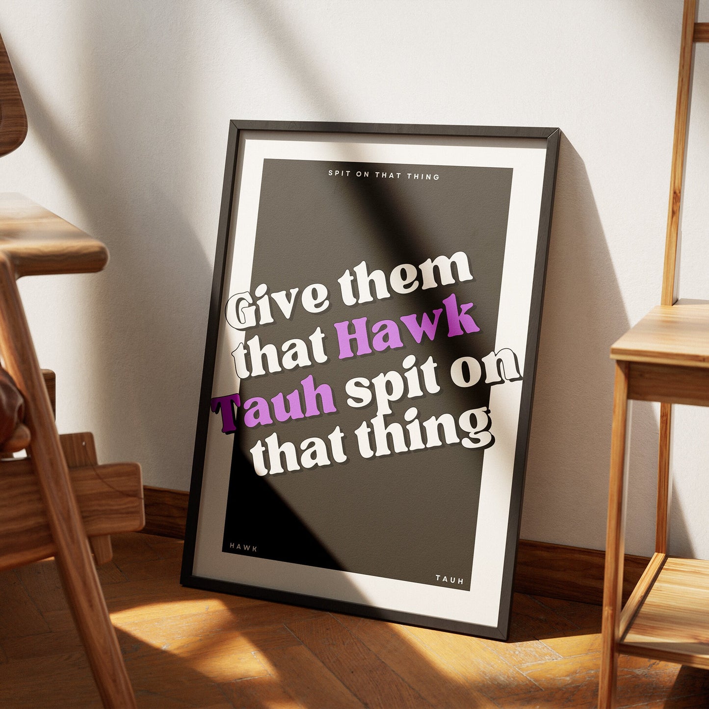 Add a touch of humour and personality to your space with our "Give Them That Hawk Tauh and Spit On That Thing" poster. This playful and quirky piece of wall art is perfect for those who appreciate a good laugh and love to showcase their unique sense of style.