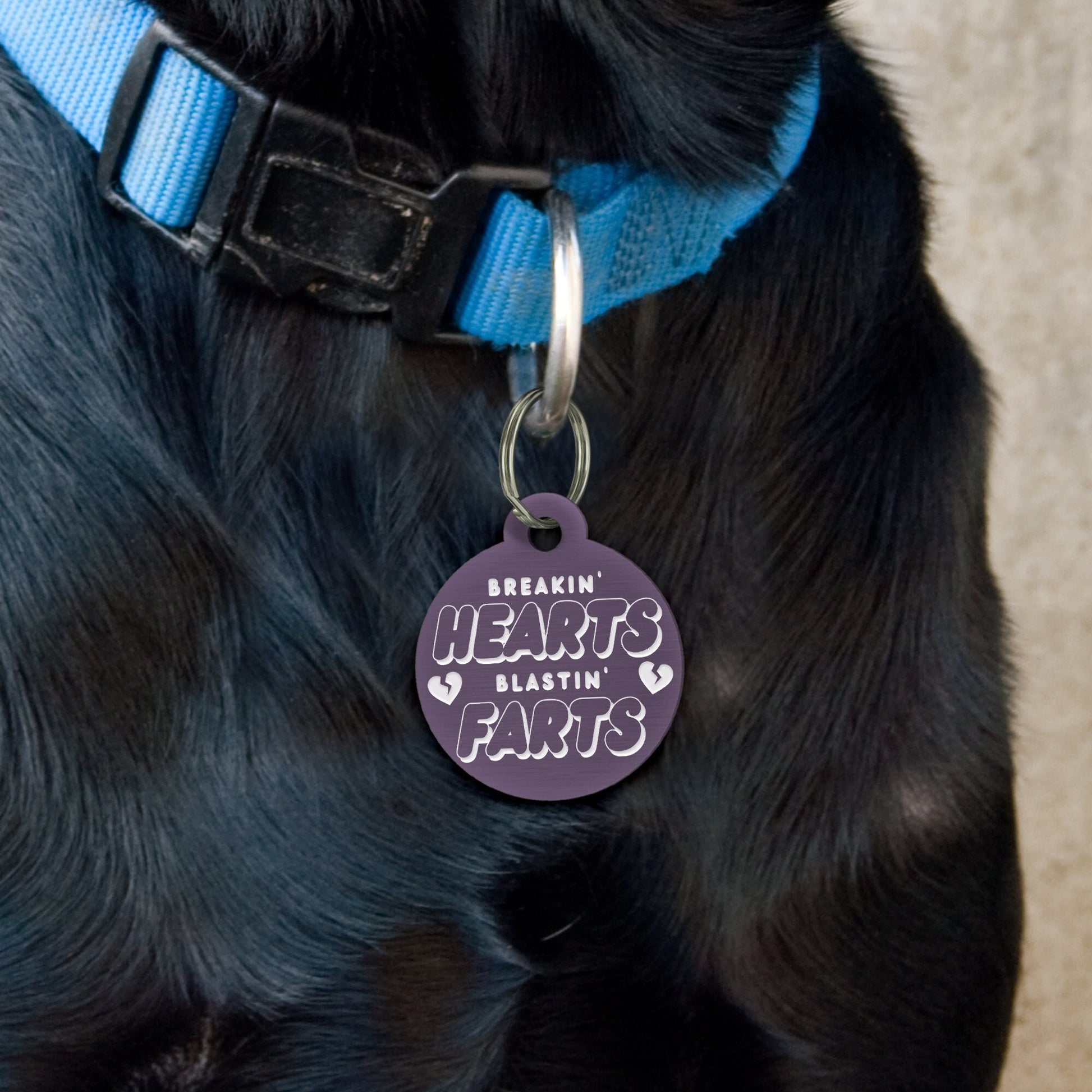 Give your furry friend a hilarious and stylish accessory with our coloured metal round dog tag that reads "Breakin‘ Hearts, Blastin‘ Farts." Perfect for pet owners who love to showcase their pet‘s playful personality, this custom pet ID tag is both functional and fun. Made from durable metal and available in various vibrant colours, this tag is sure to make your pet stand out.