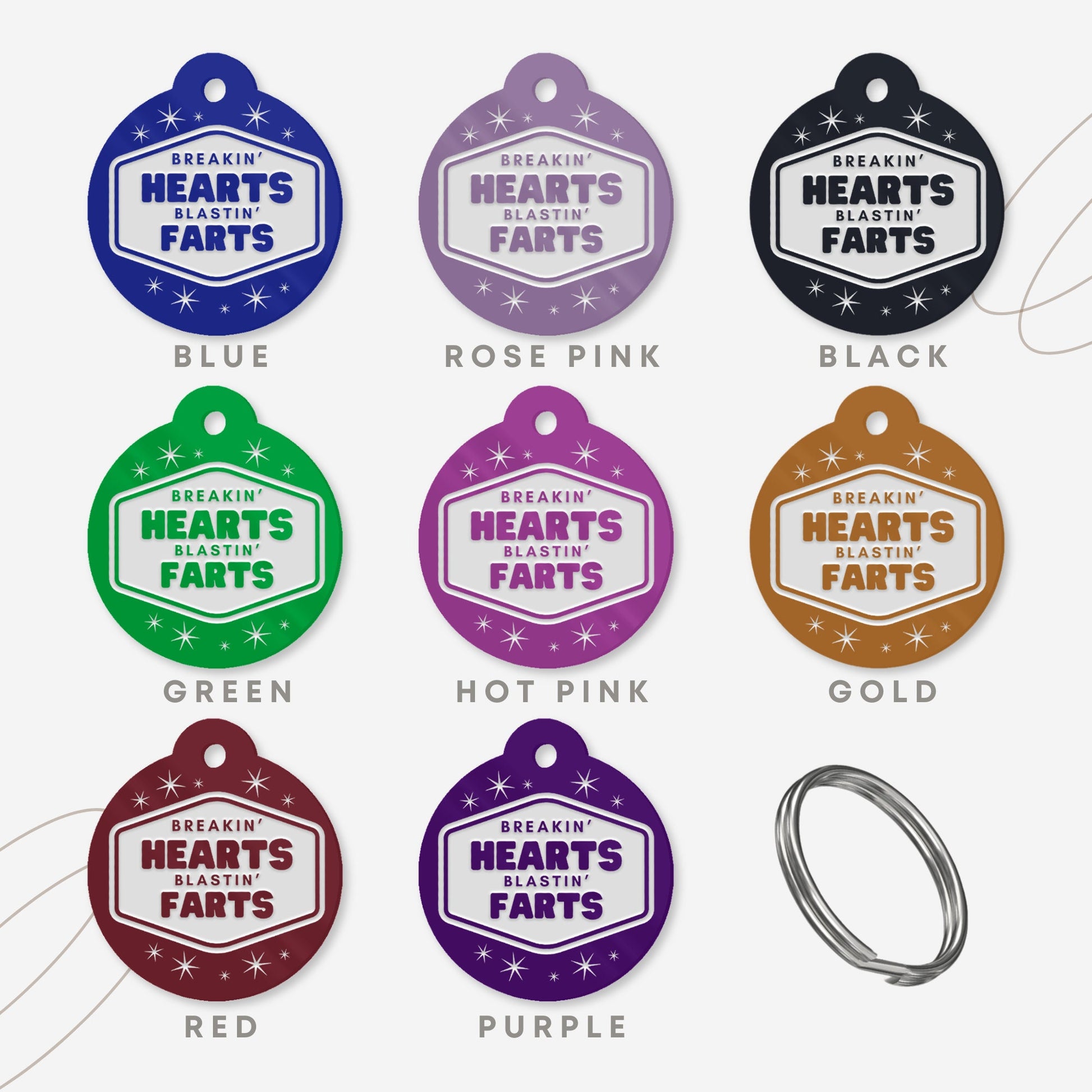 Give your furry friend a hilarious and stylish accessory with our coloured metal round dog tag that reads "Breakin‘ Hearts, Blastin‘ Farts." Perfect for pet owners who love to showcase their pet‘s playful personality, this custom pet ID tag is both functional and fun. Made from durable metal and available in various vibrant colours, this tag is sure to make your pet stand out.
