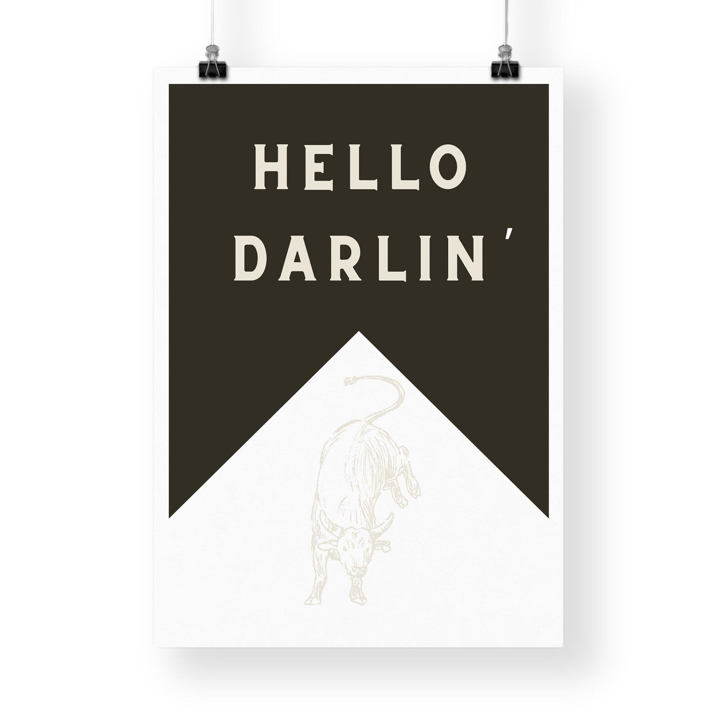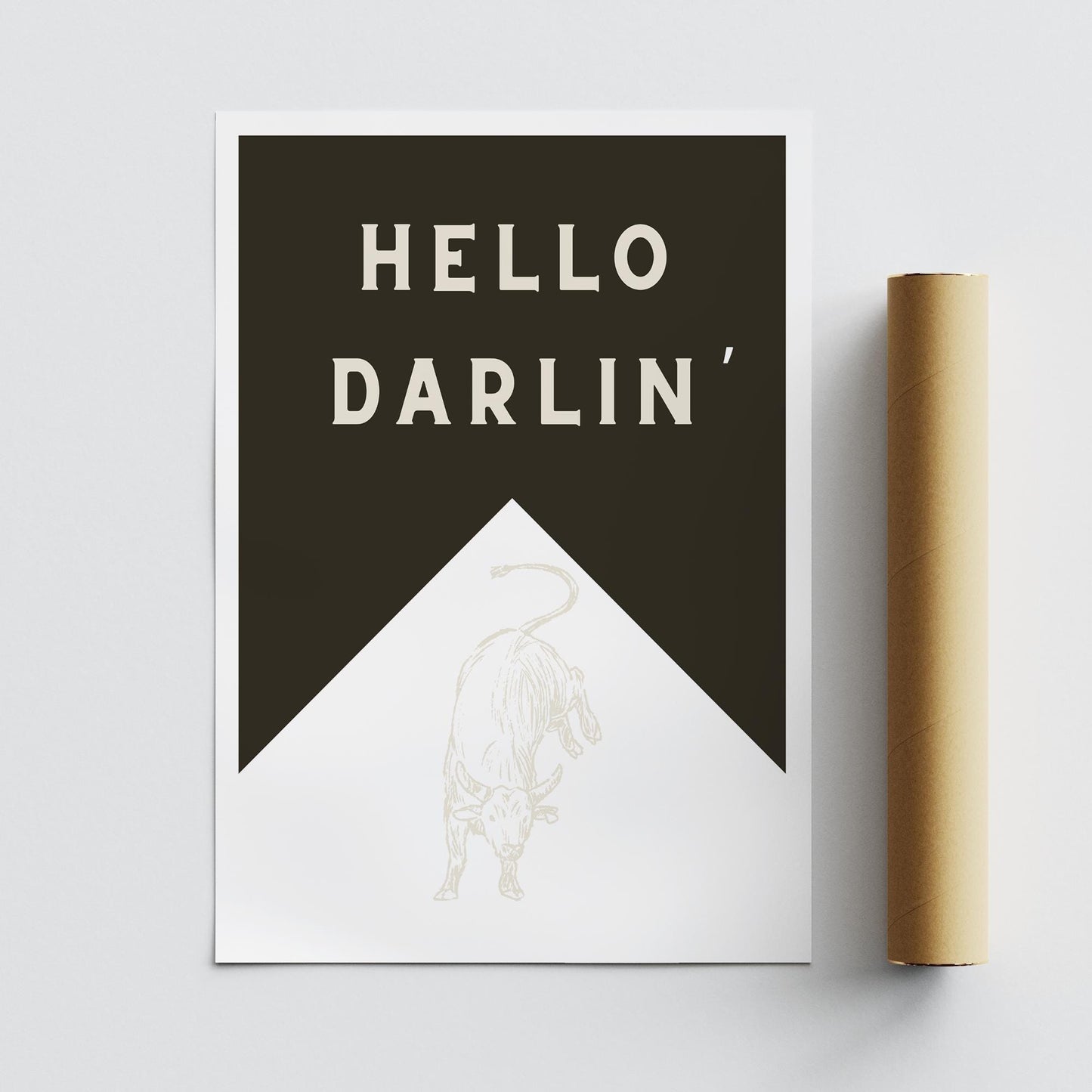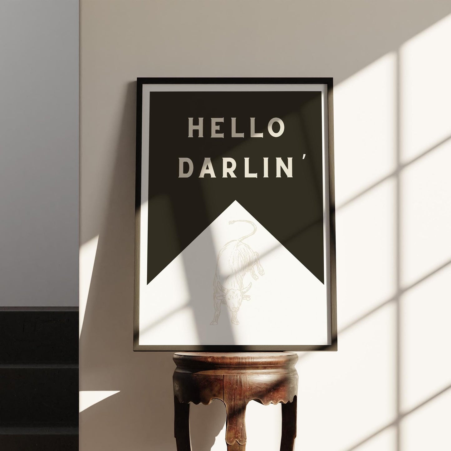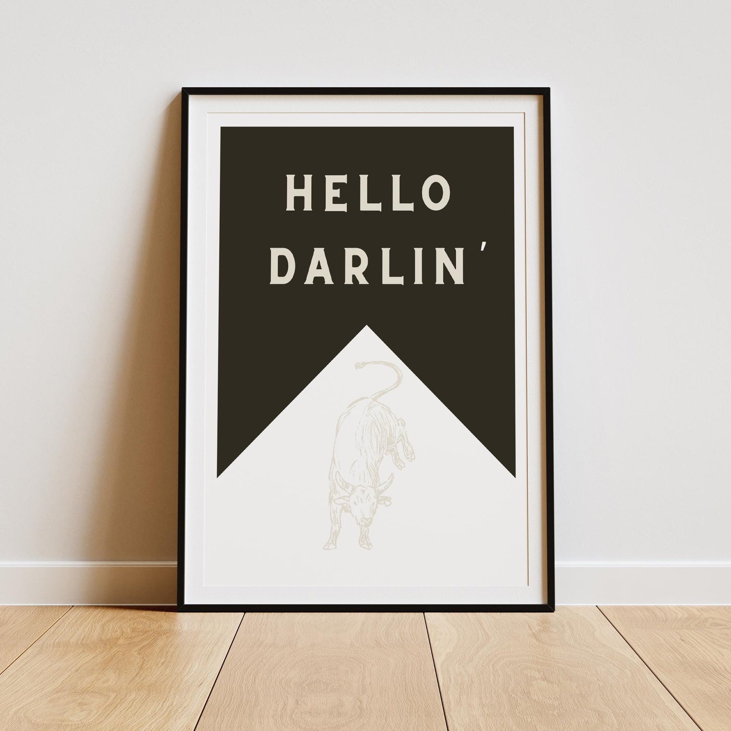 Add a touch of rustic charm to your space with this "Hello Darlin‘" Western-style poster. Featuring a bold, vintage-inspired design with a subtle bull illustration, this art print captures the essence of farmhouse and cowboy culture. The deep earth tones and classic typography make it a perfect addition to any living room, entryway, or home office. Whether you‘re looking to enhance your country decor or bring a bit of the Wild West into your home, this poster is an ideal choice for creating a warm and welcoming atmosphere.