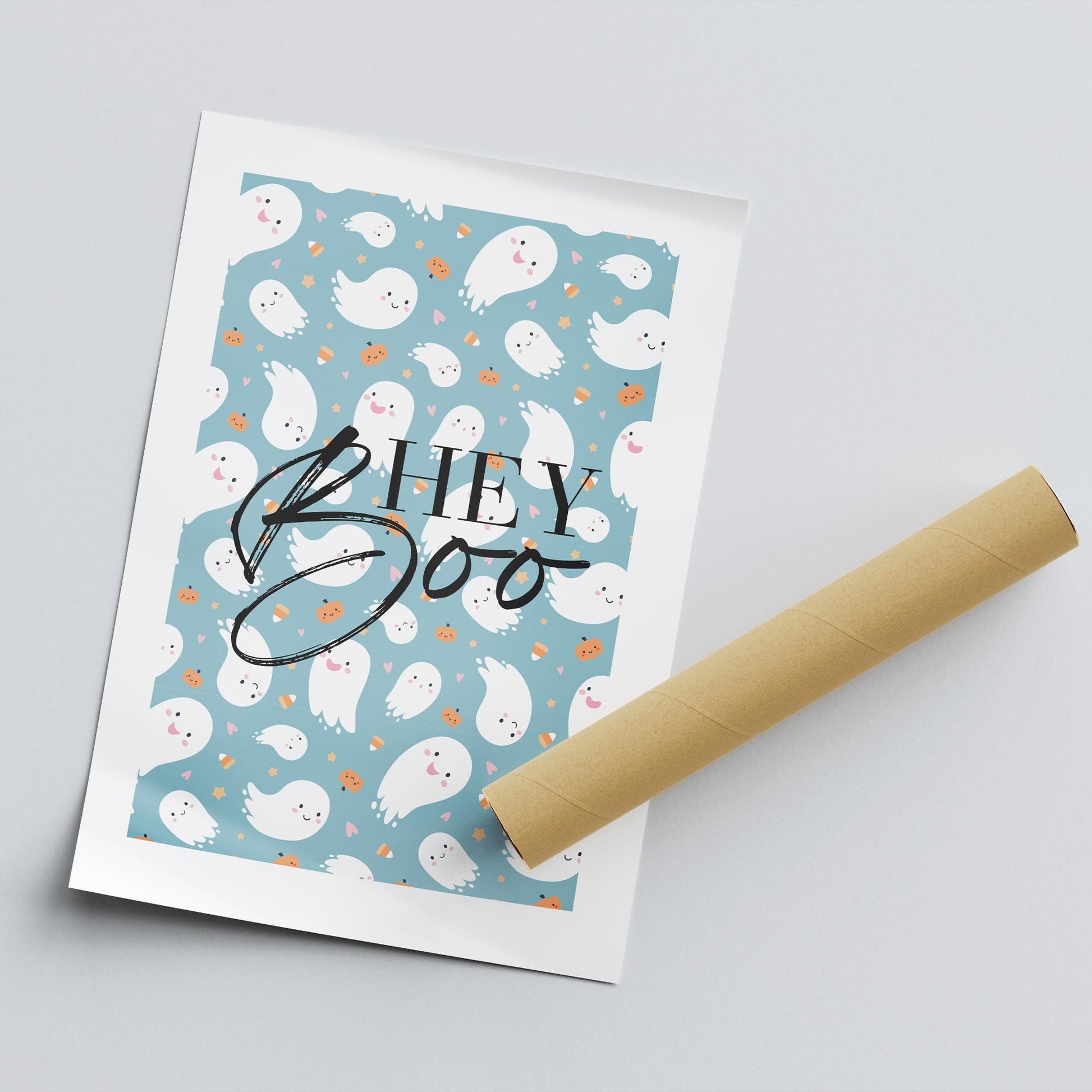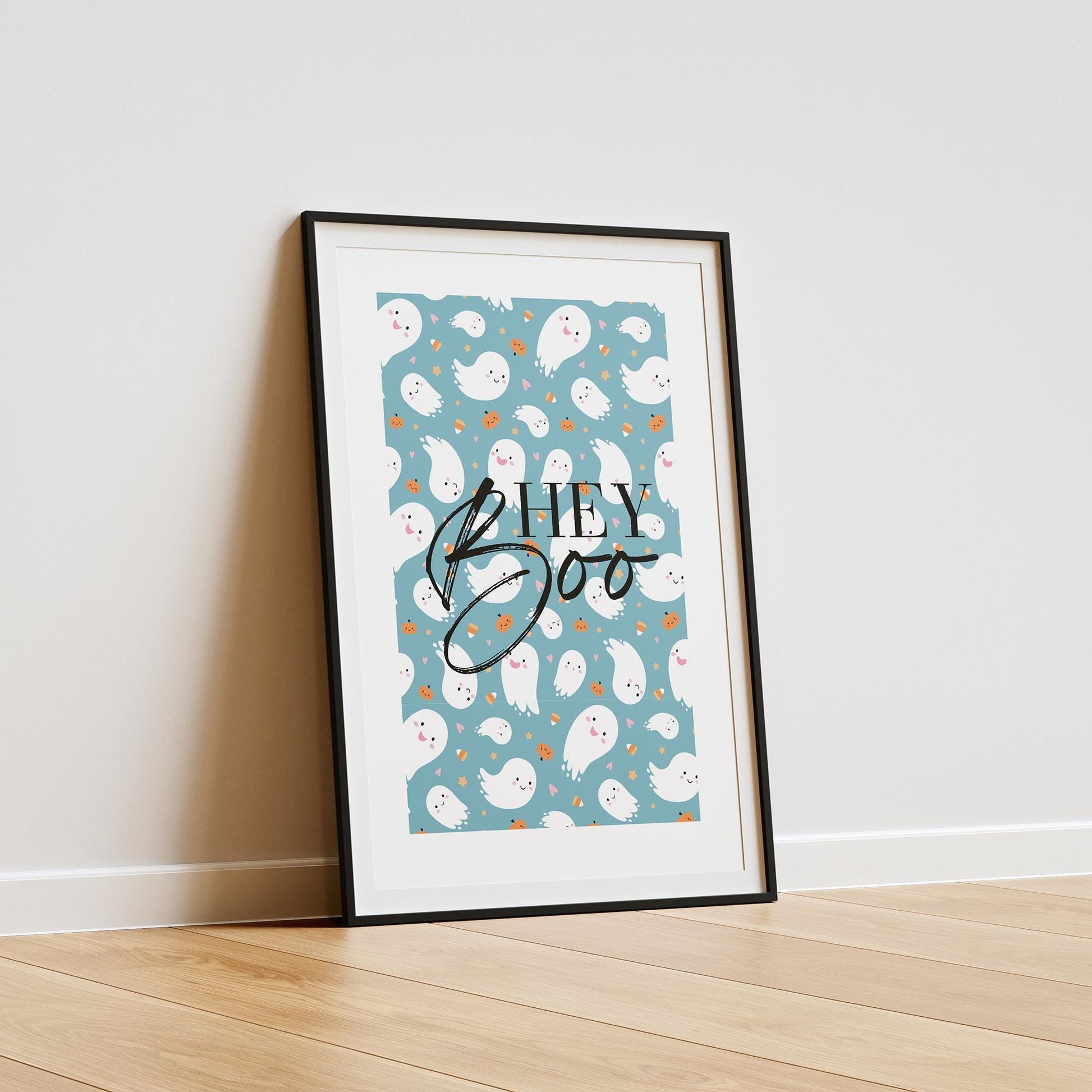 Hey Boo - Blue Ghost Poster: Seasonal Decor, Fall Wall Art, Spooky Vibes Print, Halloween Poster, Autumnal Home Decor Gift, Cute Ghost