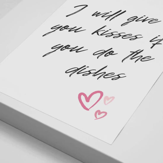 Brighten up your kitchen with a touch of humour and affection with our "I Will Give You Kisses if You Do the Dishes" poster. This charming and playful design is perfect for adding a bit of warmth and motivation to one of the most essential tasks in any household.