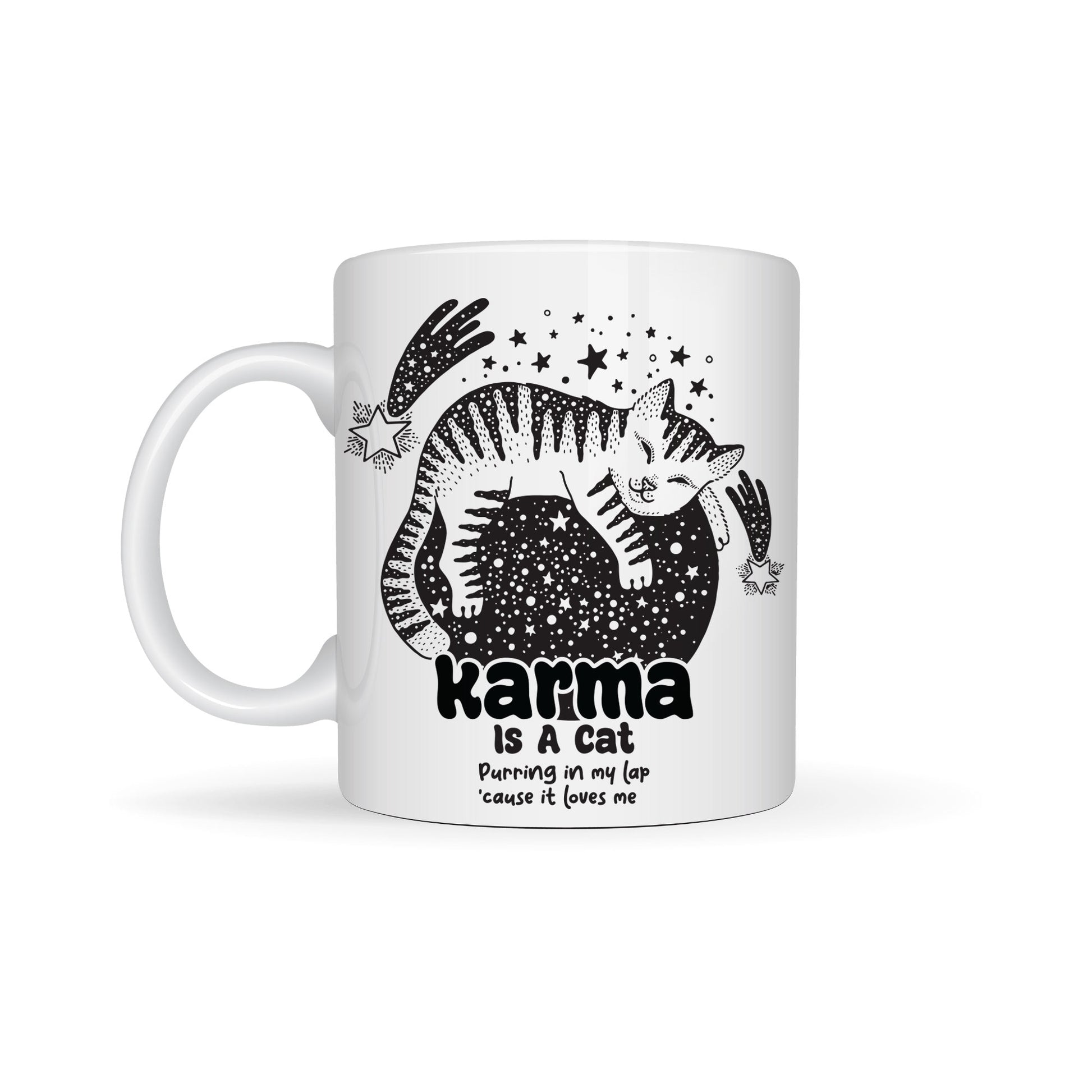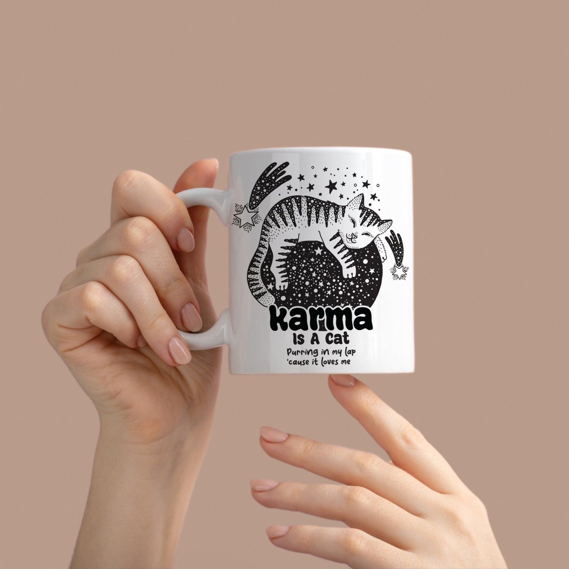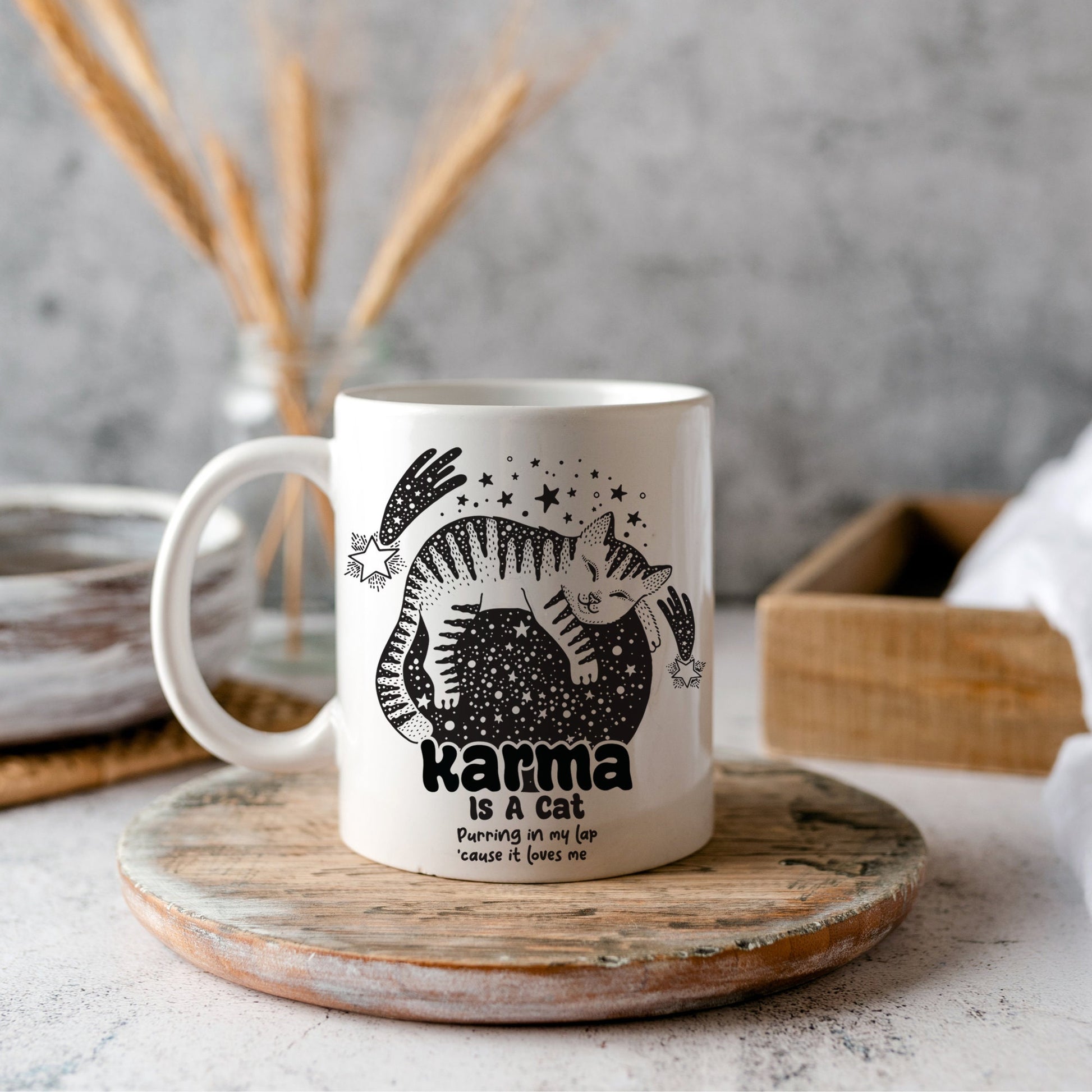 Crafted with love and attention to detail, this ceramic masterpiece features a sleek design adorned with a delightful illustration of a mischievous cat, embodying the essence of karma in its every whisker. Whether you‘re sipping your morning coffee or indulging in an evening tea, let this mug serve as a reminder that what goes around, comes around - just like the playful antics of our feline friends.