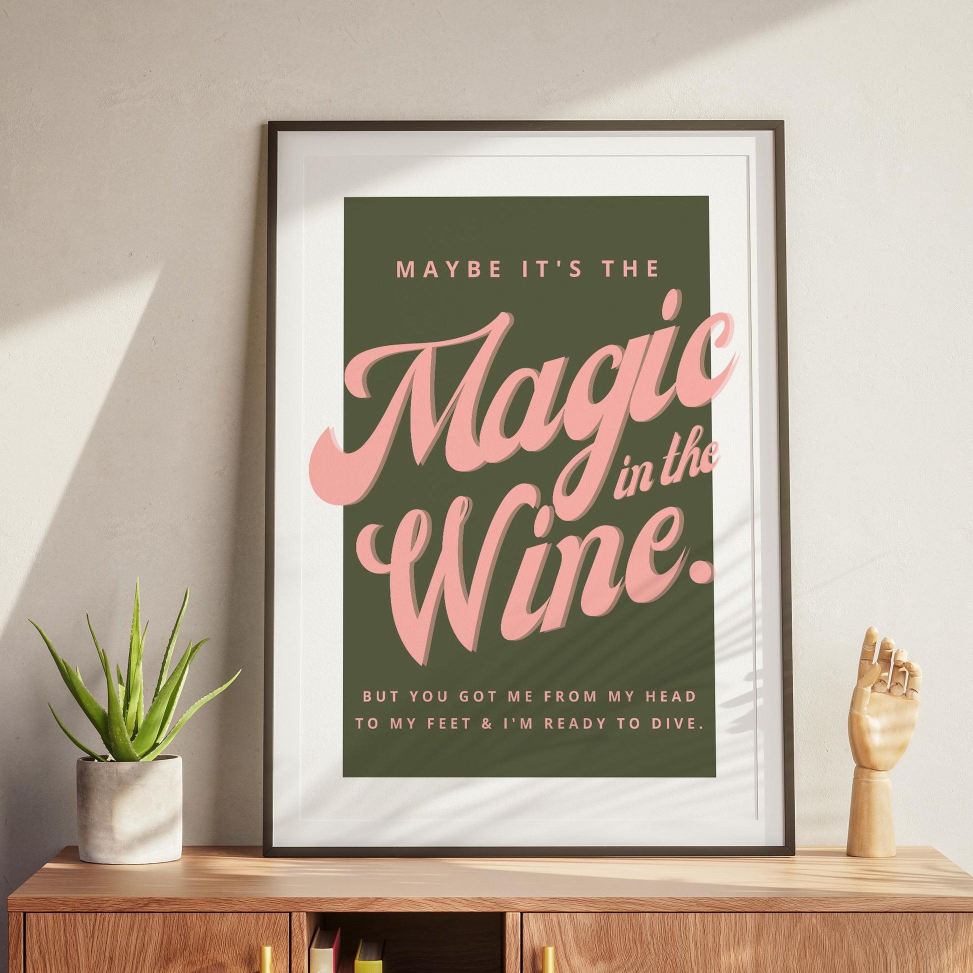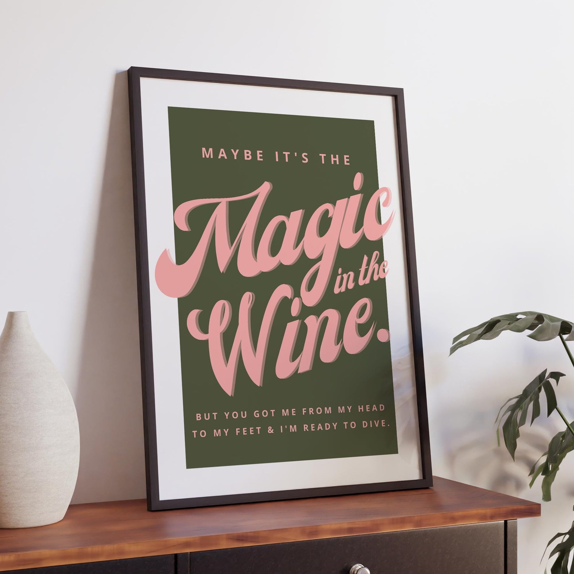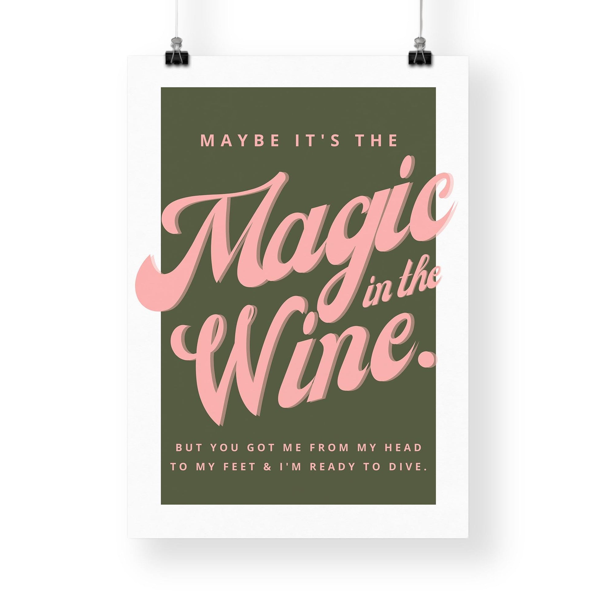 Playful and retro, this poster combines the lyric “Maybe it’s the magic in the wine” with bold pink typography on a deep green background. Perfect for fans of soulful music and statement design, it’s a vibrant piece that adds personality to any room. Printed on premium gloss paper, this print is as durable as it is eye-catching.