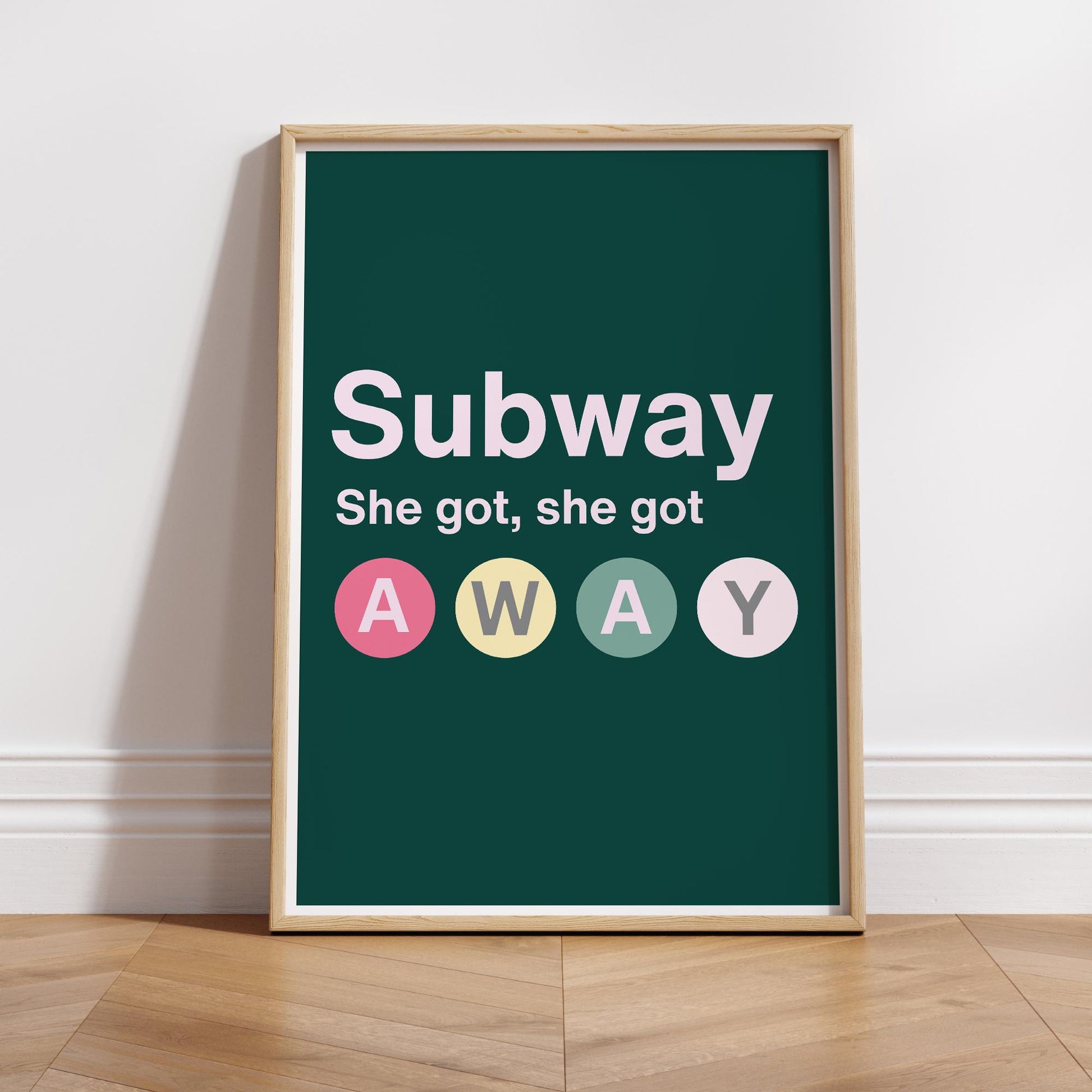 Bring a splash of style and wit to your walls with this lyric-inspired “Subway – She Got Away” poster. Designed with a deep green background, bold typography, and colourful subway-style lettering, it’s a playful nod to music and city life. Perfect for fans of modern design, urban culture, and clever lyric art, this print makes a striking statement in any bedroom, living room, office, or creative space. Printed on premium gloss paper, the vibrant colours and crisp details are sure to stand out. Available in sizes A5, A4, A3, A2, and A1 to suit your space – frame it your way for a personalised touch.