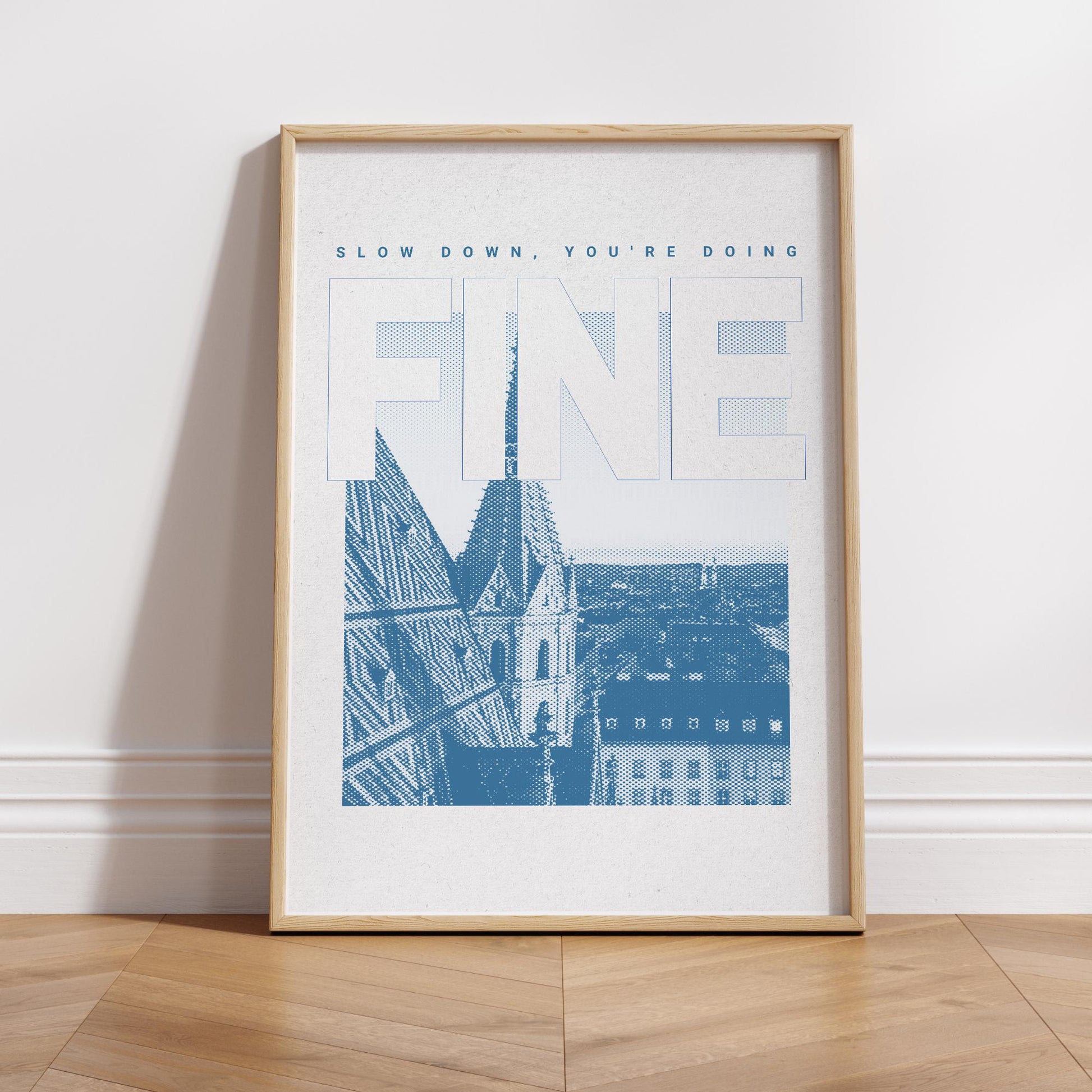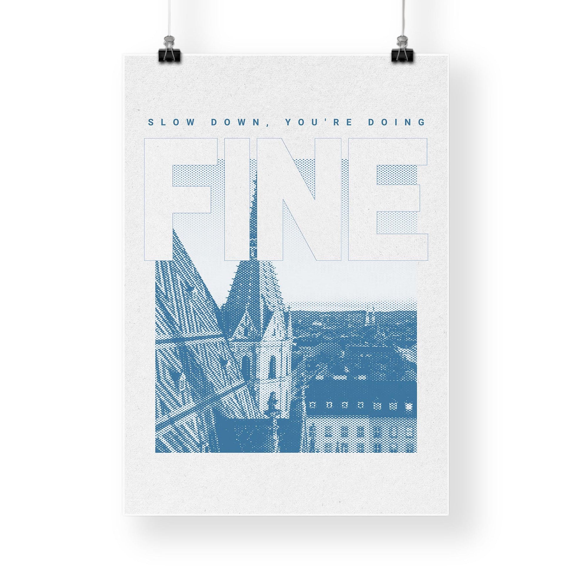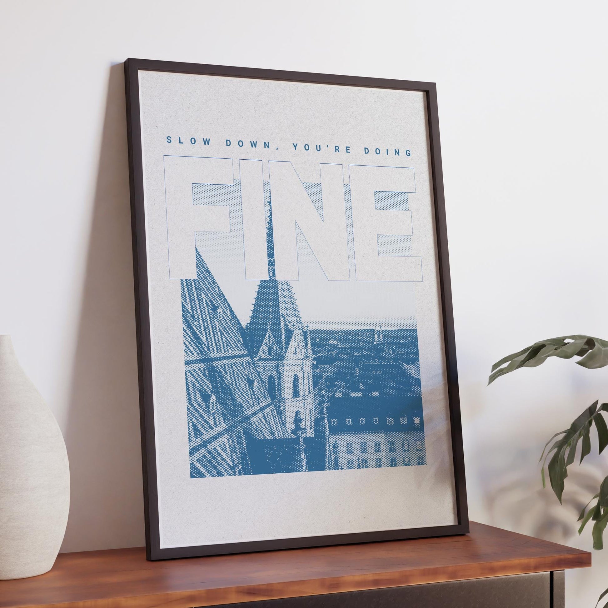 This lyric-inspired poster brings timeless words to life: “Slow Down, You’re Doing Fine.” Designed with a halftone-style city skyline and bold typography, it’s a modern, motivational art print for any wall. Perfect for those who love lyric posters, inspirational artwork, or thoughtful home decor.