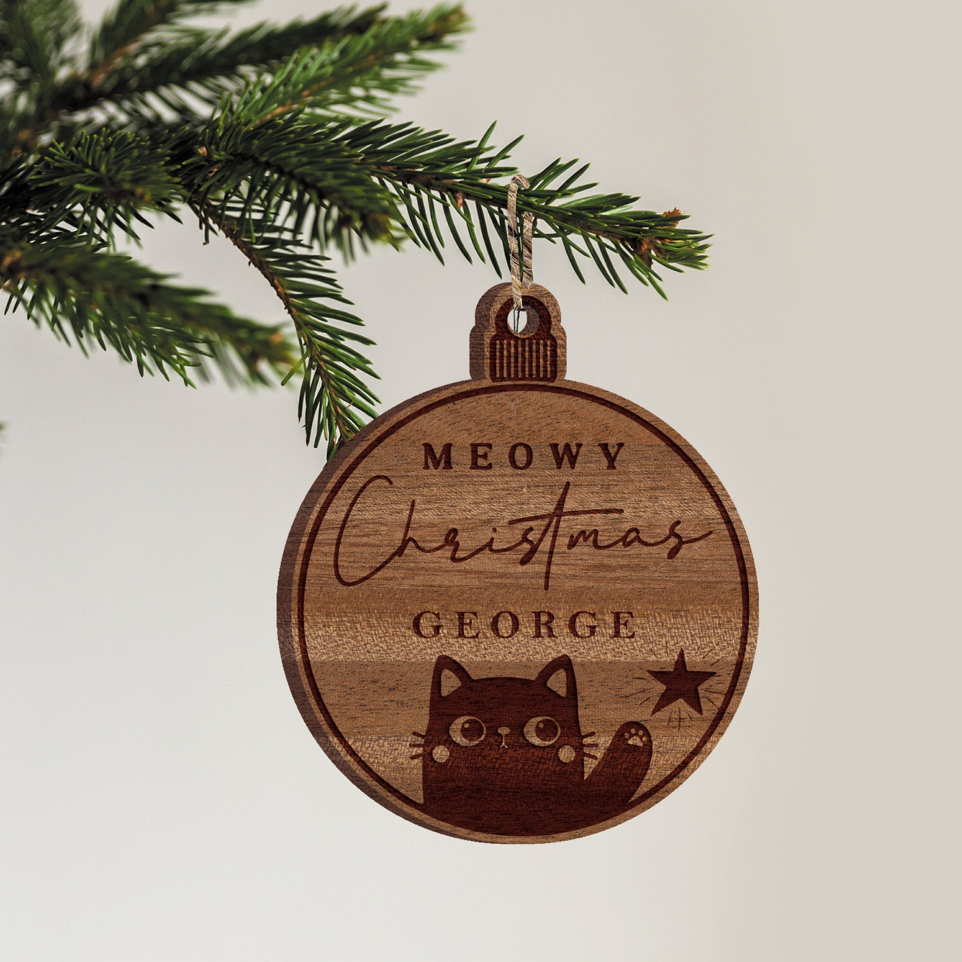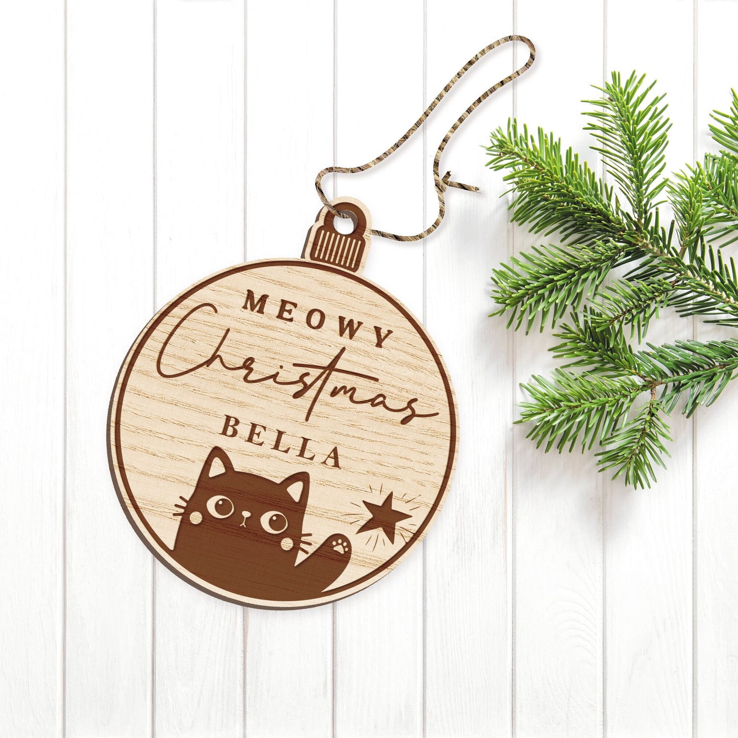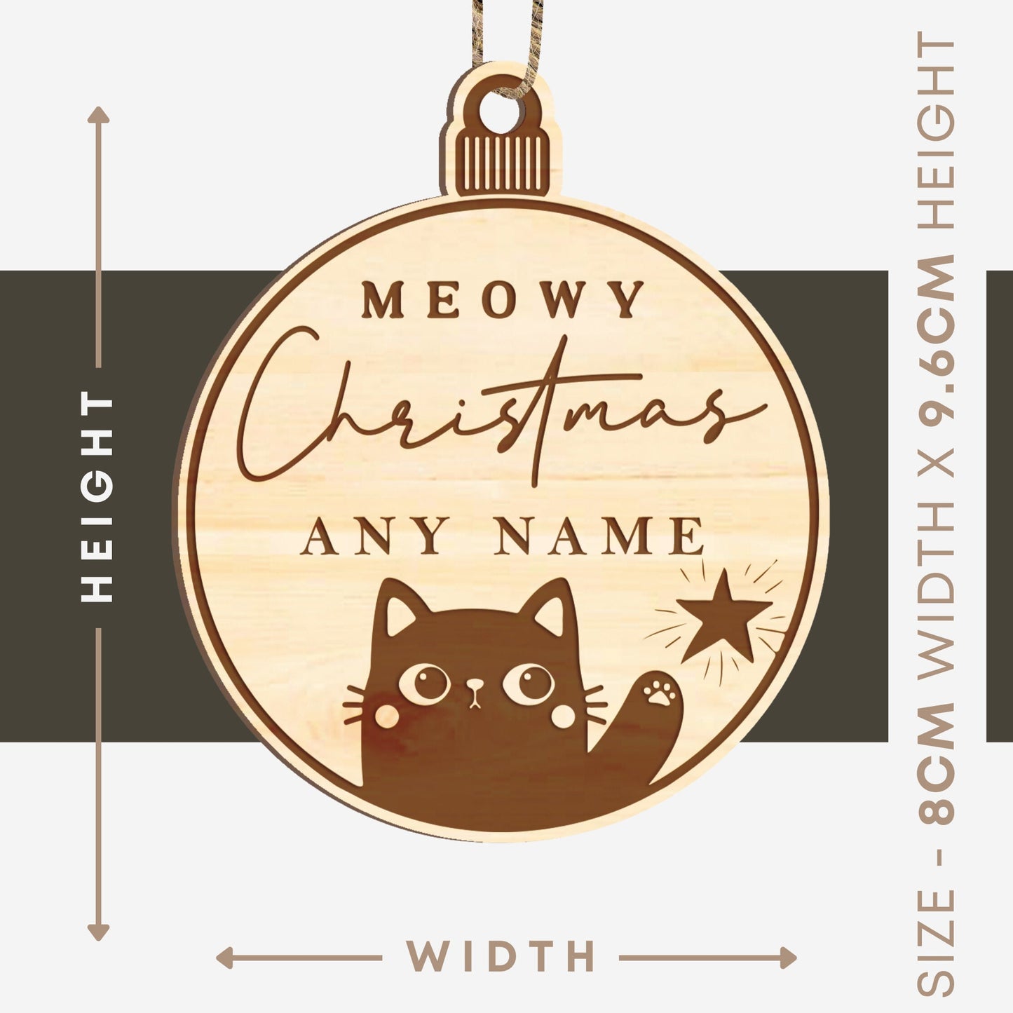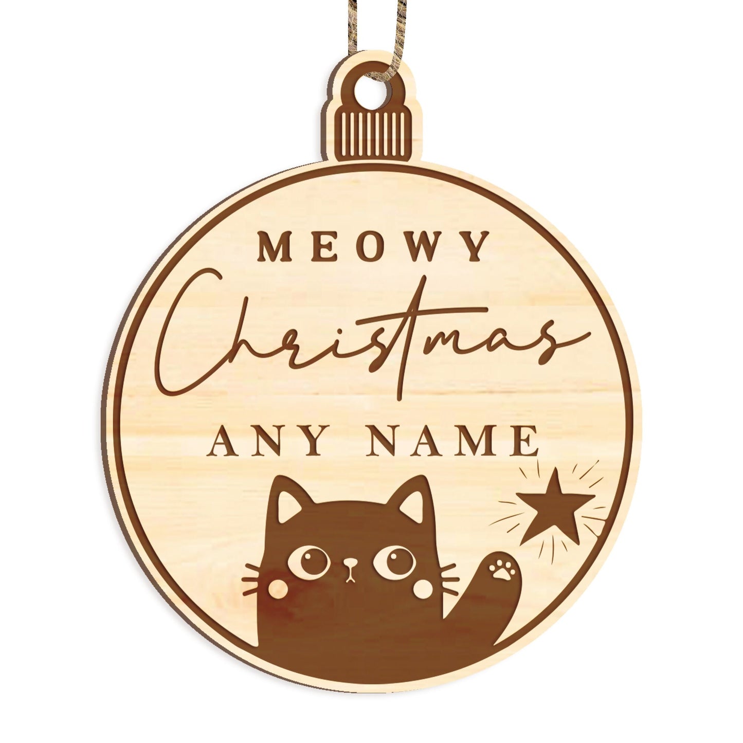 Meowy Christmas Ornament - Custom Cat Themed Xmas Decor Gift, Personalised Name, Cat Christmas Tree Decor, Wood Xmas Bauble Decoration Gift